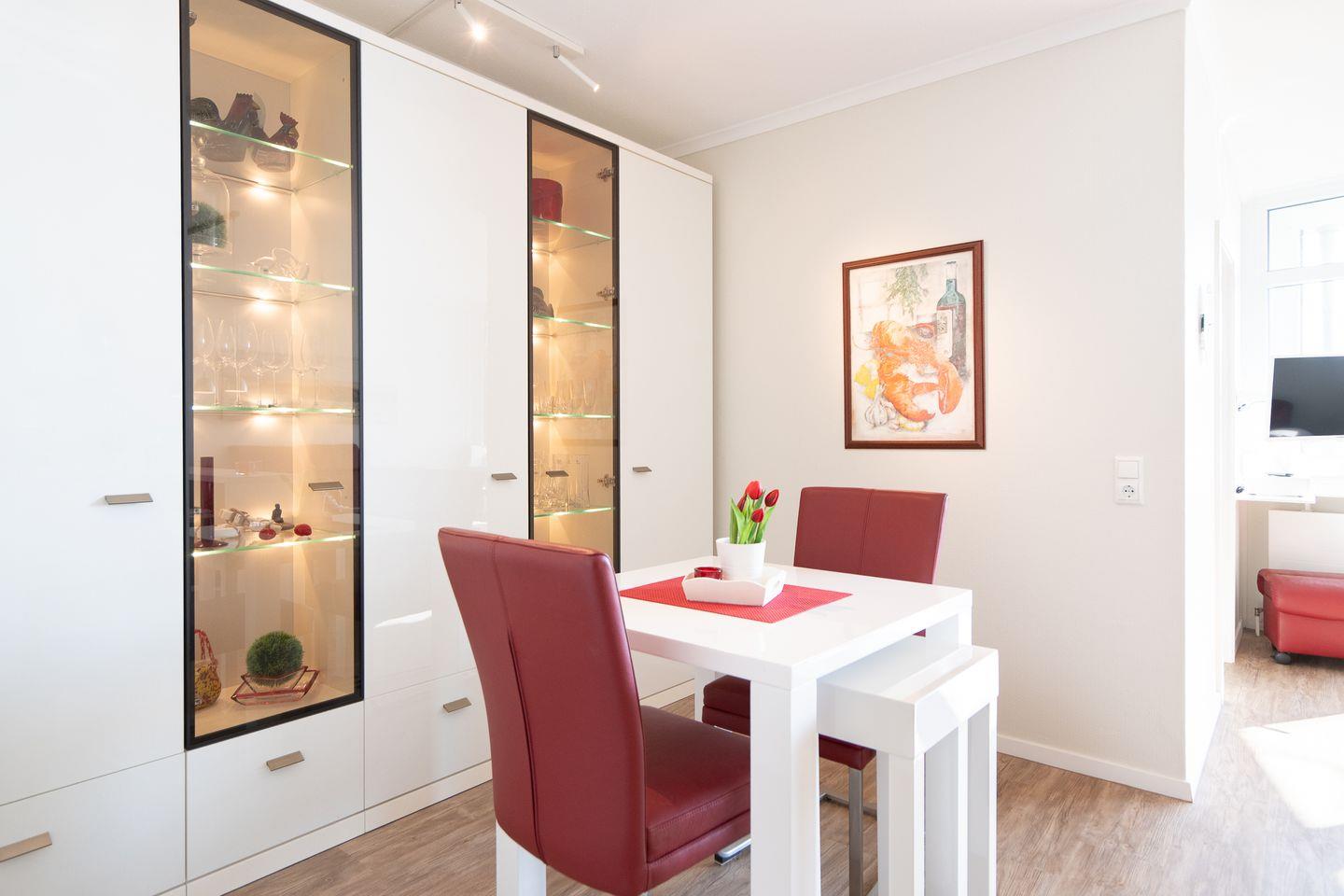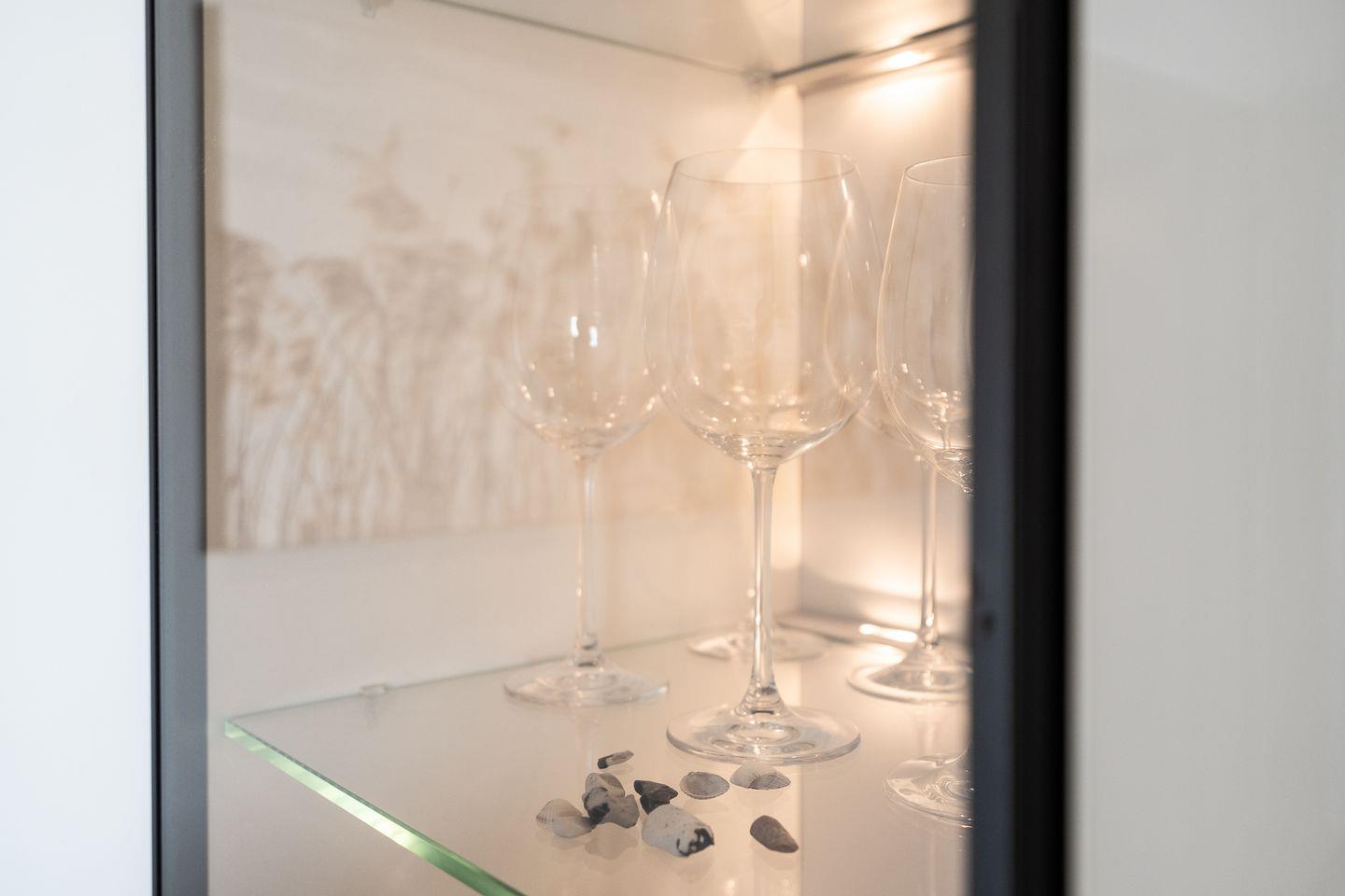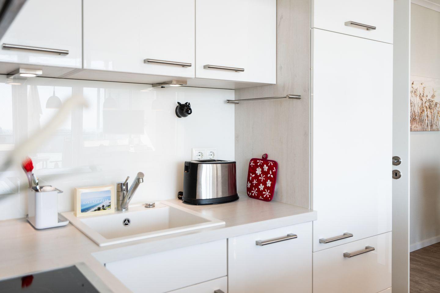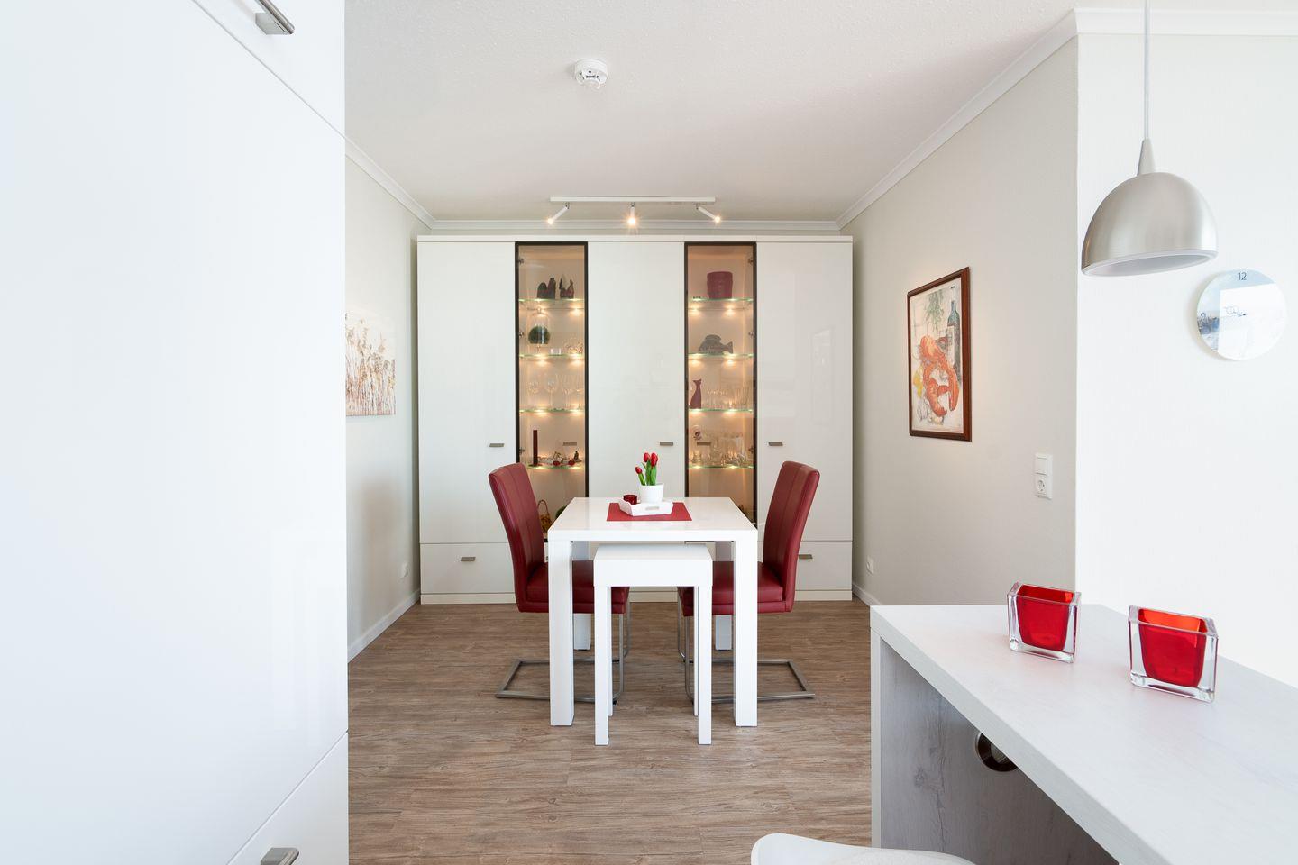 Die offene Küche ist mit allem ausgestattet, was man braucht: Spülmaschine, Ceranfeld, Kühlschrank sowie eine Mikrowelle mit Backfunktion und ein kleiner Gefrierschrank (beide in der praktischen Kammer neben dem Flur). Ein Esstresen mit Meerblick lädt zum Frühstücken ein – und am Abend genießen Sie Ihr Dinner stimmungsvoll am Esstisch mit Kerzenschein.