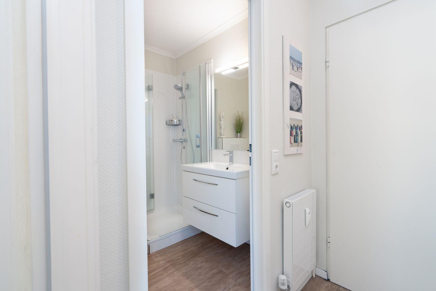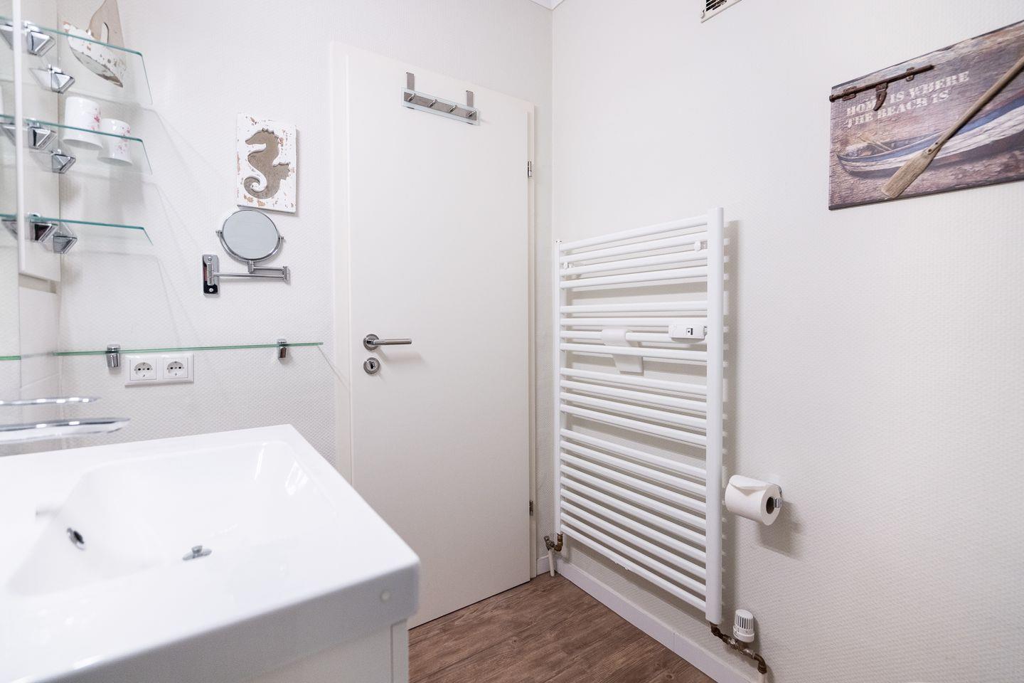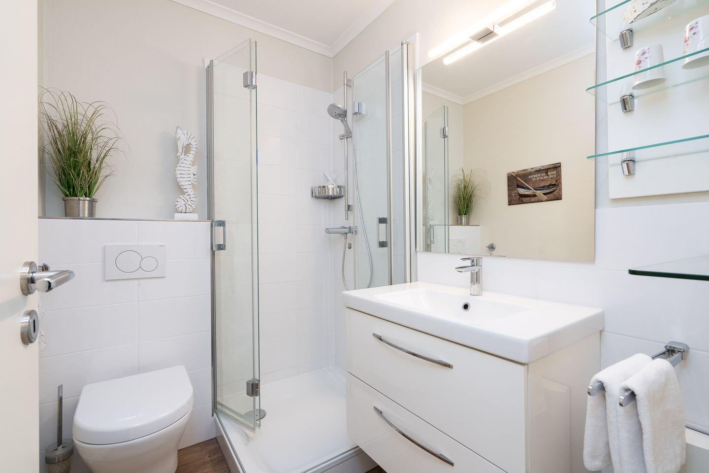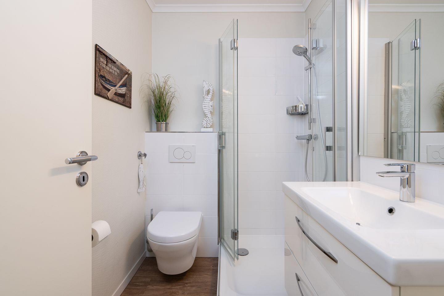 Das hell gestaltete Duschbad ist mit Waschtisch, Spiegel, Föhn, WC, Handtuchheizung und reichlich Ablagefläche für Ihre Pflegeprodukte ausgestattet.
