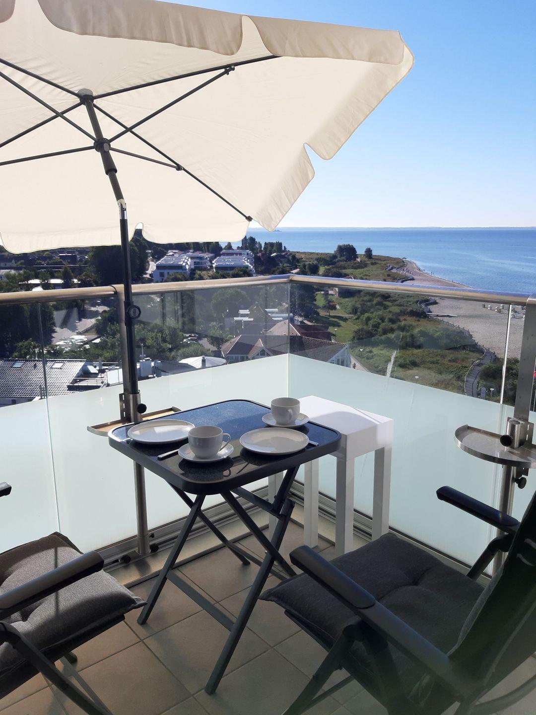 Ein echtes Highlight ist der sonnige Balkon im 10. Stock mit traumhaftem Ausblick aufs Meer und über den gesamten Ort. Hier können Sie bei einem Kaffee oder Glas Wein einfach mal die Seele baumeln lassen. Stühle, Tisch und Sonnenschirm sind natürlich vorhanden.