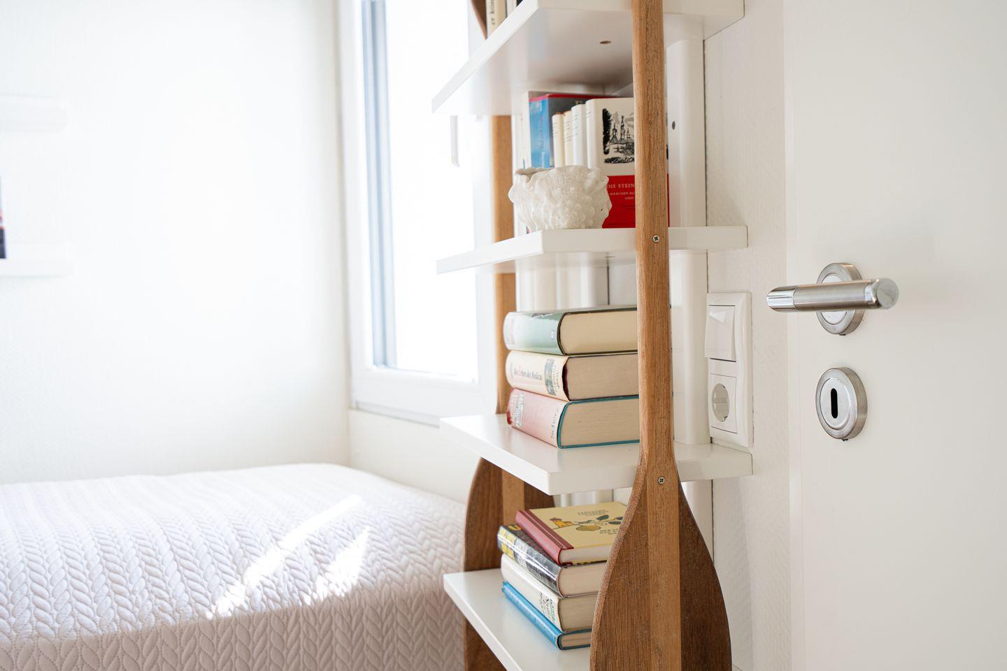 Im separaten Schlafzimmer schlafen Sie in zwei fest eingebauten, hochwertigen Einzelbetten (90 x 200 cm, Bruno-Matratzen), die nicht zusammenstellbar sind. Bettkästen bieten Stauraum für Kissen und Decken, eine Kommode und dimmbare Leselampen runden den gemütlichen Schlafbereich ab. Ein Fenster mit Plissee sorgt für ein angenehmes Raumklima.