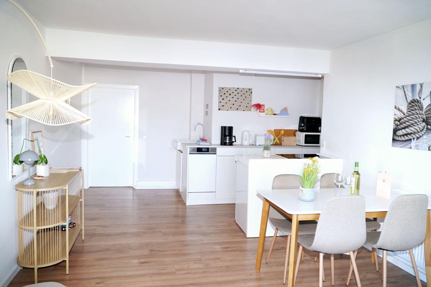 Das Leuchtturm-Apartment erstreckt sich auf großzügigen 80?m² Maisonette-Fläche und bietet Platz für bis zu 5 Gäste. Es verfügt über zwei Schlafzimmer, ein Schlafsofa im Wohnbereich, zwei Bäder (Dusche & Badewanne), einen offenen Wohn-/Essbereich sowie eine sehr gut ausgestattete Küche. Der möblierte Balkon bietet Meer- und Grünblick. Zur Ausstattung gehören WLAN, Parkplatz, Zugang zum Sauna-Spa, Gemeinschaftsgarten mit Feuerstelle und sogar ein Bollerwagen, ideal für Familien, Gruppen oder entspannte Workation nahe dem Strand