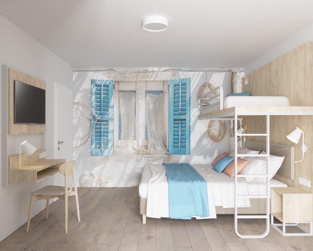 Zimmer für 3 Personen mit Doppelbett, Hochbett, Kleiderschrank, Schreibtisch mit TV und angrenzendem Bad mit Dusche, WC und Waschtisch.