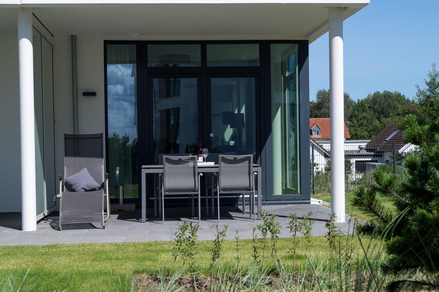 Die überdachte Terrasse mit Gartentisch, zwei Sonnenliegen und einem Sonnenschirm sowie einer kleinen Rasenfläche laden zu entspannten Sommerabenden ein – eingeschränkter Meerblick inbegriffen.