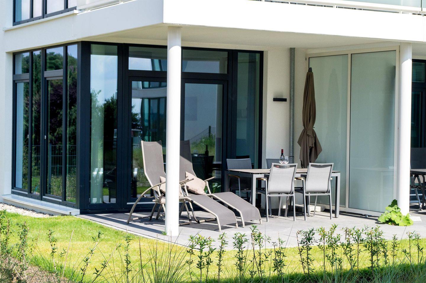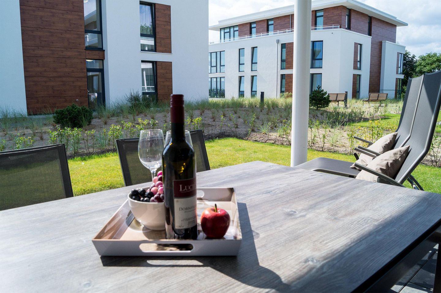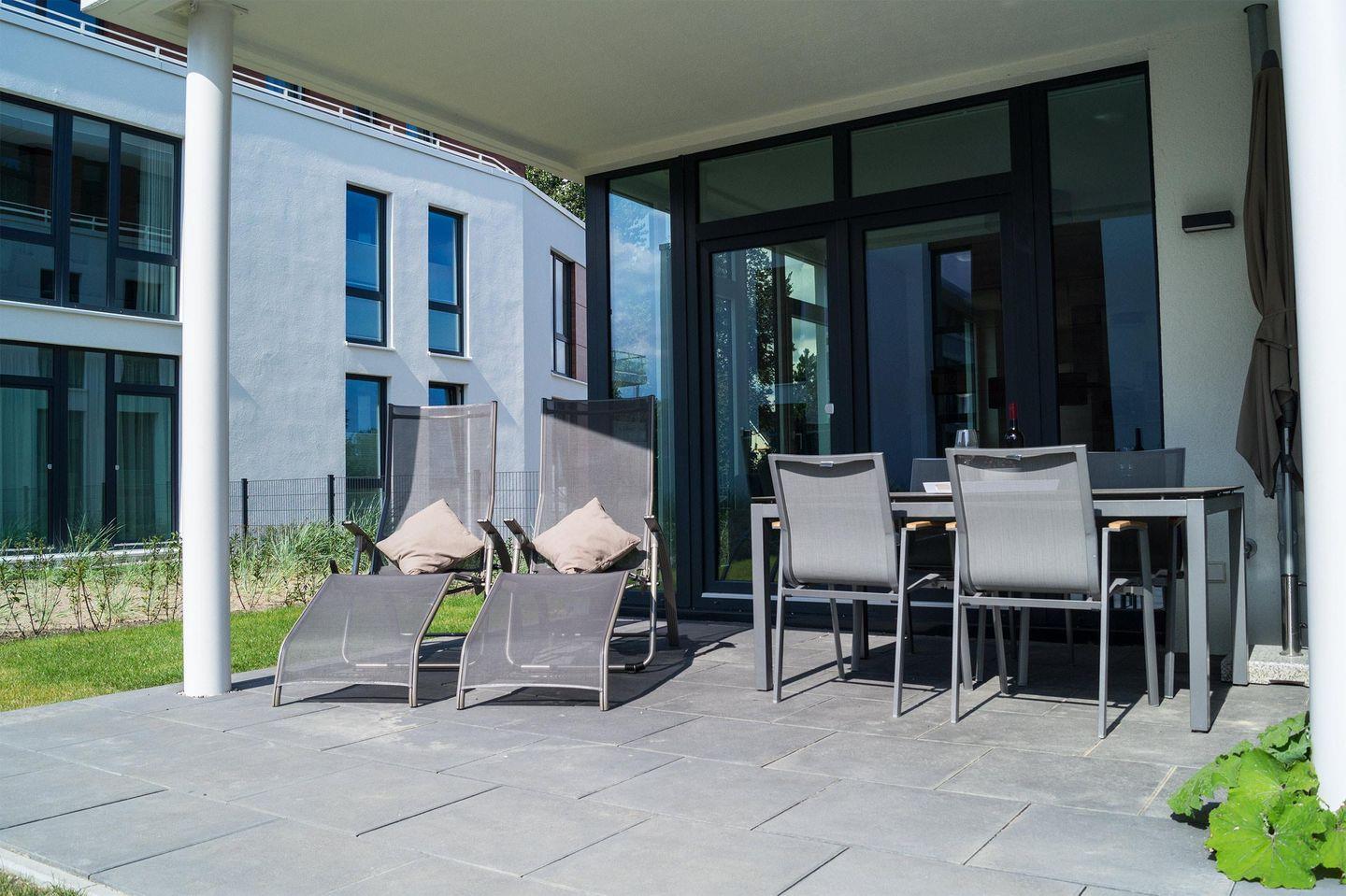 Da die Häuser der Ferienanlage Südkap einen Innenhof haben, liegt die Terrasse ebenerdig. Von der herrlichen Südterrasse haben Sie sogar einen eingeschränkten Meerblick auf die Ostsee.