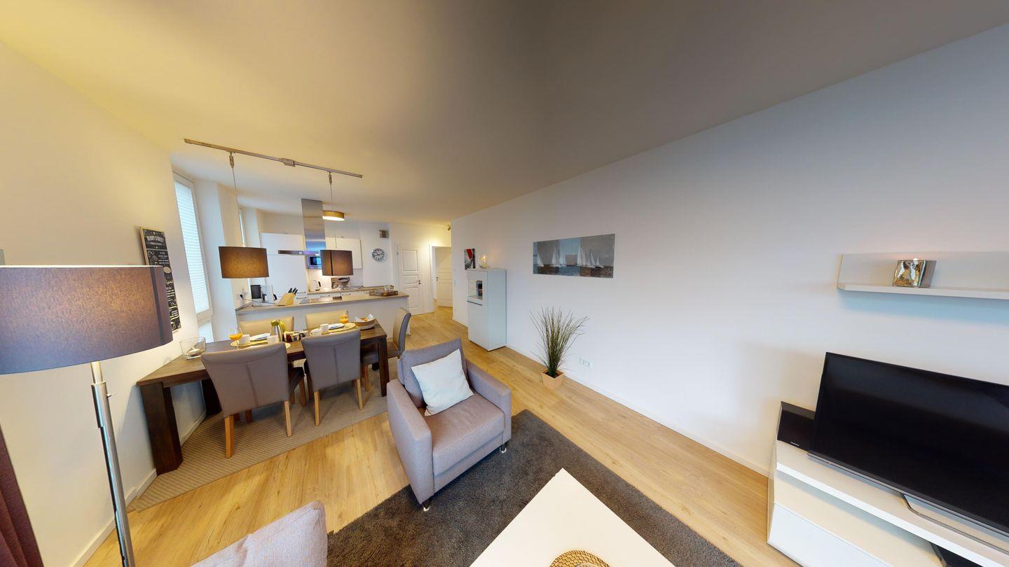 Zwei Schlafzimmer, zwei Bäder und der große, gemütliche Wohn- und Essbereich mit Küchenzeile und Kochinsel versprechen Luxus auf 85 m².