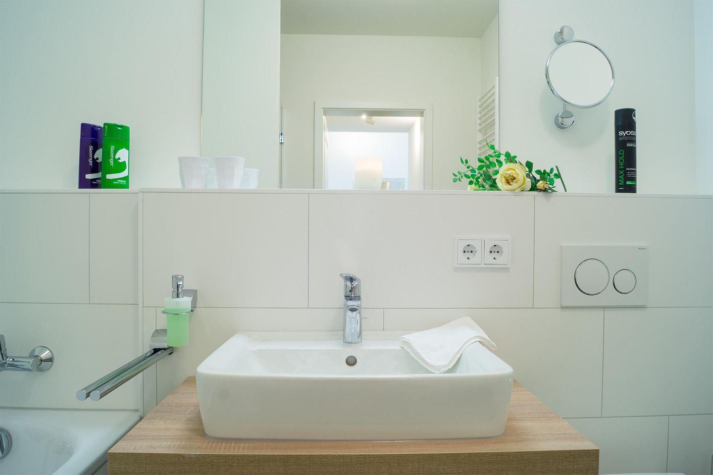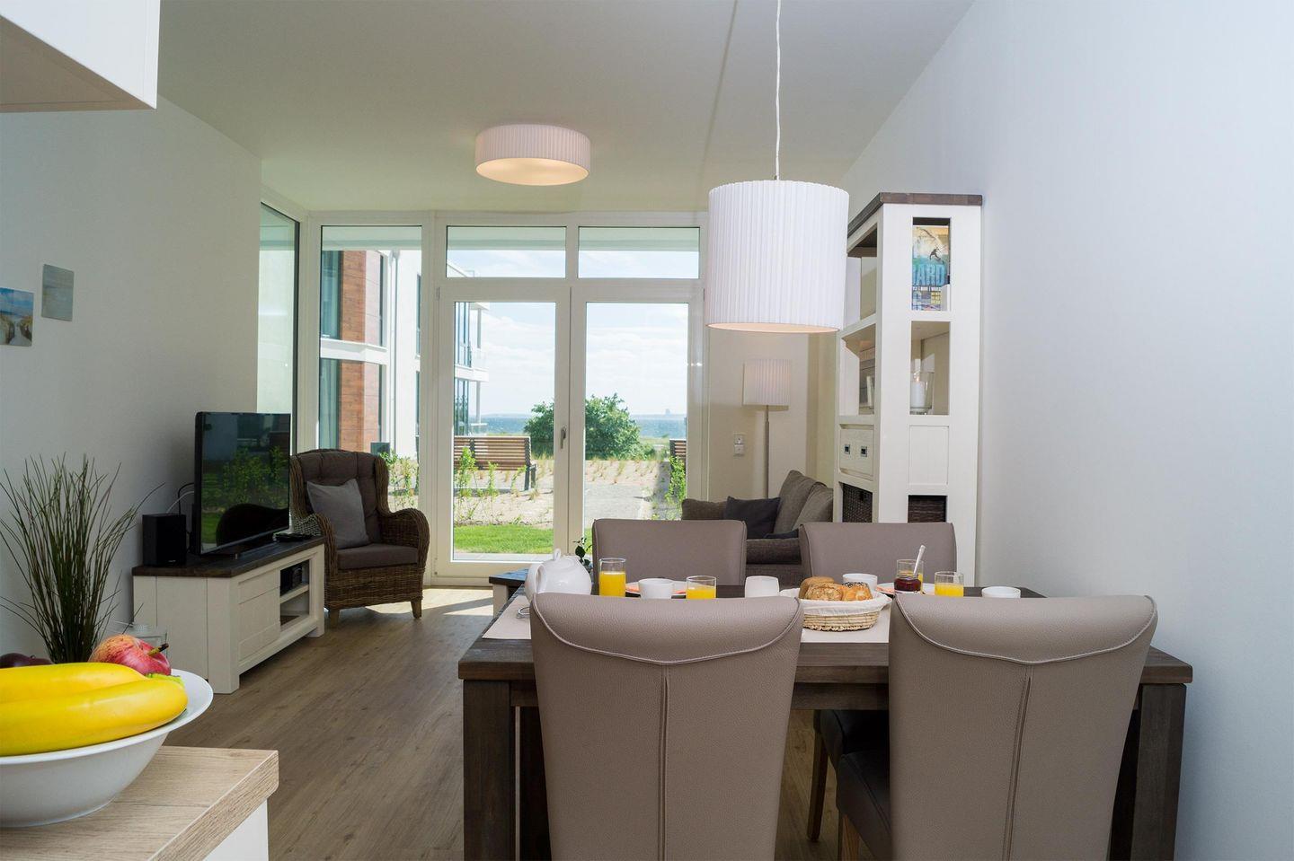 Der helle kombinierte Wohn-/Essraum verfügt über eine komplett ausgestattete offene Küche und bildet das Herzstück der Wohnung. Die geschützte Terrasse ist ebenerdig vom Schlaf- sowie vom Wohnzimmer aus erreichbar. Das Schlafzimmer ist mit einem gemütlichen Boxspring-Doppelbett, einem großen Kleiderschrank und einem Fernseher ausgestattet. Für Entspannung sorgt das geräumige Badezimmer mit Badewanne und Dusche.