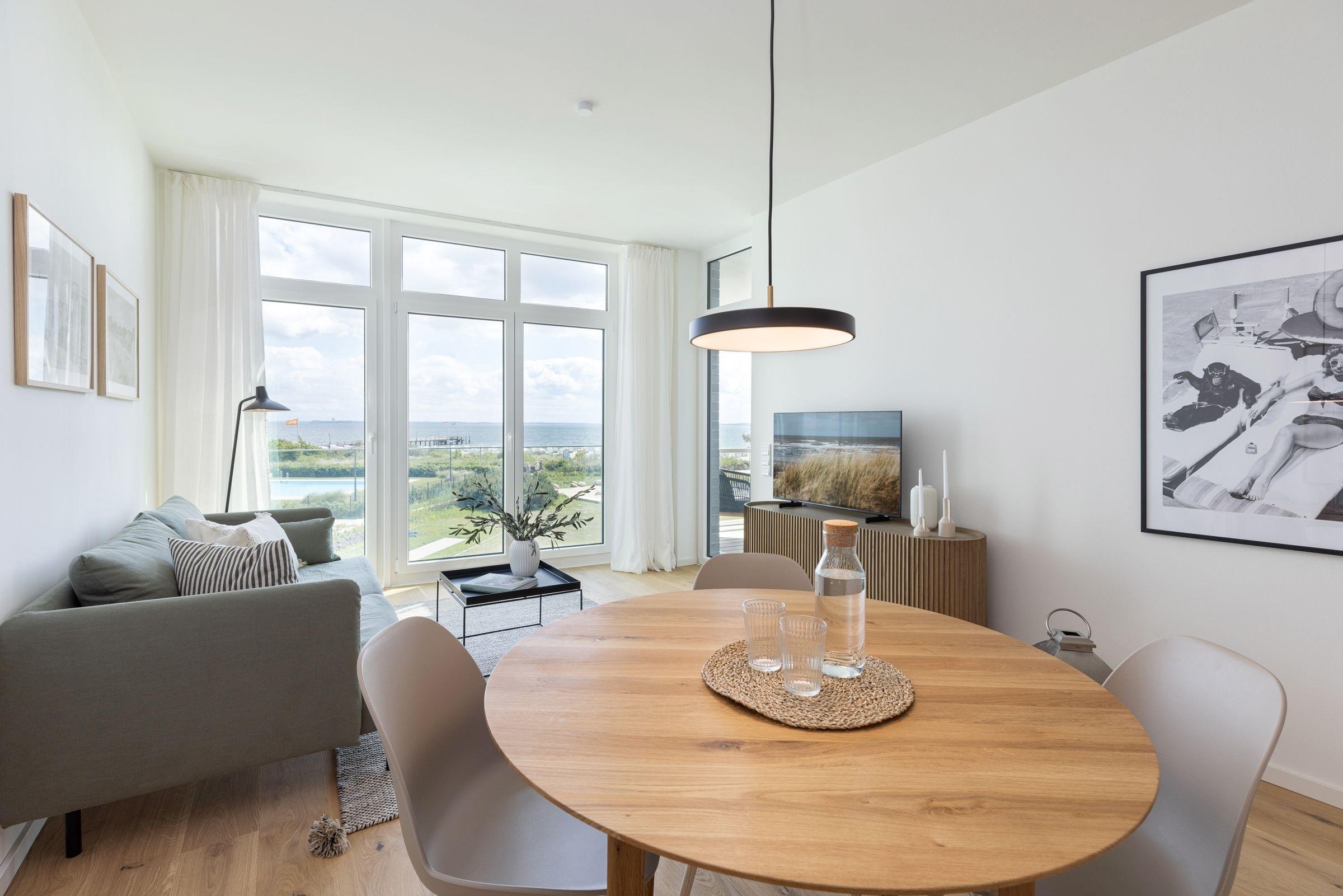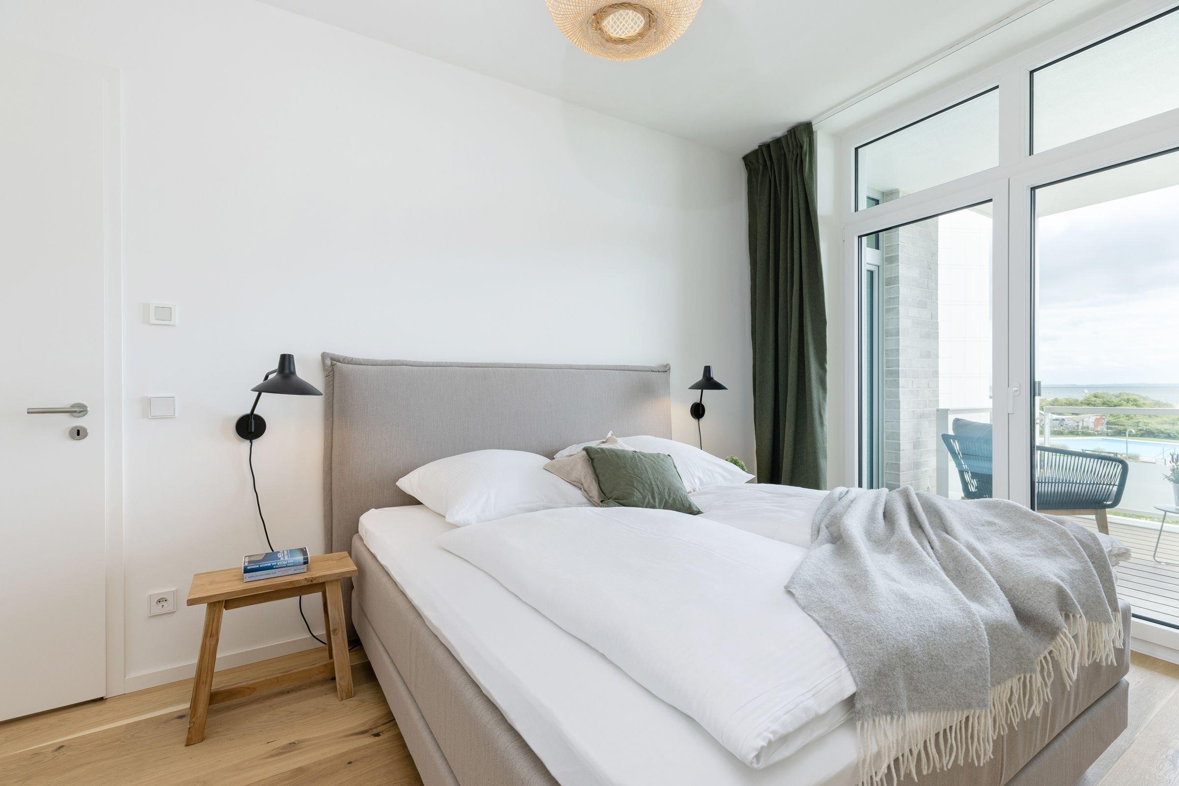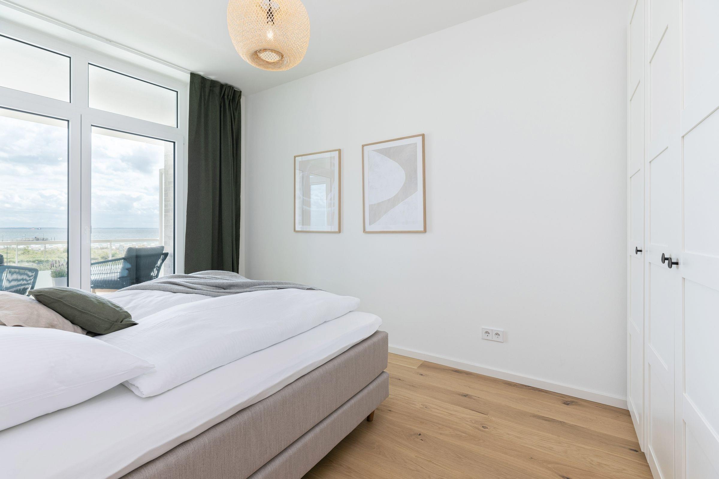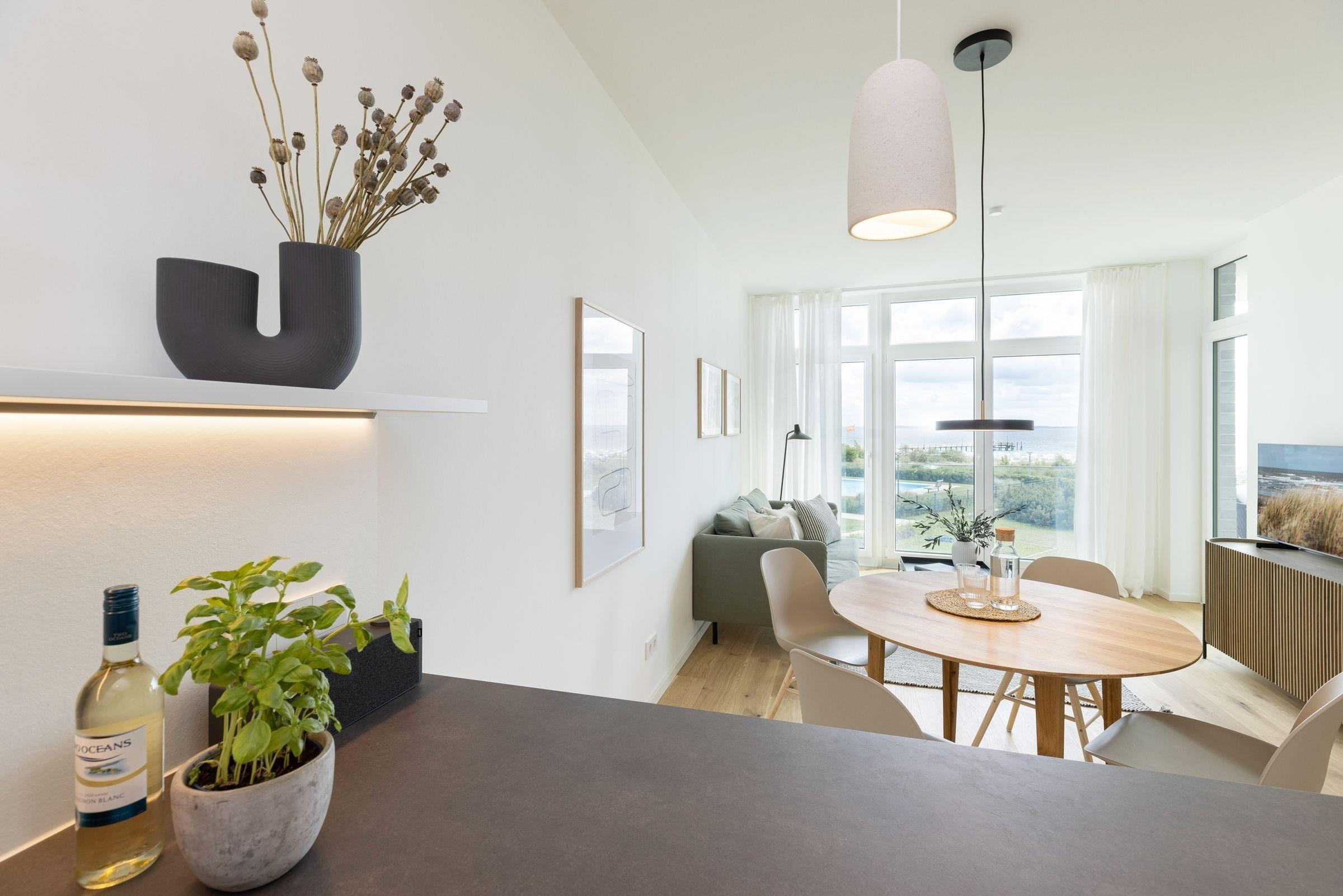Der kombinierte Wohn- und Essbereich ist hochwertig ausgestattet und lädt Sie ein, erholsame Abende auf dem Sofa bei einem guten Film zu verbringen. In der offenen, voll ausgestatteten Küche können Sie abends Ihr Urlaubsmenü zaubern. Alle notwendigen Küchengeräte wie z. B. ein Backofen in komfortabler Arbeitshöhe, ein Herd (Induktion), ein Kühlschrank mit Gefrierfach sowie ein Geschirrspüler sind vorhanden. Als Highlight steht Ihnen neben einer Kaffeefiltermaschine zusätzlich eine Kaffeekapselmaschine (Nespresso) zur Verfügung. Das separate Schlafzimmer erwartet Sie bereits mit einem komfortablen Boxspring-Doppelbett (180x200 cm, durchgehender Topper). Auf den überdachten Süd-Balkon gelangen Sie sowohl vom Wohn- als auch vom Schlafzimmer. Genießen Sie Ihre Auszeit mit Meerblick und lassen sich dabei die Ostseeluft um die Nase wehen.