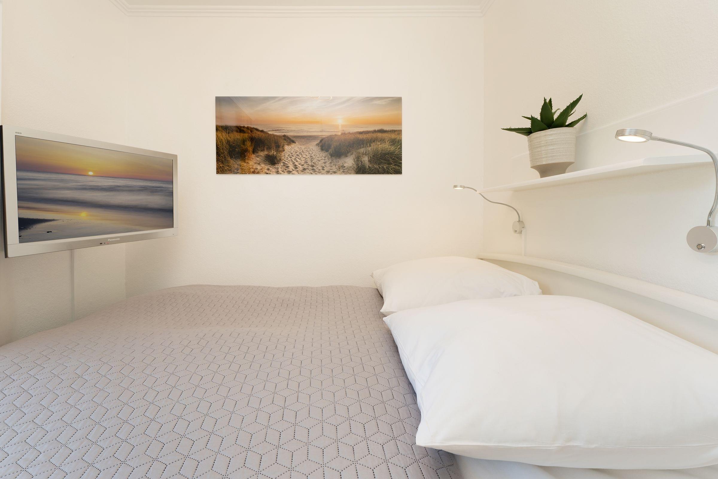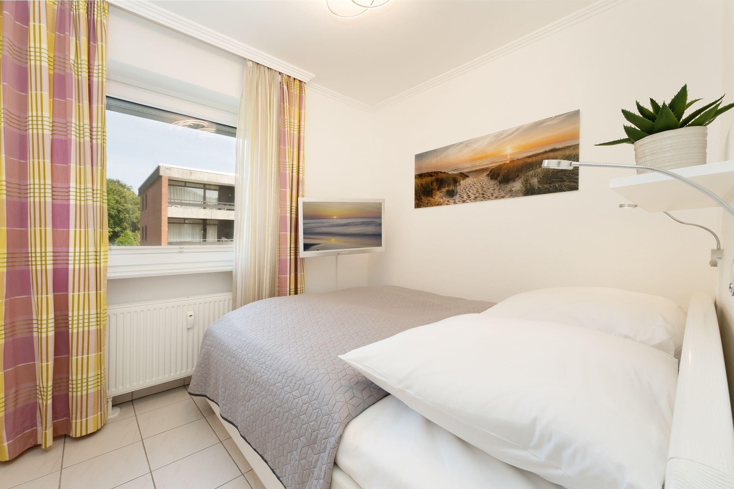 Schlafzimmer 1: 1 Doppelbett (2x 80x200 cm), Kleiderschrank, TV, Verdunkelung: Rollladen und Plissee, kein Platz für ein Babybett