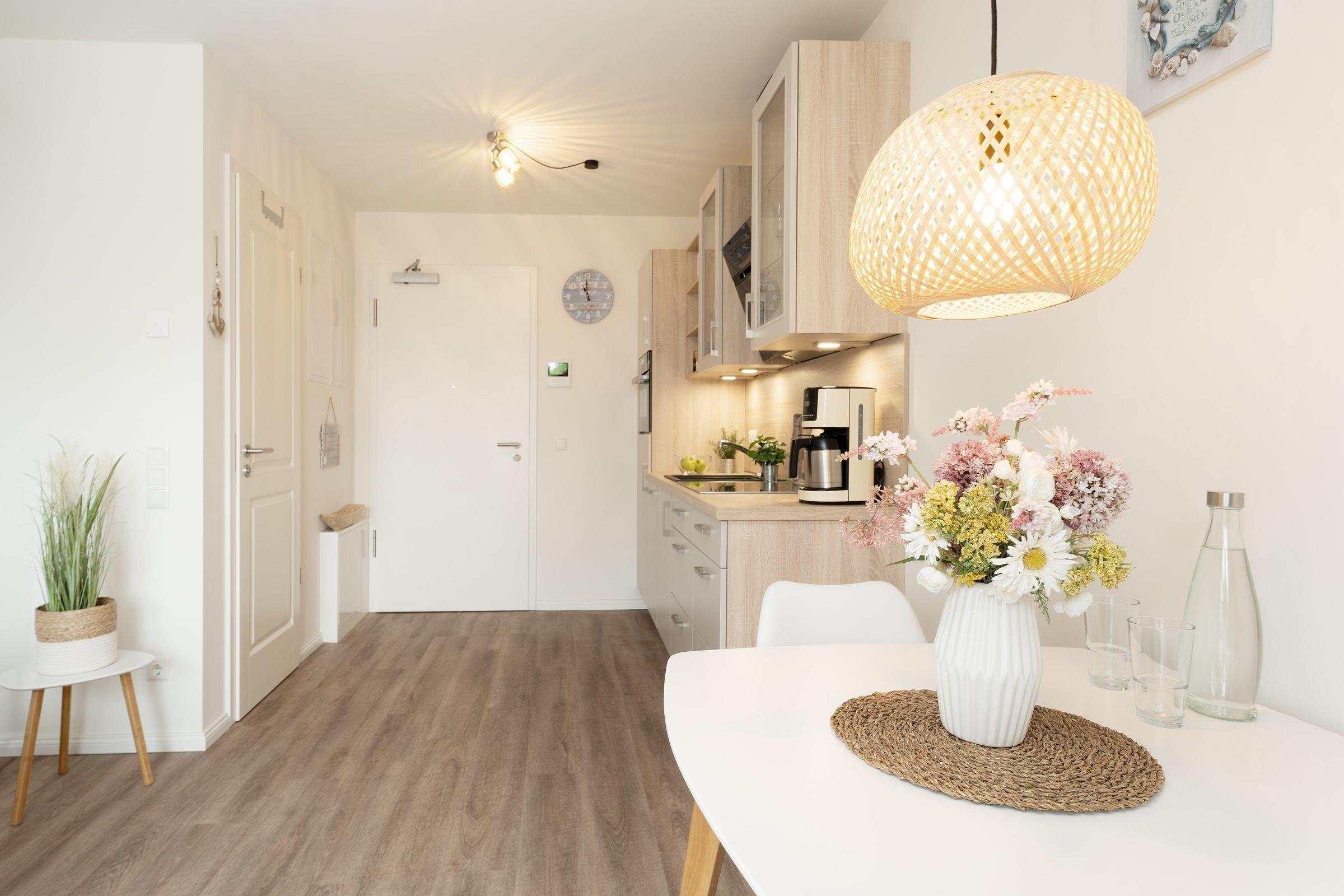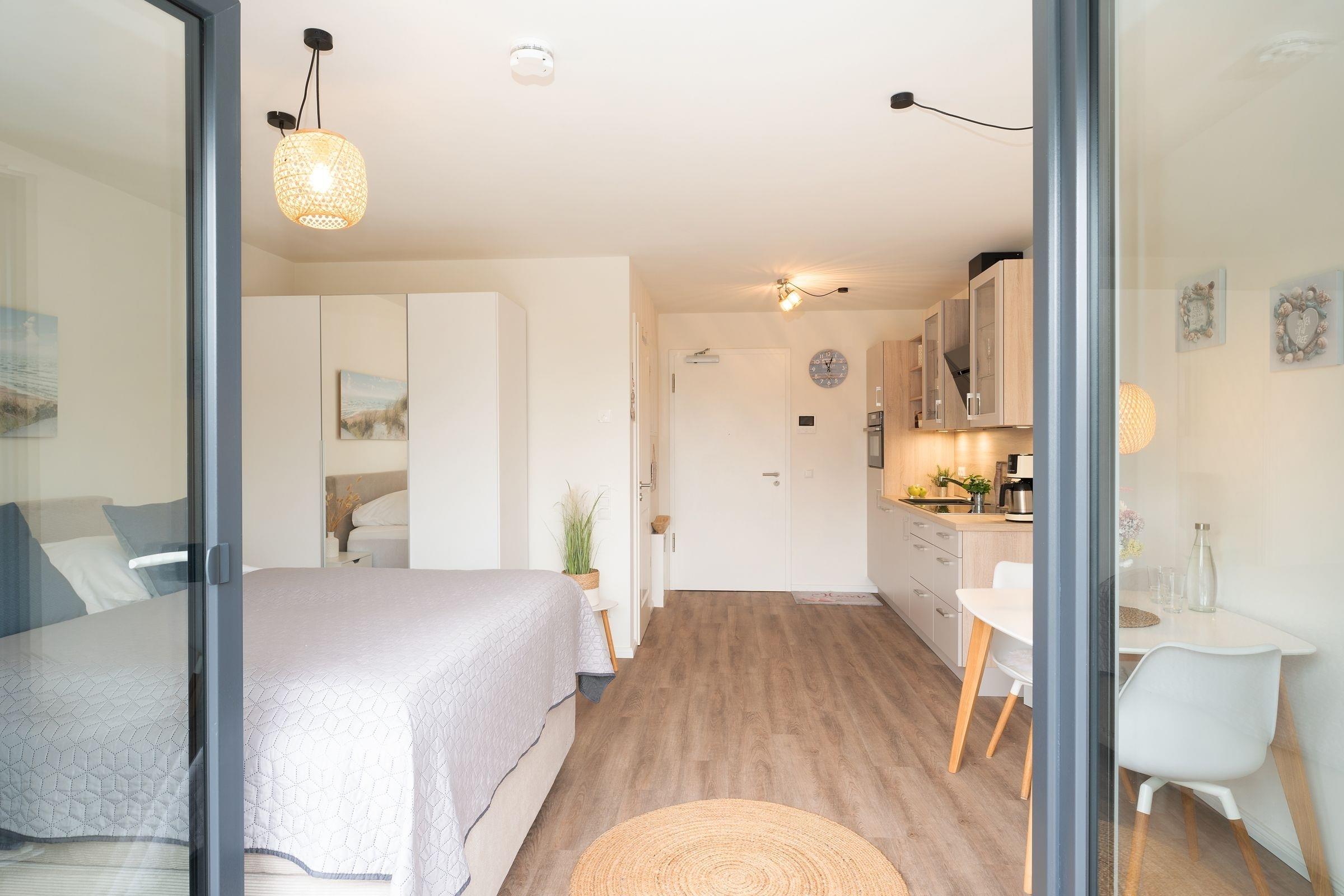 Der kombinierte Wohn- und Schlafbereich empfängt Sie mit einem hochwertigen Boxspringbett von Jette Joop (160x200 cm), einem Flachbildfernseher sowie einem großen Kleiderschrank für Ihre Urlaubsgarderobe. Elektrische Außenrollläden sorgen für erholsame Nächte. Die offene Küchenzeile ist u. a. mit einem Kühlschrank mit Gefrierfach, einem Geschirrspüler und einem Backofen mit integrierter Mikrowelle sehr gut ausgestattet. Das innenliegende Badezimmer sorgt mit einer Regendusche (bodengleich), einem beheizbaren Handtuchhalter und Fußbodenheizung für viel Komfort. Für Unterhaltung sorgen ein Bluetooth Radio und ein kostenfreier WLAN-Anschluss. Vom Wohnbereich gelangen Sie auf den möblierten Balkon mit West-Ausrichtung, der Ihnen erholsame Stunden garantiert. Auch die Ostsee erreichen Sie fußläufig in ca. 15 Minuten über einen idyllischen Wanderweg.