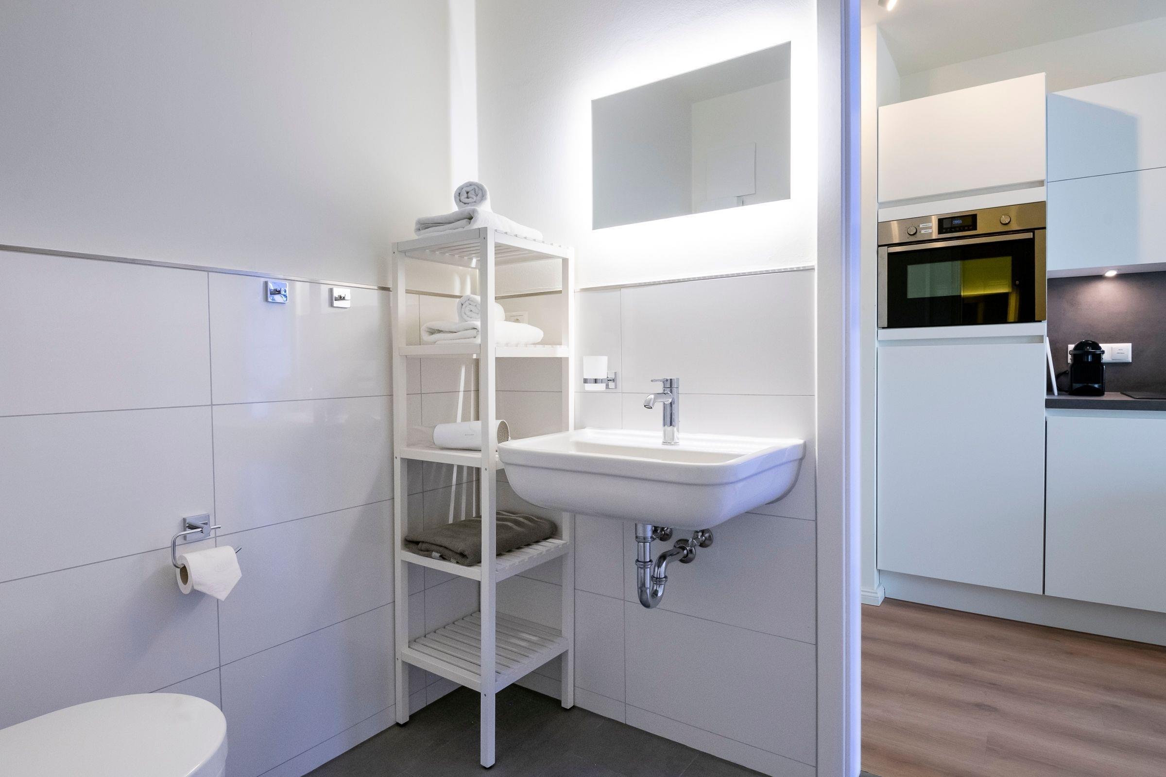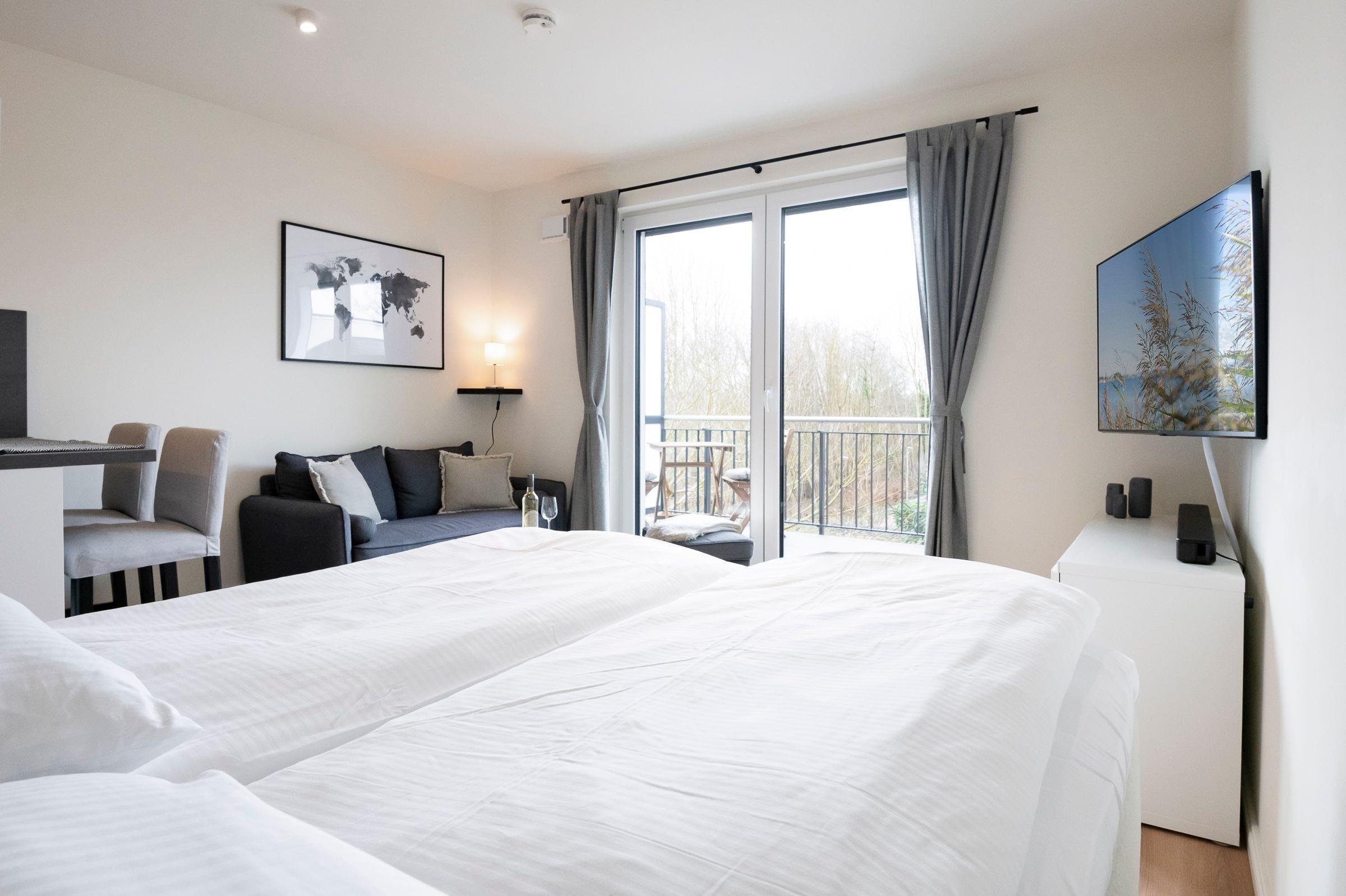 Das kombinierte Wohn- und Schlafzimmer mit angrenzender, offener Küche ist mit einem bequemen Sofa und einem komfortablen Boxspring-Doppelbett (160x200 cm) ausgestattet. Für Verdunkelung sorgen Außenjalousien. In der modernen Küchenzeile sorgen Annehmlichkeiten wie z. B. ein Herd mit Induktionskochfeld, ein Kühlschrank mit Gefrierfach, ein Geschirrspüler sowie eine Mikrowelle (Kombigerät mit Backofenfunktion) für Freude am Kochen. Für den täglichen Kaffeegenuss sorgt eine Espressomaschine (Nespresso). Eine bodengleiche Dusche, ein beheizbarer Handtuchhalter sowie Fußbodenheizung sorgen für Komfort im modernen, innenliegenden Badezimmer. Als Highlight steht Ihnen auf dem teilüberdachten Balkon mit West-Ausrichtung ein eigener Strandkorb zu Verfügung. Auch die Ostsee erreichen Sie fußläufig in ca. 15 Minuten über einen idyllischen Wanderweg.
