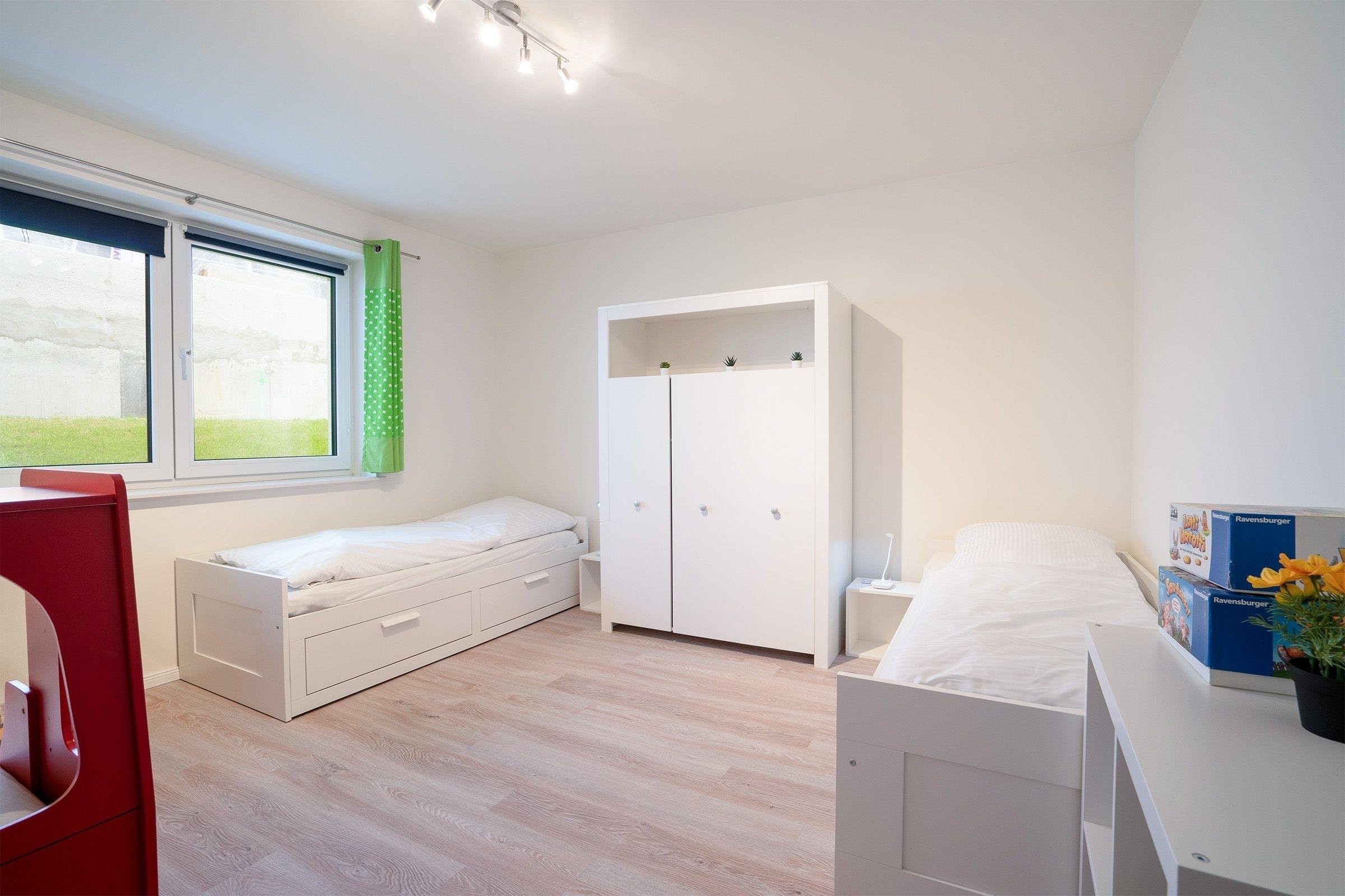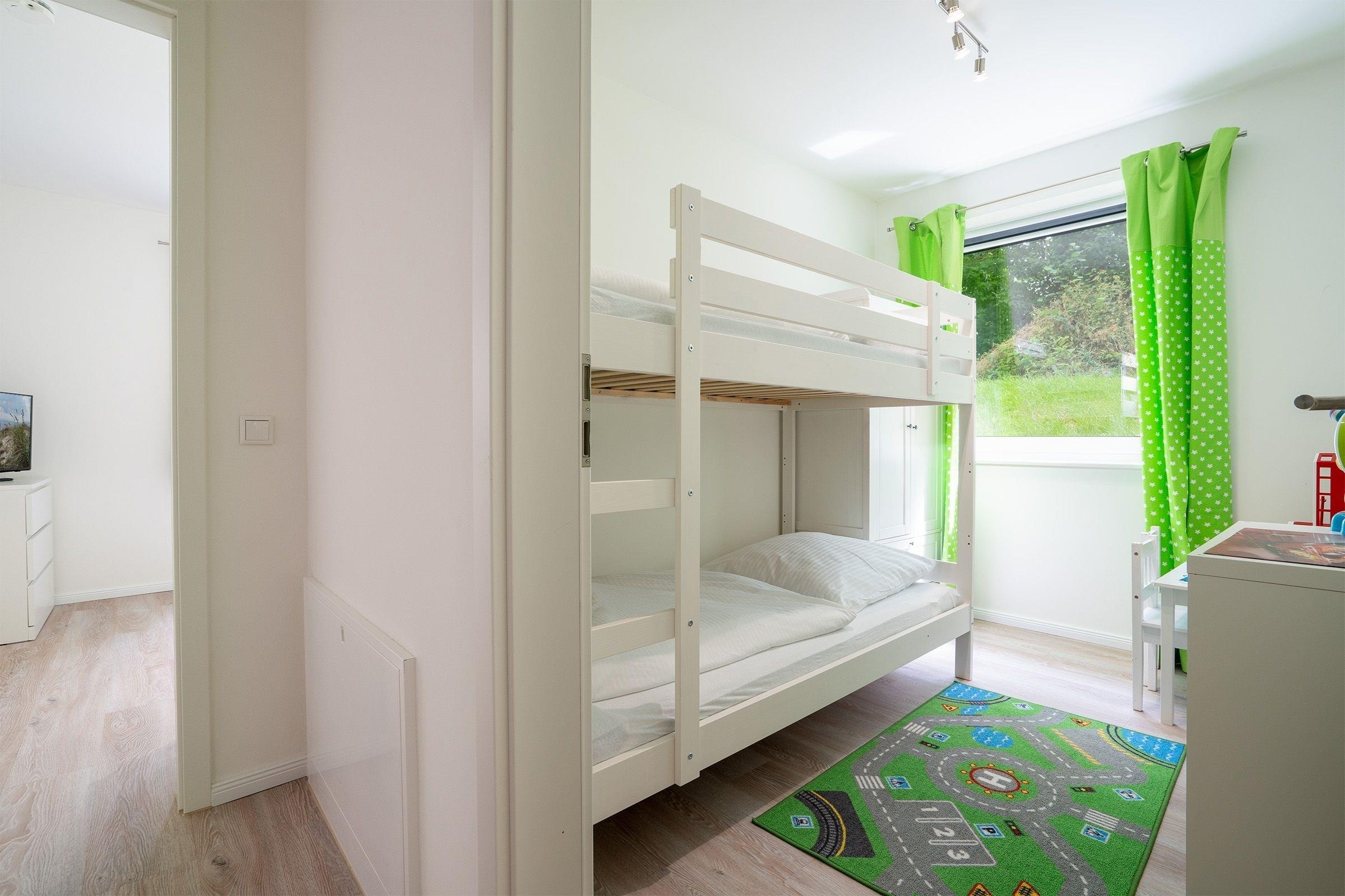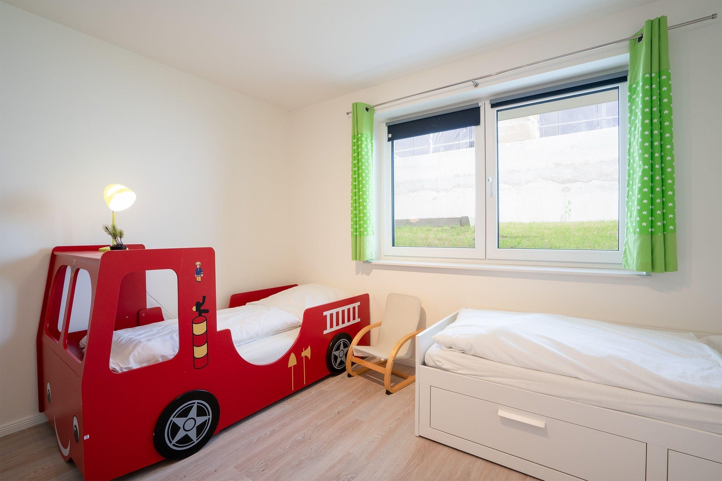 Schlafzimmer 3: 2 Einzelbetten (je 90x200 cm), 1 Feuerwehr-Einzelbett (90x200cm) Kleiderschrank, Verdunkelung (Rollo und Gardinen), Platz für Babybett