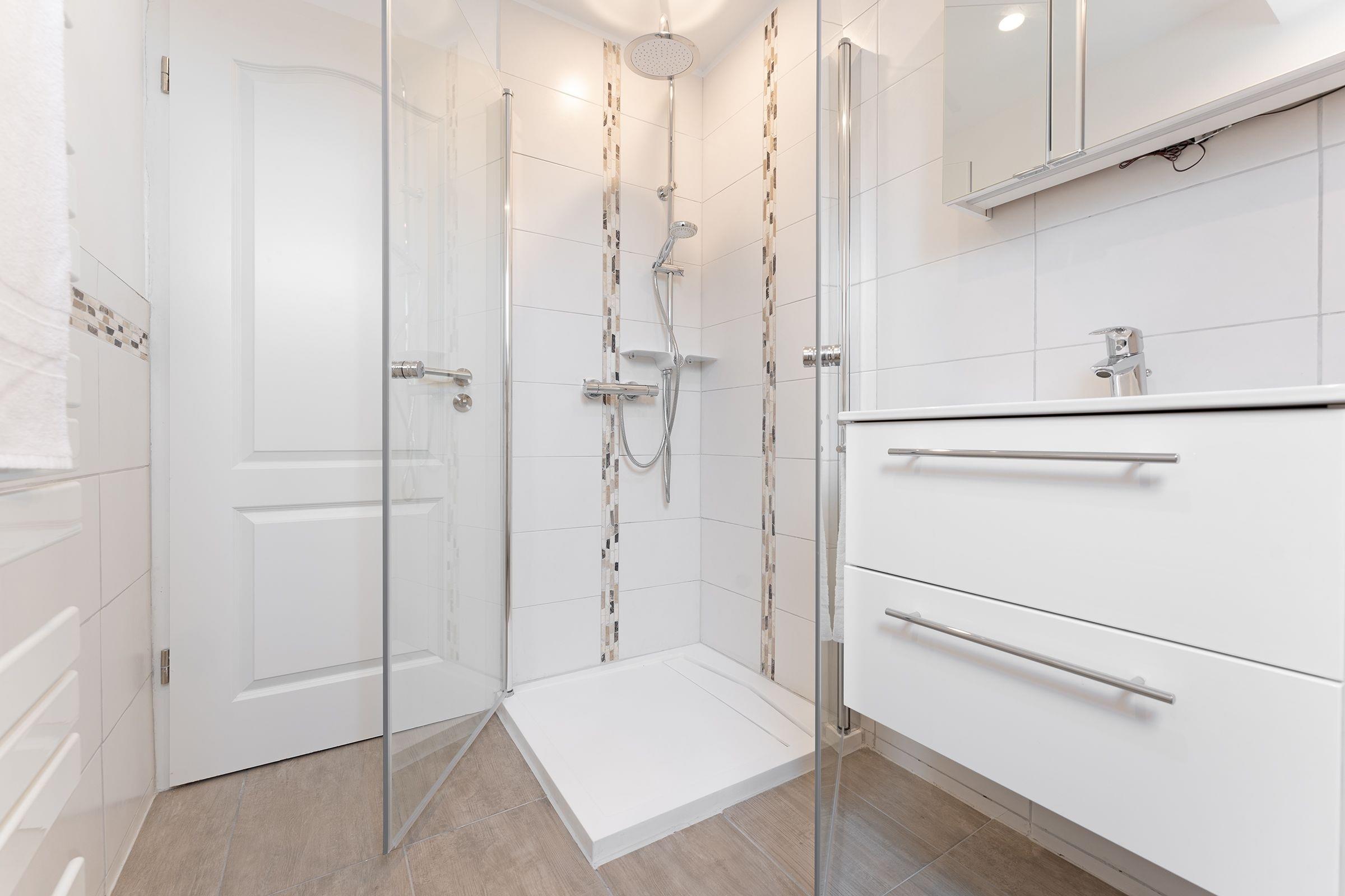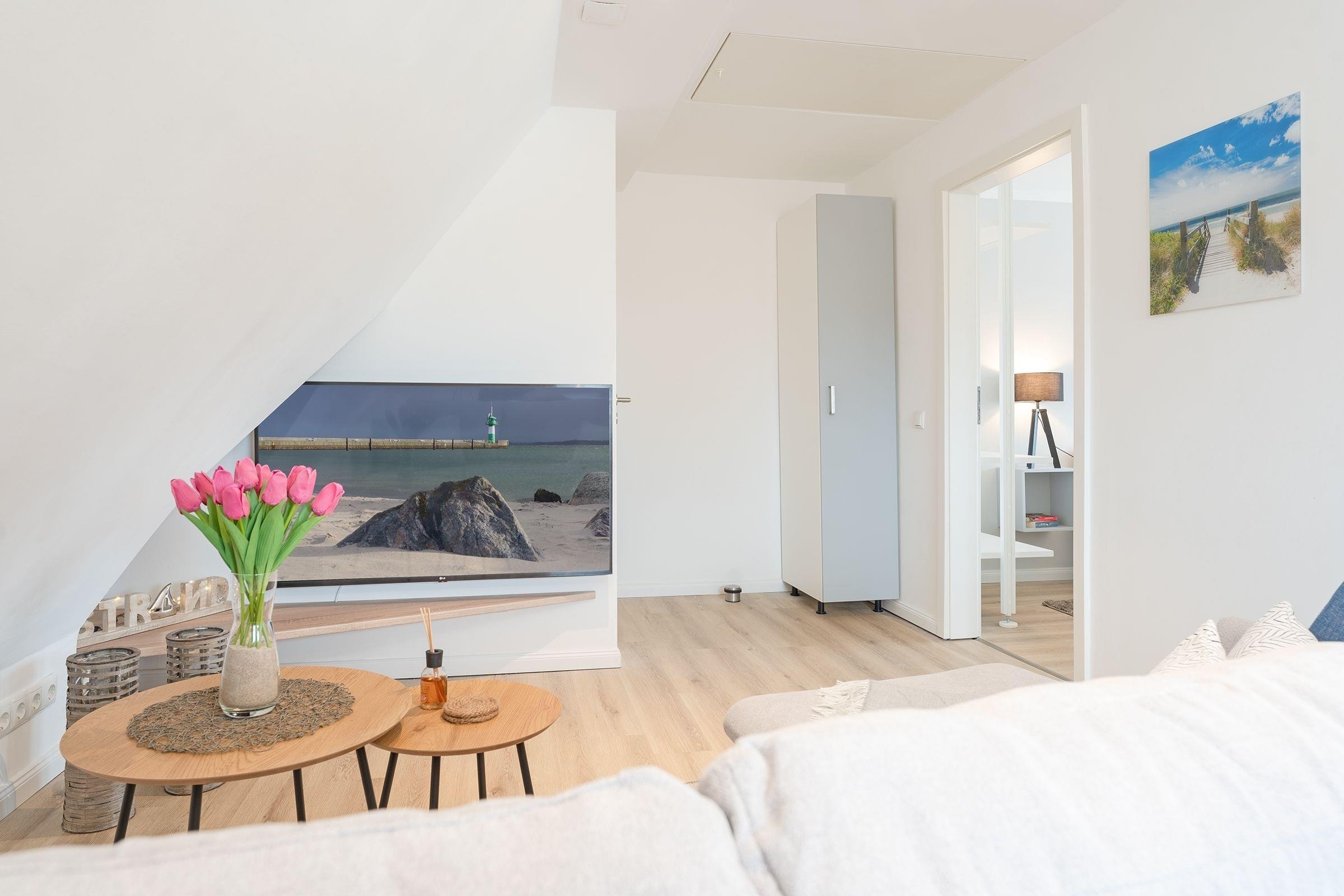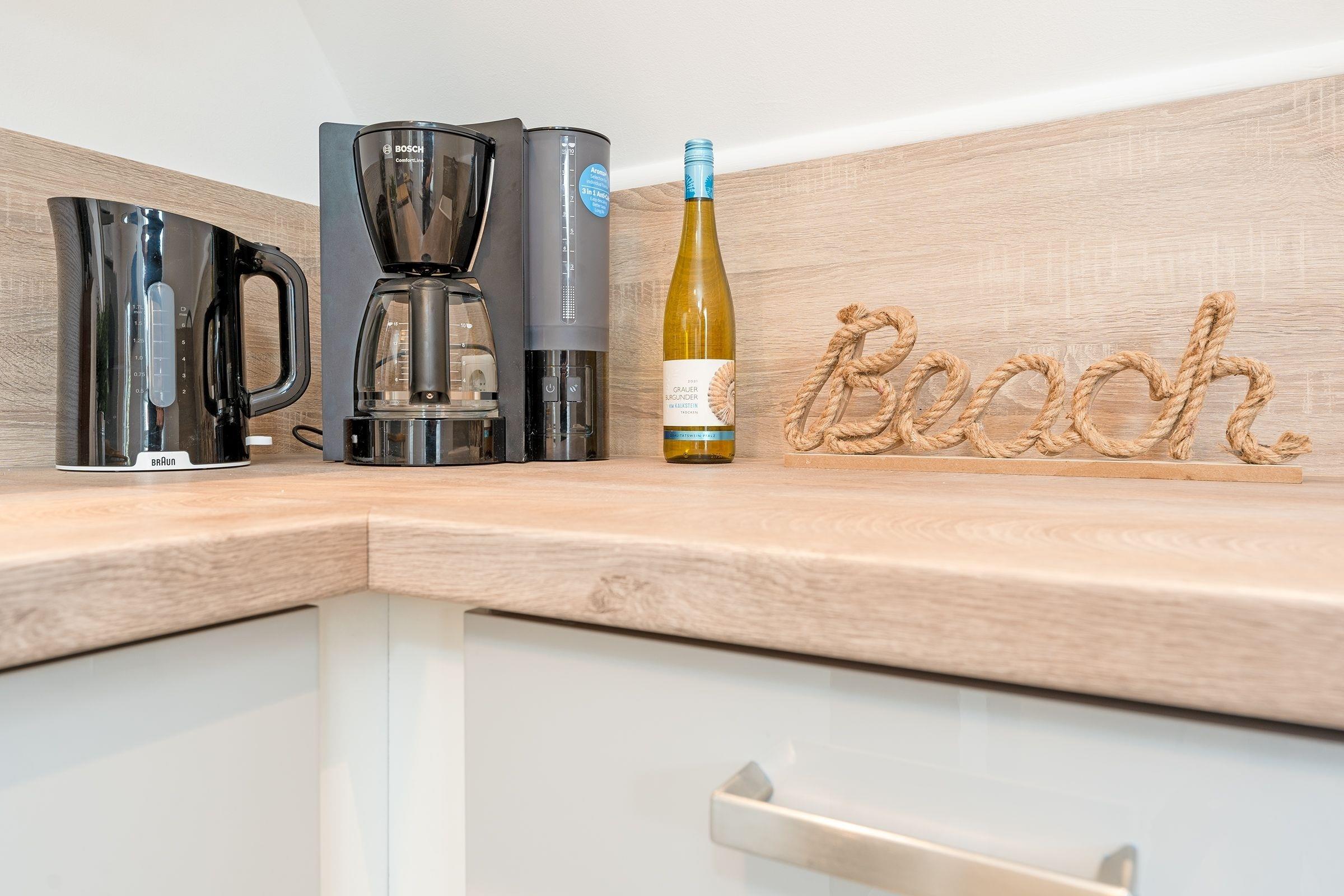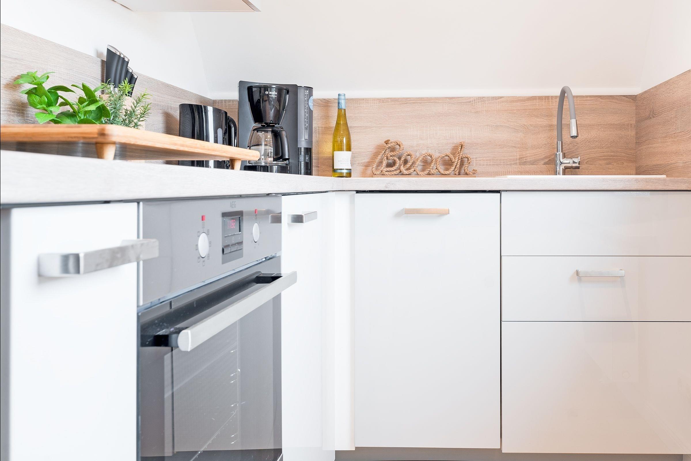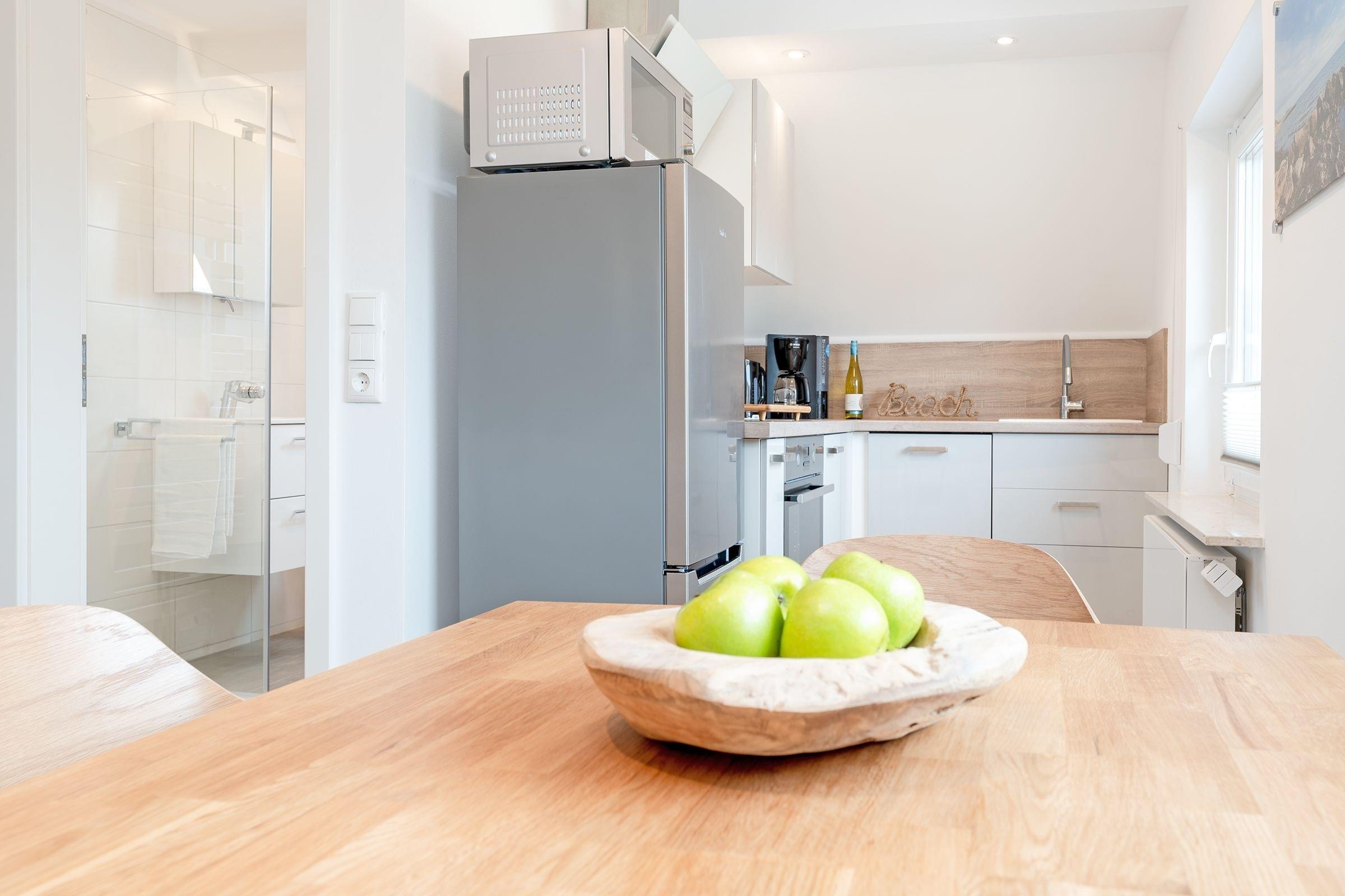 Hereinspaziert! Die Wohnung empfängt Sie mit gemütlichem Wohnbereich mit offener Küchenzeile, die mit allem ausgestattet ist, was Sie für die Zubereitung Ihrer Mahlzeiten benötigen. Die Couch kann bei Bedarf zu einem weiteren Schlafplatz (ca. 223x146 cm) verwandelt werden, ein Fernseher sorgt hier für ausreichend Unterhaltung. Das separate Schlafzimmer ist mit einem Doppelbett (180x200 cm, durchgehende Matratze) ausgestattet, Ihre Urlaubsgarderobe können Sie im geräumigen Kleiderschrank verstauen. Im hellen Tageslichtbad steht eine bodentiefe Dusche bereit und sorgt für einen guten Start in den neuen Urlaubstag.
