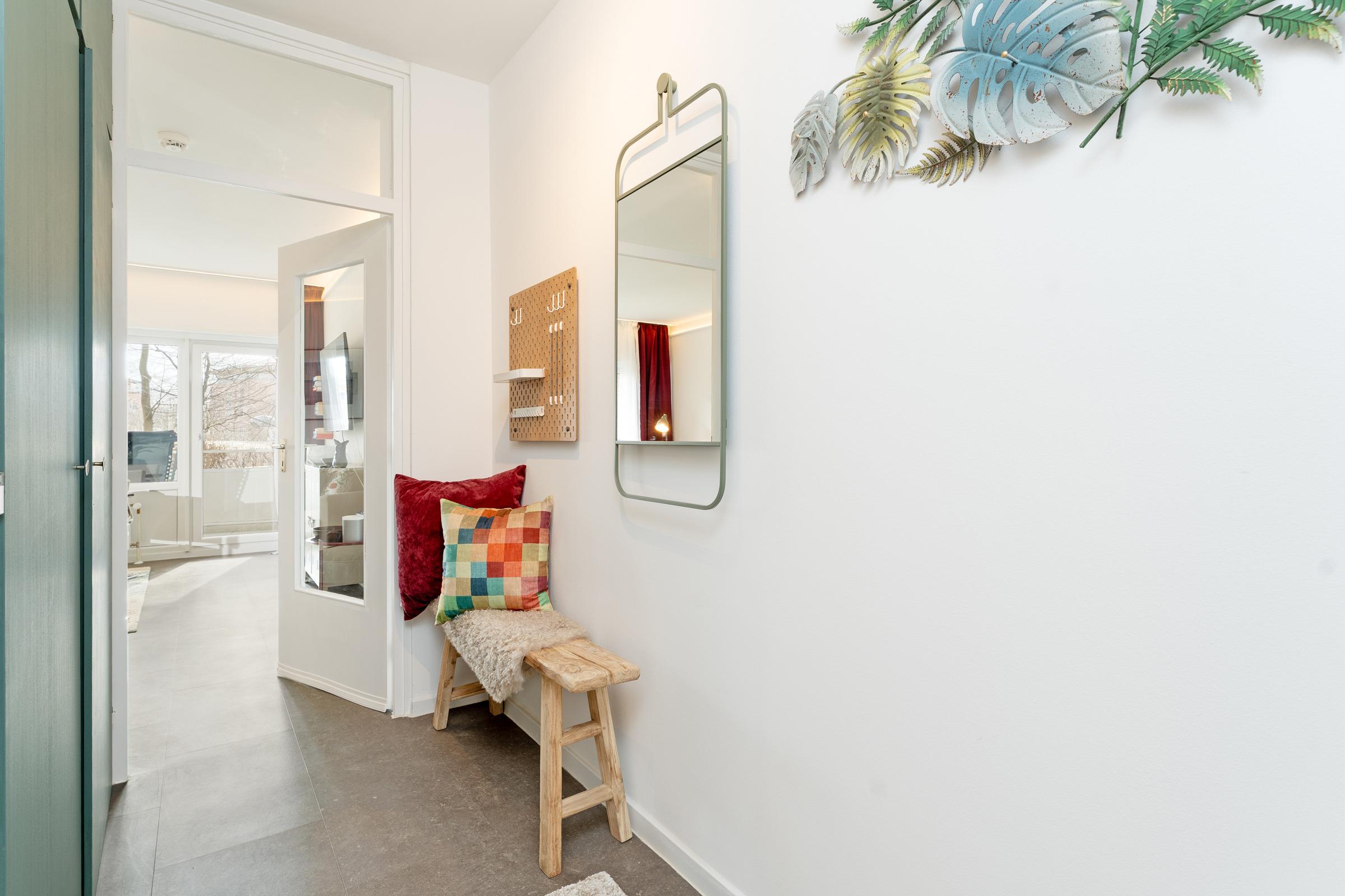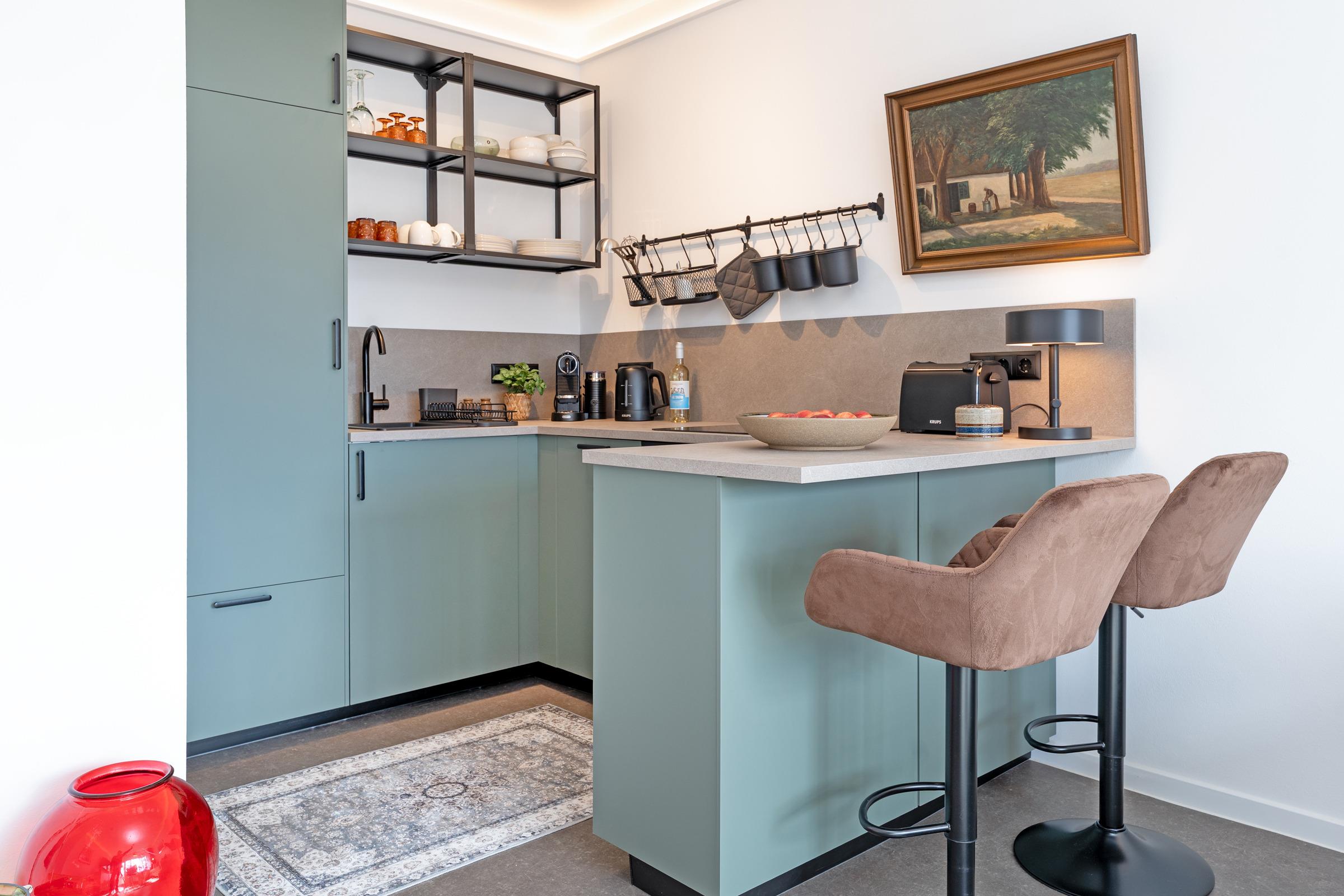 Die integrierte Küche ist gut ausgestattet mit Backofen, Geschirrspüler, Induktionskochfeld, Kühlschrank mit Gefrierfach, Kapselmaschine, Wasserkocher und Toaster. Ein Essbereich ist vorhanden. Das Tageslichtbad verfügt über Dusche/WC.