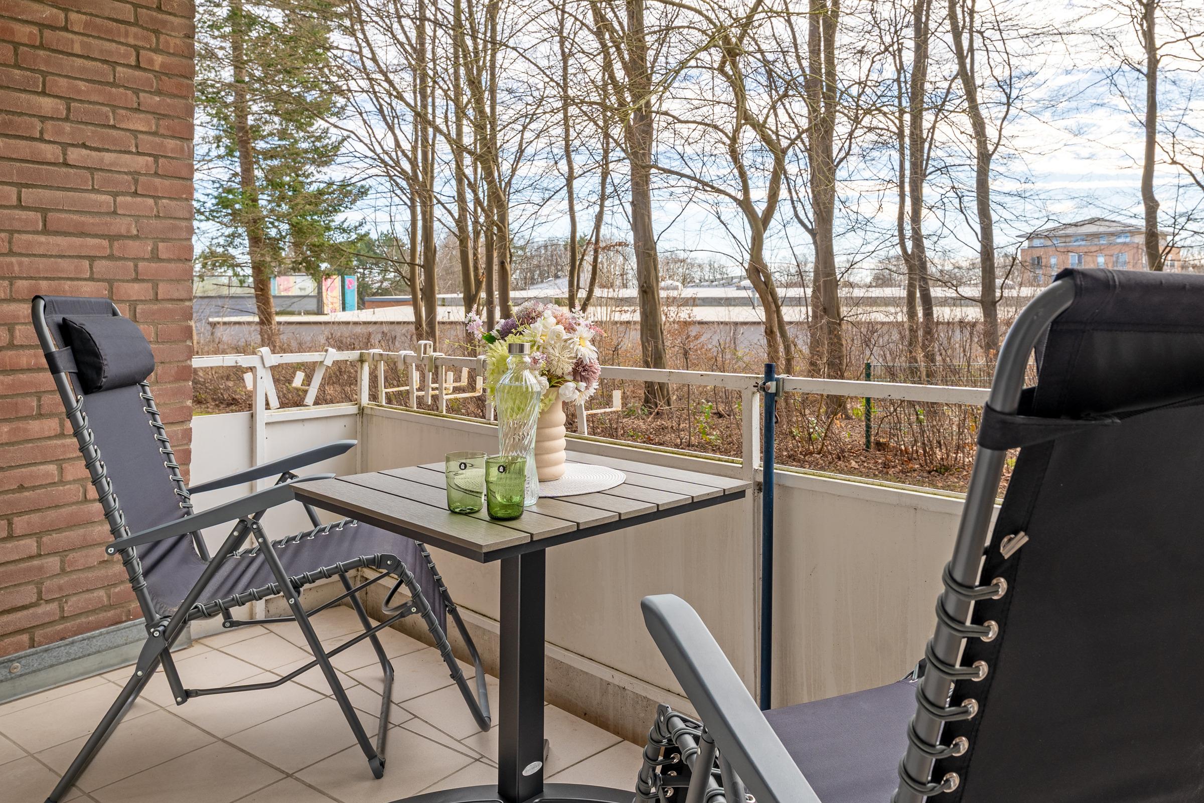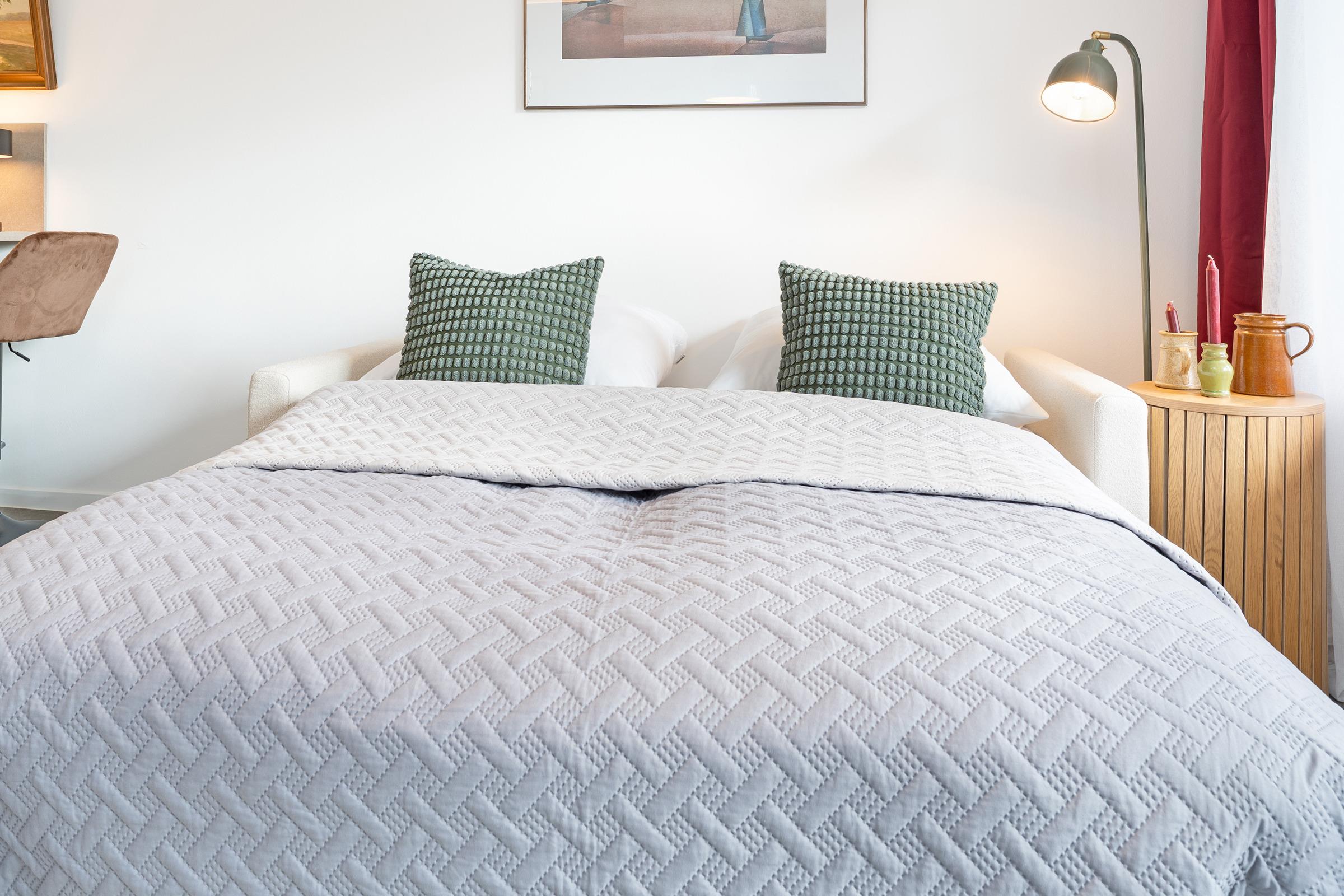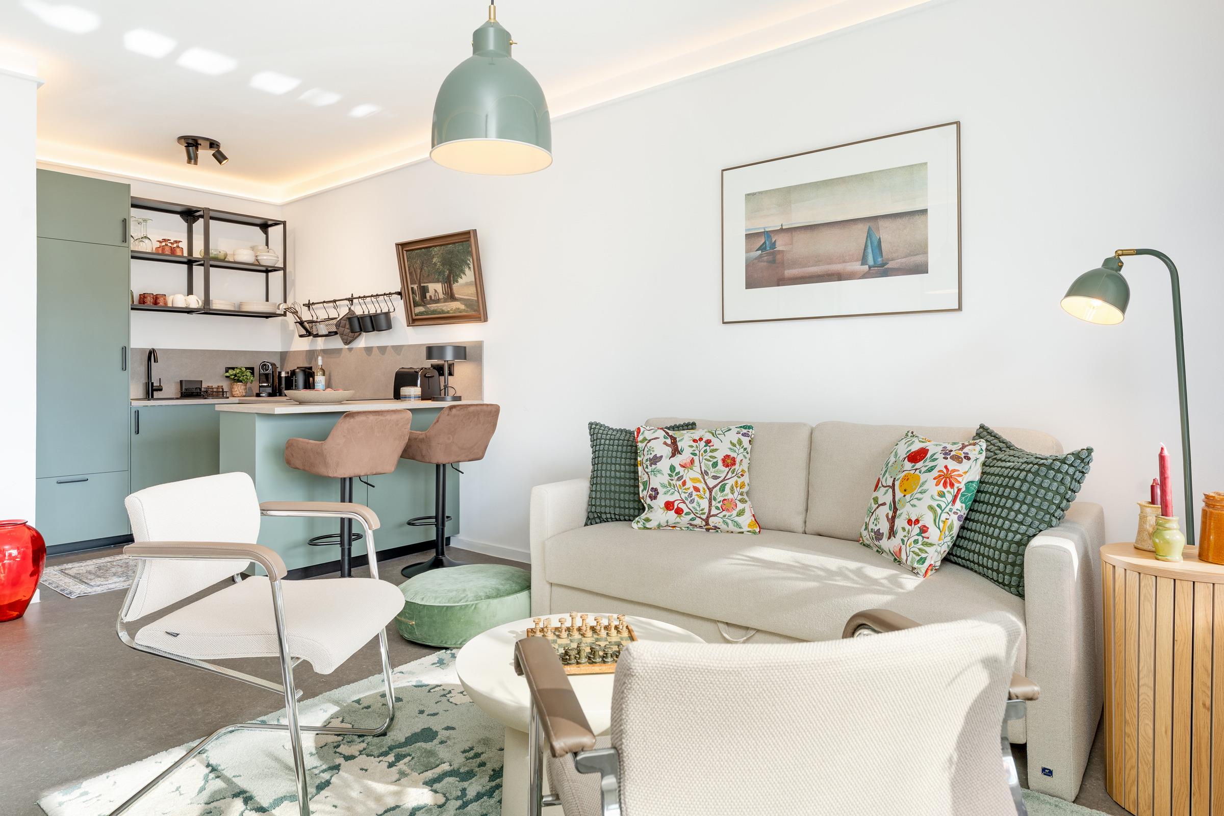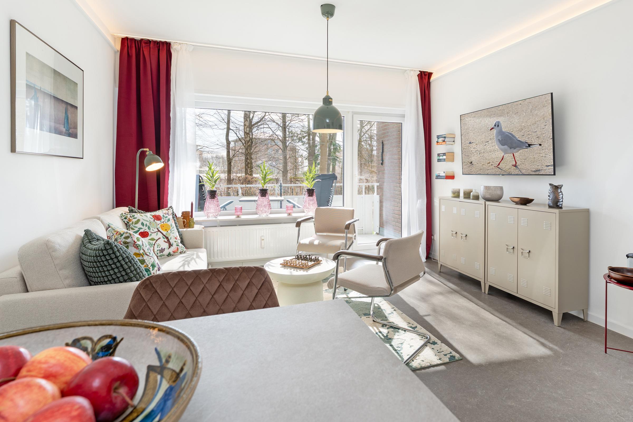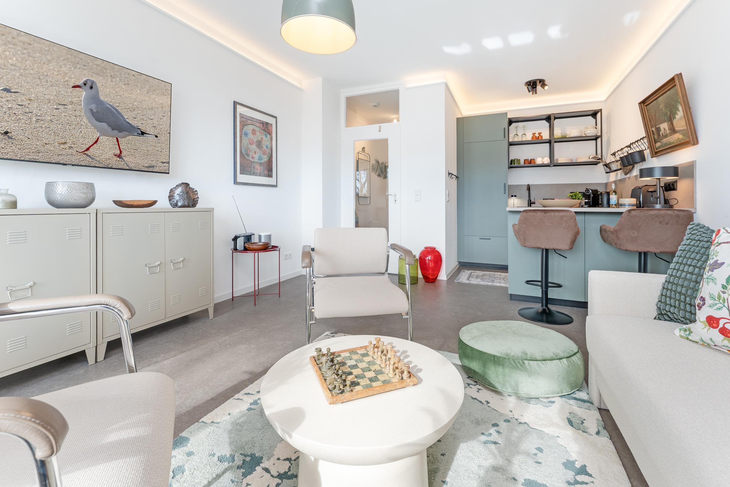 Der helle Wohnbereich vereint Wohnen, Schlafen und Entspannen. Ein komfortables Schlafsofa (160 x 200 cm) und Smart-TV sorgen für gemütliche Stunden. Von hier aus gelangen Sie auf den sonnigen Südbalkon mit Möbeln und Sonnenschirm. Zusätzlich steht ein Gemeinschaftsgarten mit Sandkasten zur Verfügung.