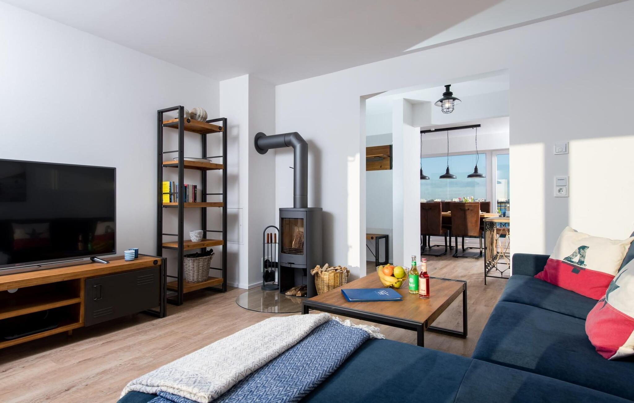 Kuschelig wird es im Wohnzimmer, denn hier lädt eine gemütliche Sitzlandschaft an Schietwettertagen zu einem Kaminabend ein. Für IndoorEntertainment sorgt außerdem der Smart TV mit Telekom Home Entertainment Programm.