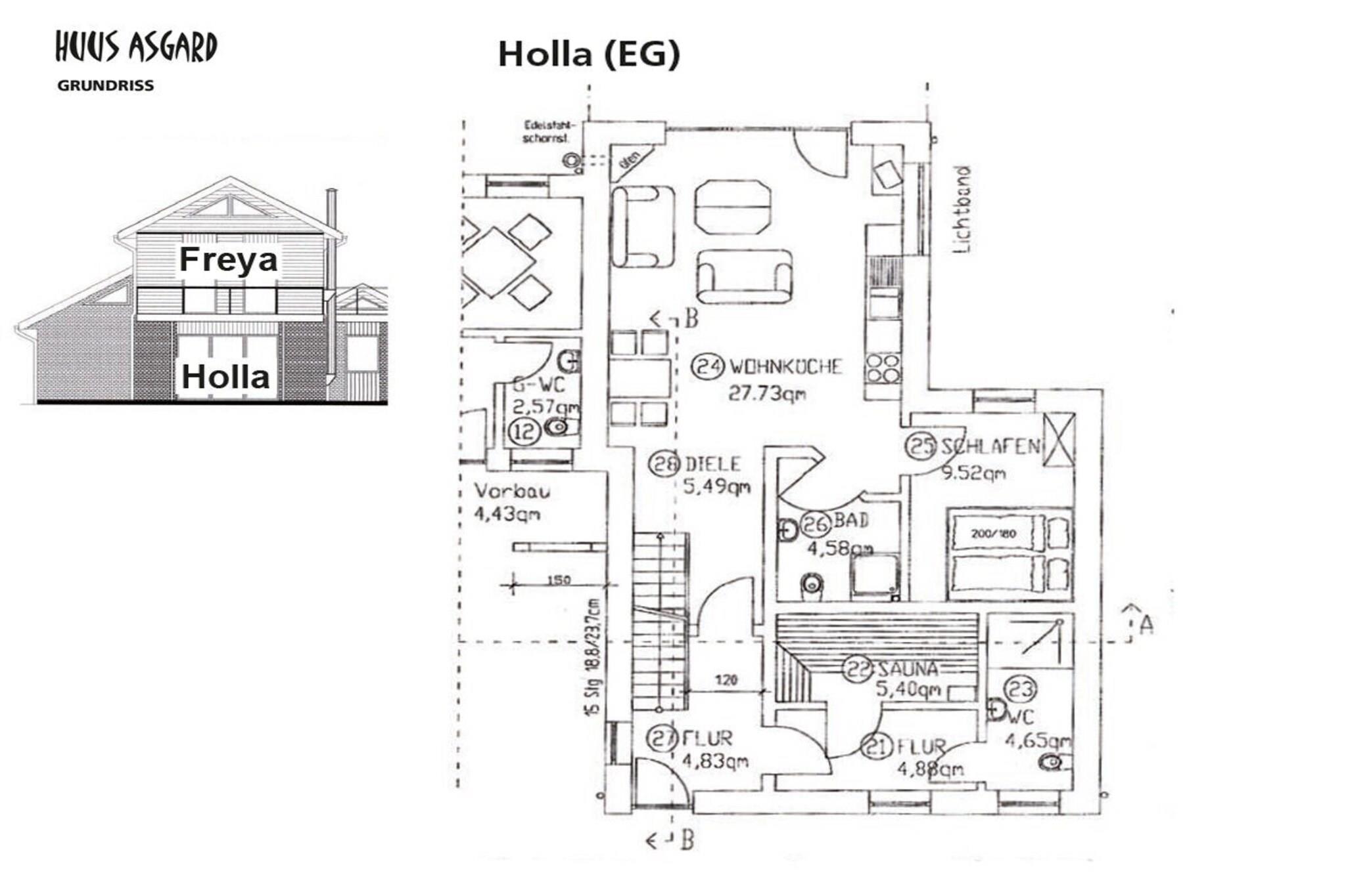 "Holla" befindet sich im EG, ist ca. 50 qm groß und bietet ausreichend Platz für 2 Personen. Der große Wohnraum mit offener Küche, Essplatz, Kaminofen und gemütlicher Sitzgruppe lädt zum Verweilen ein. Das Schlafzimmer ist zweckmäßig und mit einem mit Doppelbett ausgestattet. Auf der Terrasse befindet sich eine komfortable Sitzgruppe. Die Ferienwohnungen befinden sich in einem dritten Hausteil, der erst 2010 erbaut wurde. Dort ist auch die Sauna untergebracht, die den Gästen von Huus Asgard gegen Gebühr und nach Absprache zur Verfügung steht. PKW-Parkplätze auf dem Grundstück, E-Bike-Ladestation steht zur Verfügung.