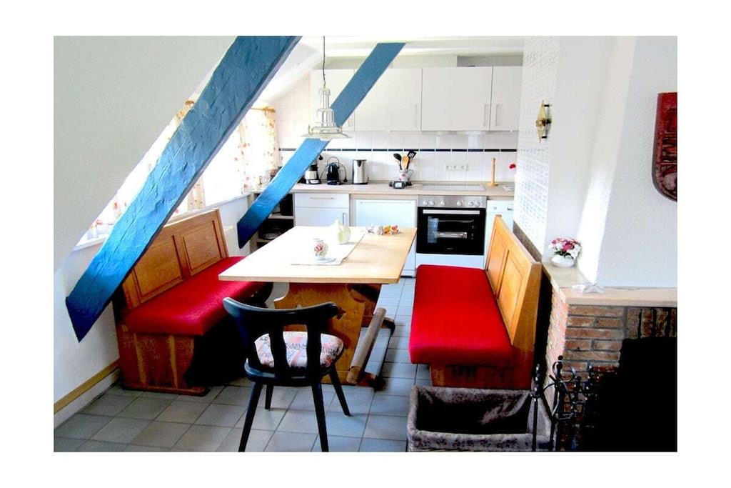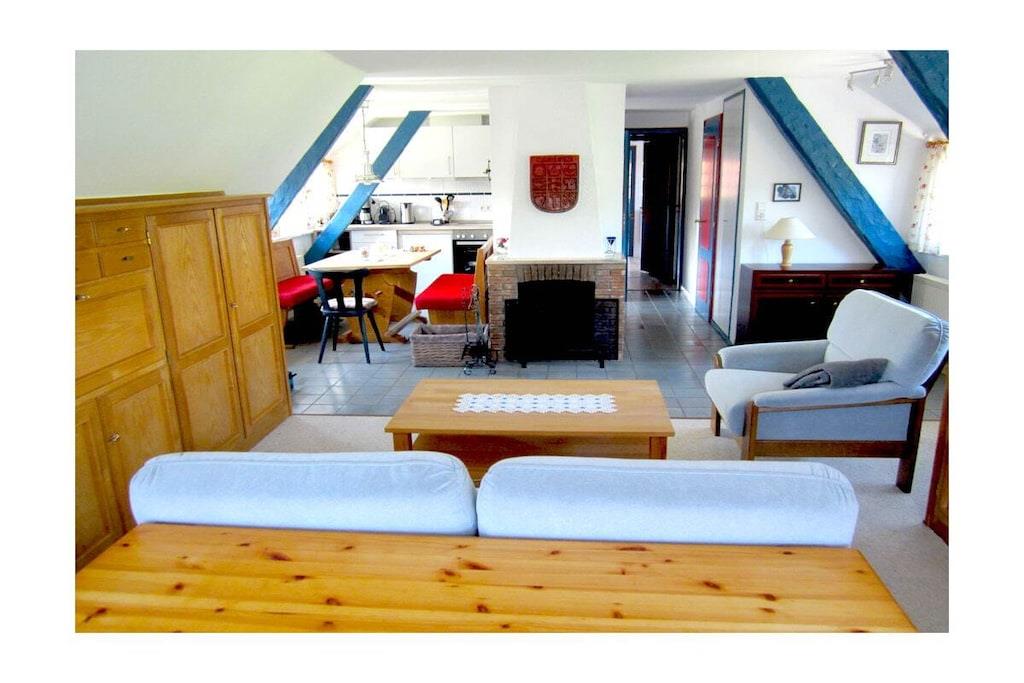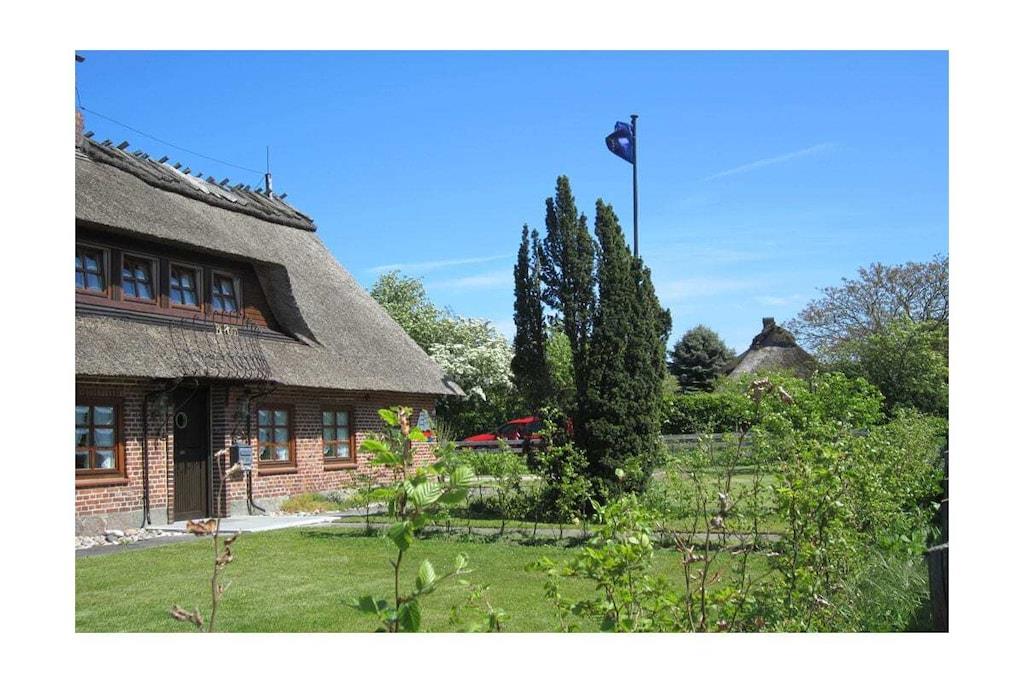 Die Ferienwohnung "GODEWIND" befindet sich im Dachgeschoss einer typischen Reetdachkate in Falshöft an der Ostsee. Die Ferienwohnung direkt unter dem Reetdach bietet auf ca. 100 qm viel Platz für 4 Personen. Die große Dachterrasse sowie ein gemütlicher großer Wohnraum und die voll ausgestattete Küche laden zu jeder Jahreszeit zum Verweilen ein. Von der großen Dachterrasse aus hat man einen wunderbar freien Blick auf die angeliter Landschaft. Über eine Außentreppe gelangt man in den Garten.