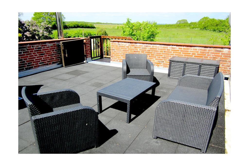 Genießen Sie die komfortable Ferienwohnung Godewind mit Dachterrasse und Blick auf die angeliter Landschaft in Falshöft an der Ostsee.