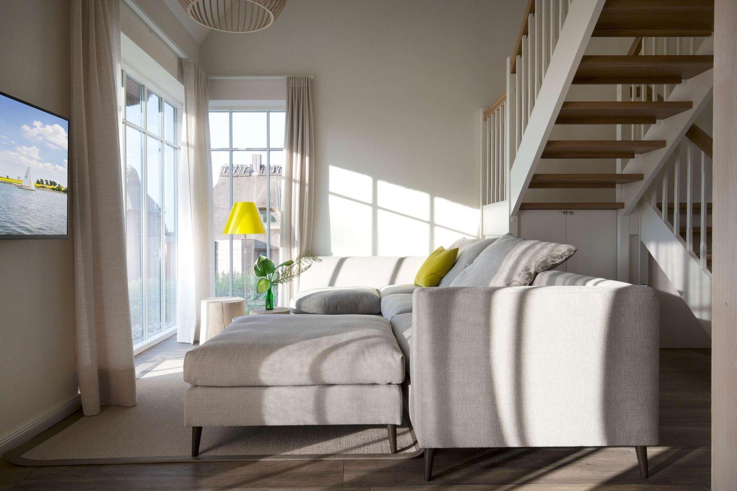 Modernes Reetdach-Doppelhaus nahe Ostsee mit Sauna und Seeblick für erholsame Ferien.