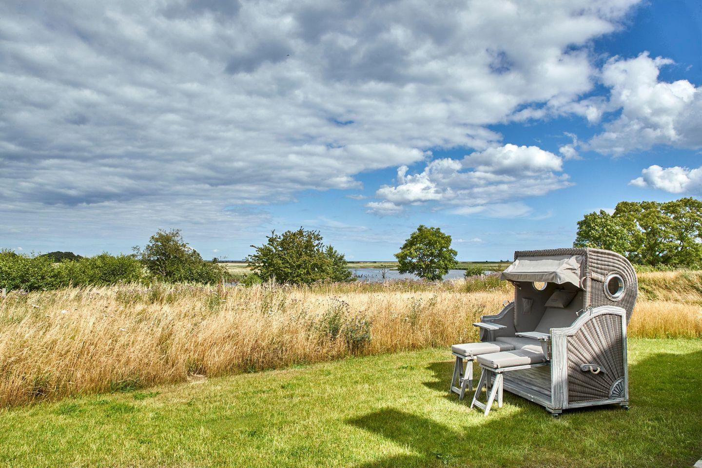 Auf 145 Quadratmetern Wohnfläche genießen Sie die Annehmlichkeiten der exklusiven Einrichtung in Ihrem Atelierhaus Mooreiche im Reetdorf Geltinger Birk. Kamin, Sauna und einer großzügigen Terrasse mit Teakholzsitzecke und eigenem Strandkorb sind nur einige Aspekte der Wohlfühl-Oasen in diesem 5-Sterne-Ferienhaus. Es verfügt über drei Doppel - und zwei Einzelzimmer mit drei Bädern, eines davon en-suite. Die unteren drei Schlafbereiche und zwei der Bäder sind frei von Schwellen und Hindernissen.
