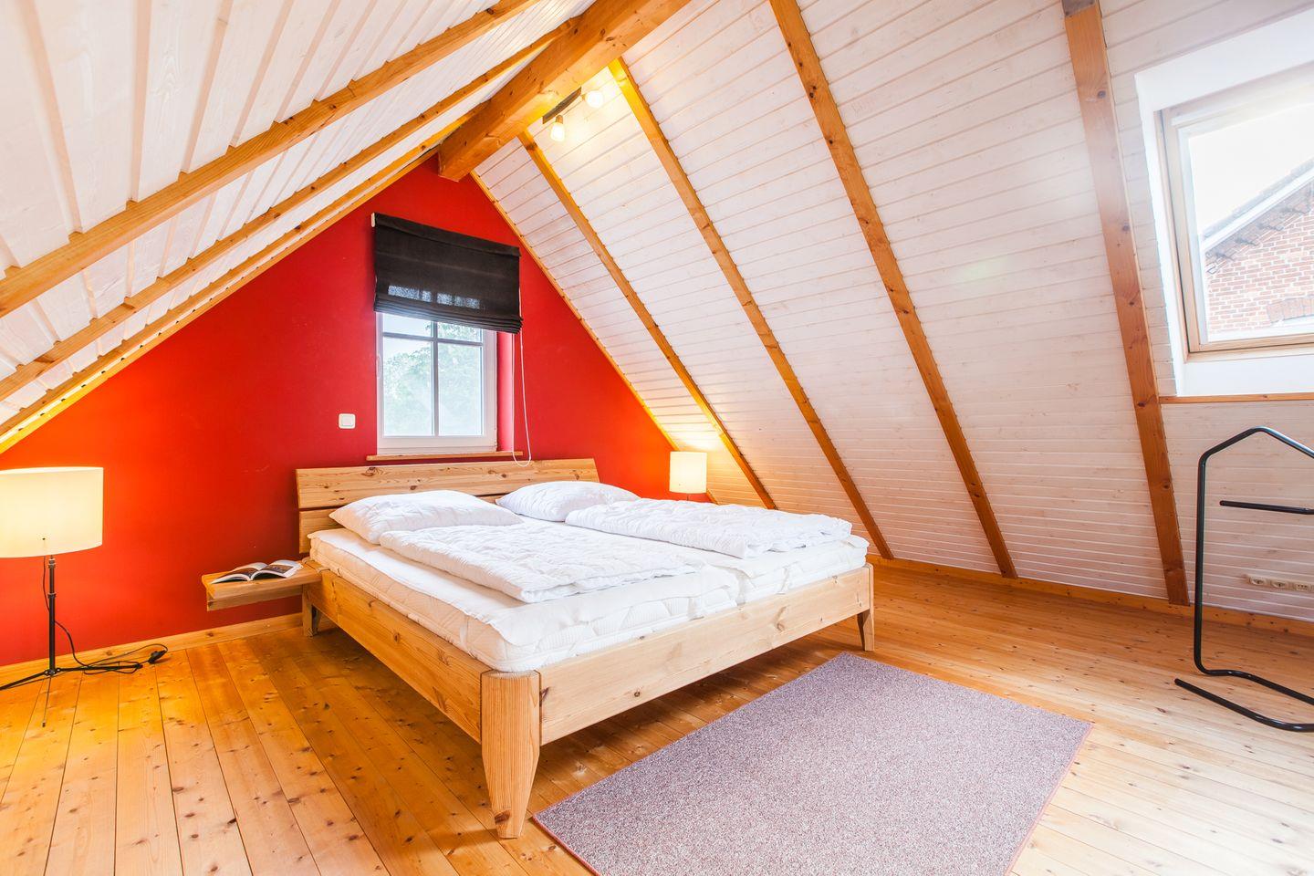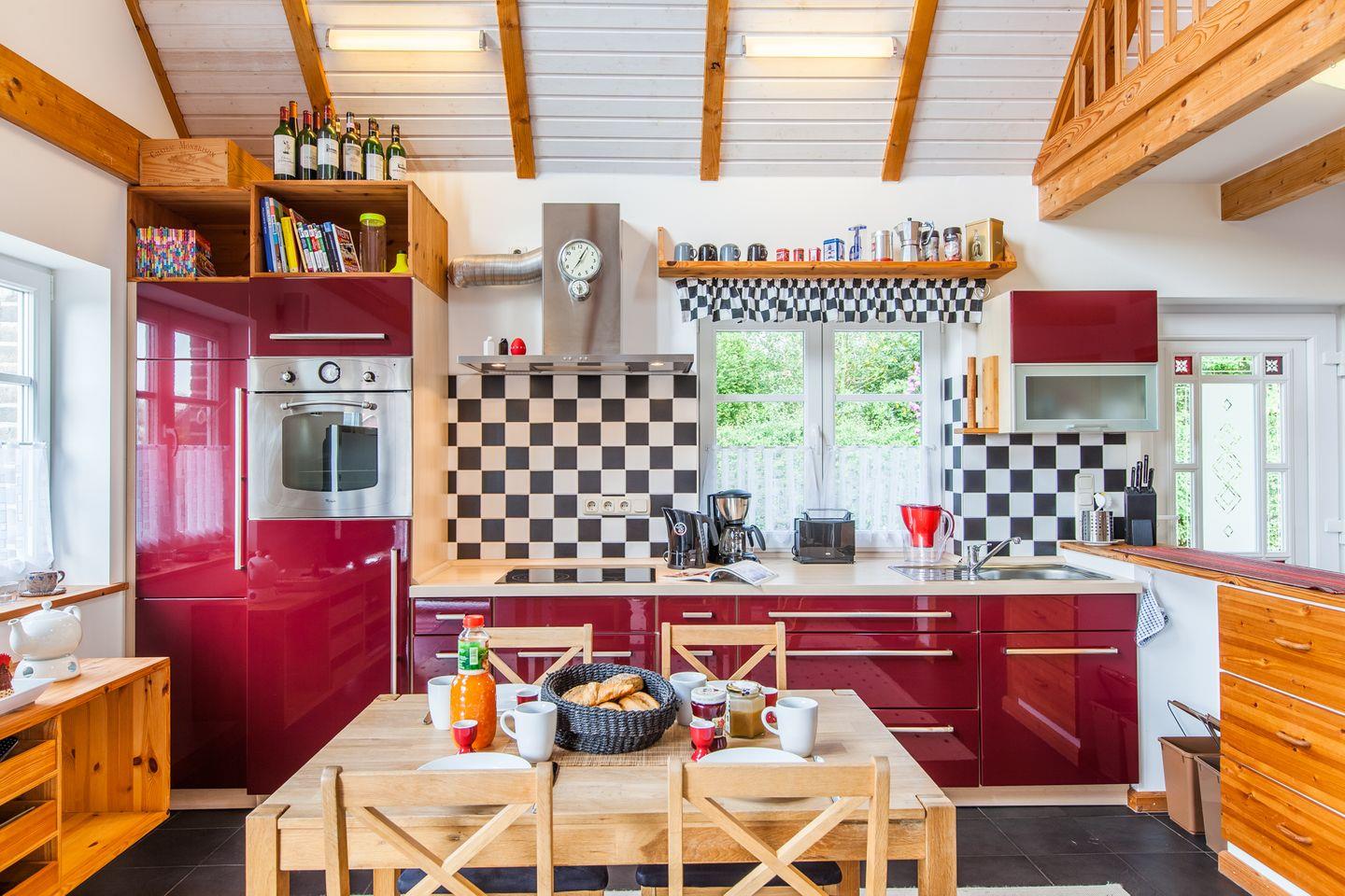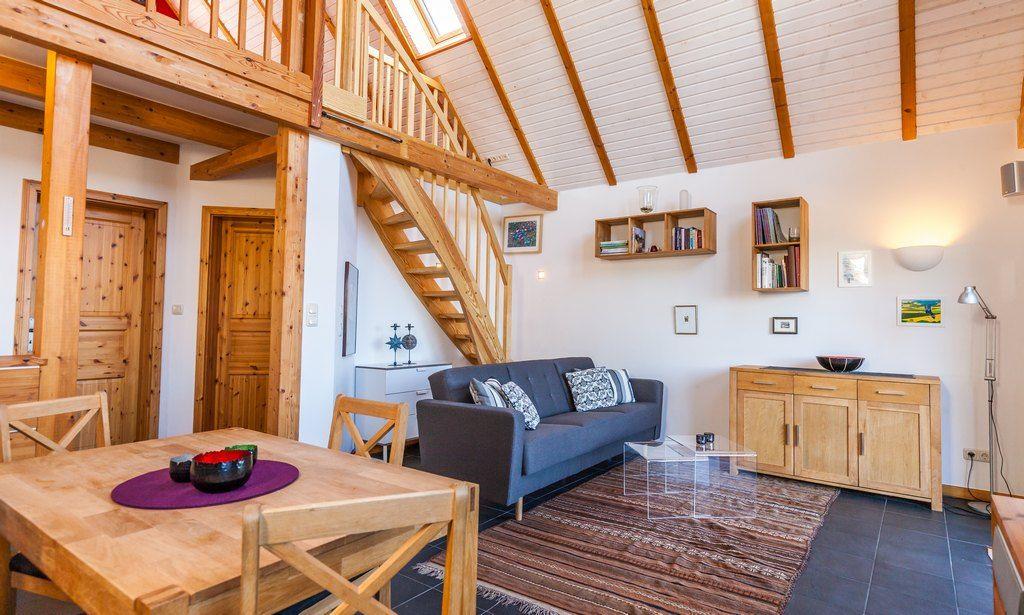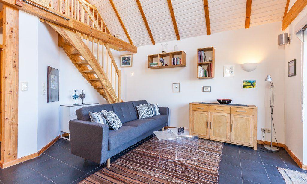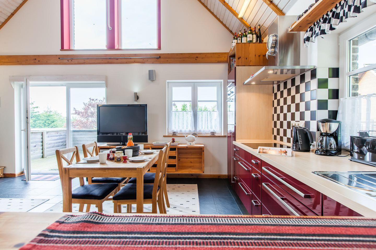 Im Haus finden Sie einen bis ins Dach offenen Wohnraum mit angrenzender Küche, ein Schlafzimmer mit Schlafcouch (140x200 cm), sowie ein helles, freundliches Badezimmer mit Dusche, Wanne und Handtuchtrockner.