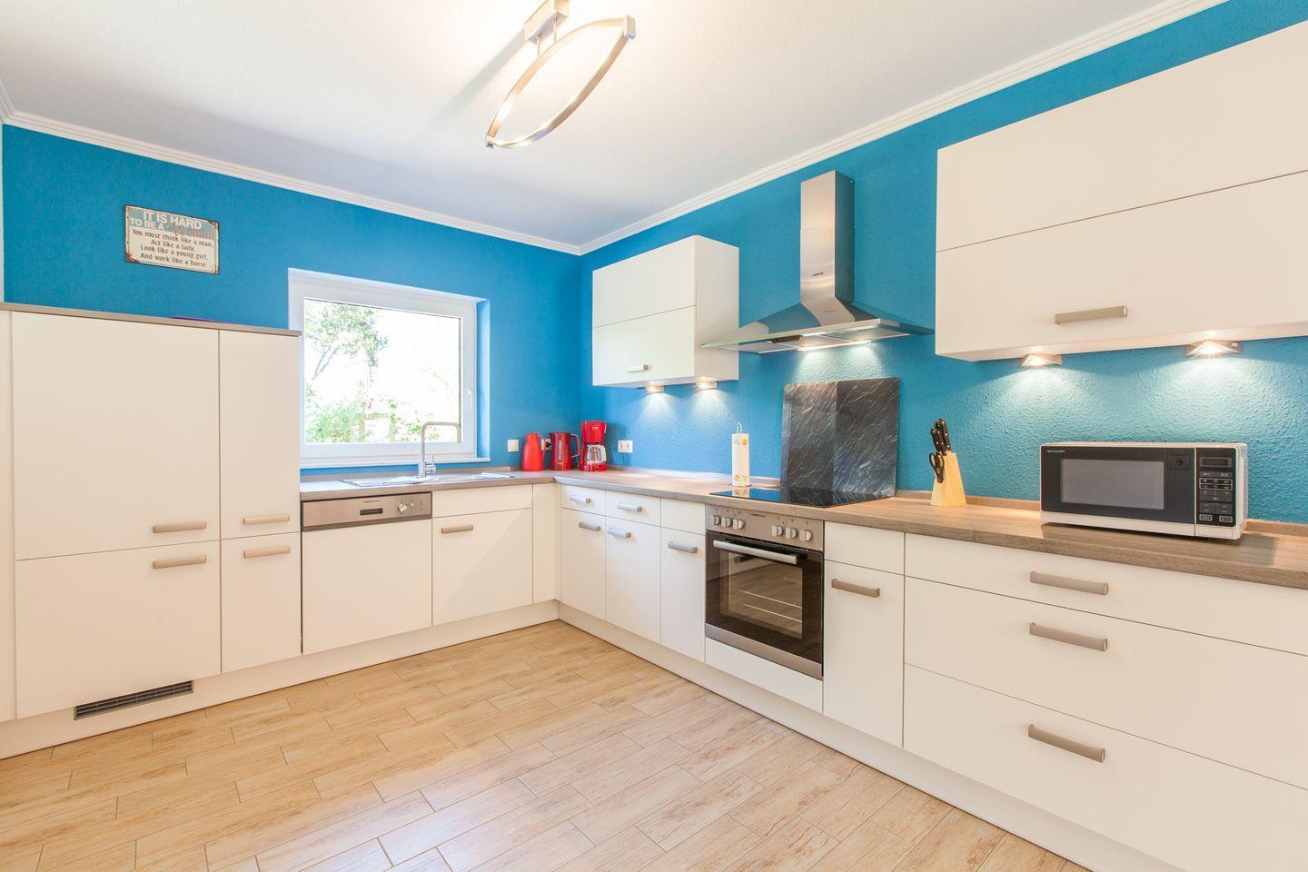 Die offene, moderne Küche schließt sich direkt dem Wohnzimmer an und lässt mit angrenzender Speisekammer und hochwertiger Ausstattung keinerlei Wünsche offen.