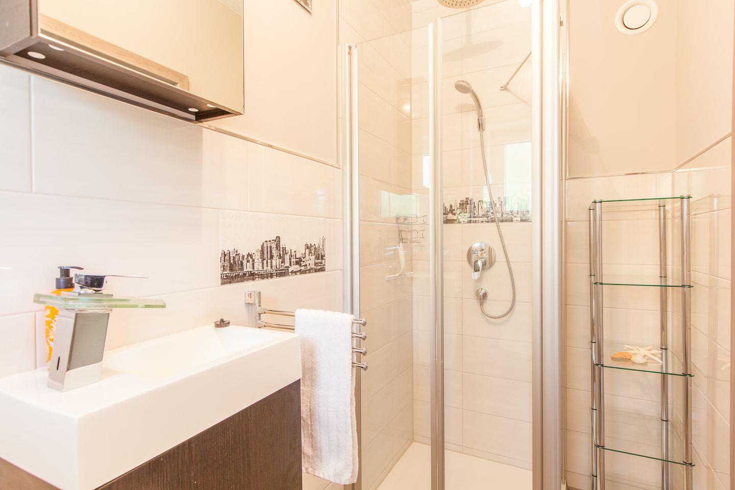 Das Badezimmer bietet neben der ebenerdigen Regendusche und dem Wandradio auch einen Handtuchtrockner und eine abgesenkte Badewanne. Das zweite Badezimmer ist ebenfalls mit einer Regendusche und Wandradio ausgestattet. Ihre Wäsche können Sie bei Bedarf im Hauswirtschaftsraum waschen.