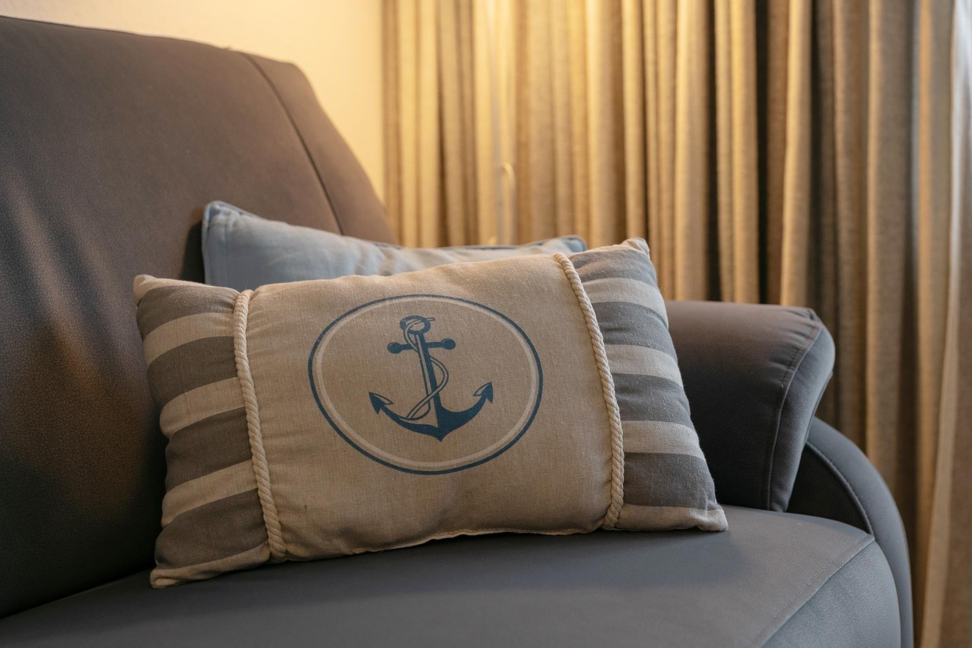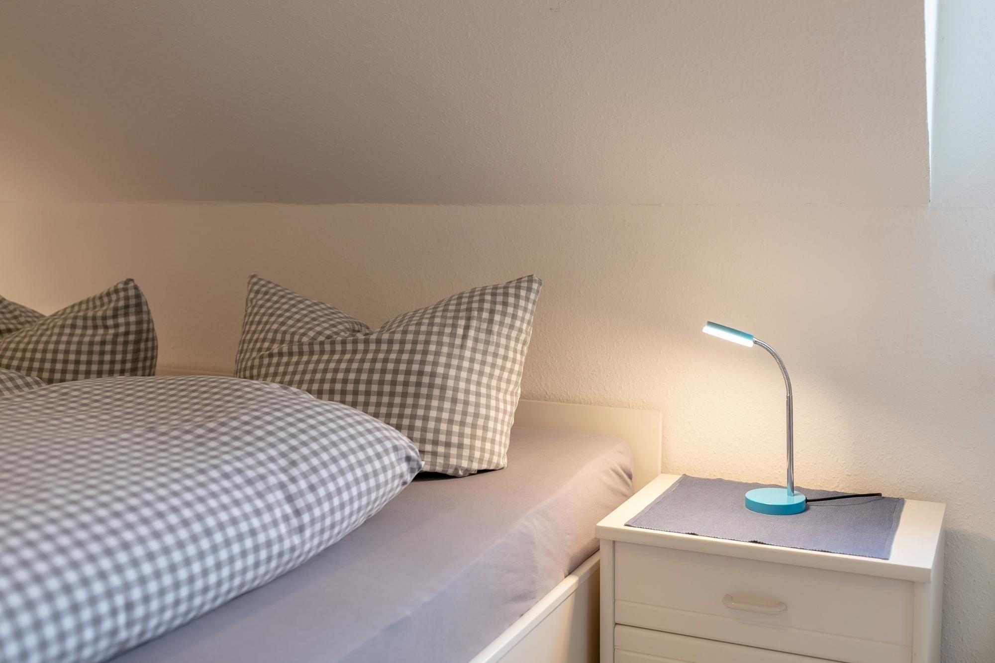 Es ist modern eingerichtet. Es gibt einen Schlafraum mit einem Doppelbett (2x 90x200 cm), in dem bei Bedarf für ein Kind ein Zustellbett (90x200 cm) aufgestellt werden kann und einen Schlafraum mit zwei Einzelbetten (je 90x200 cm).