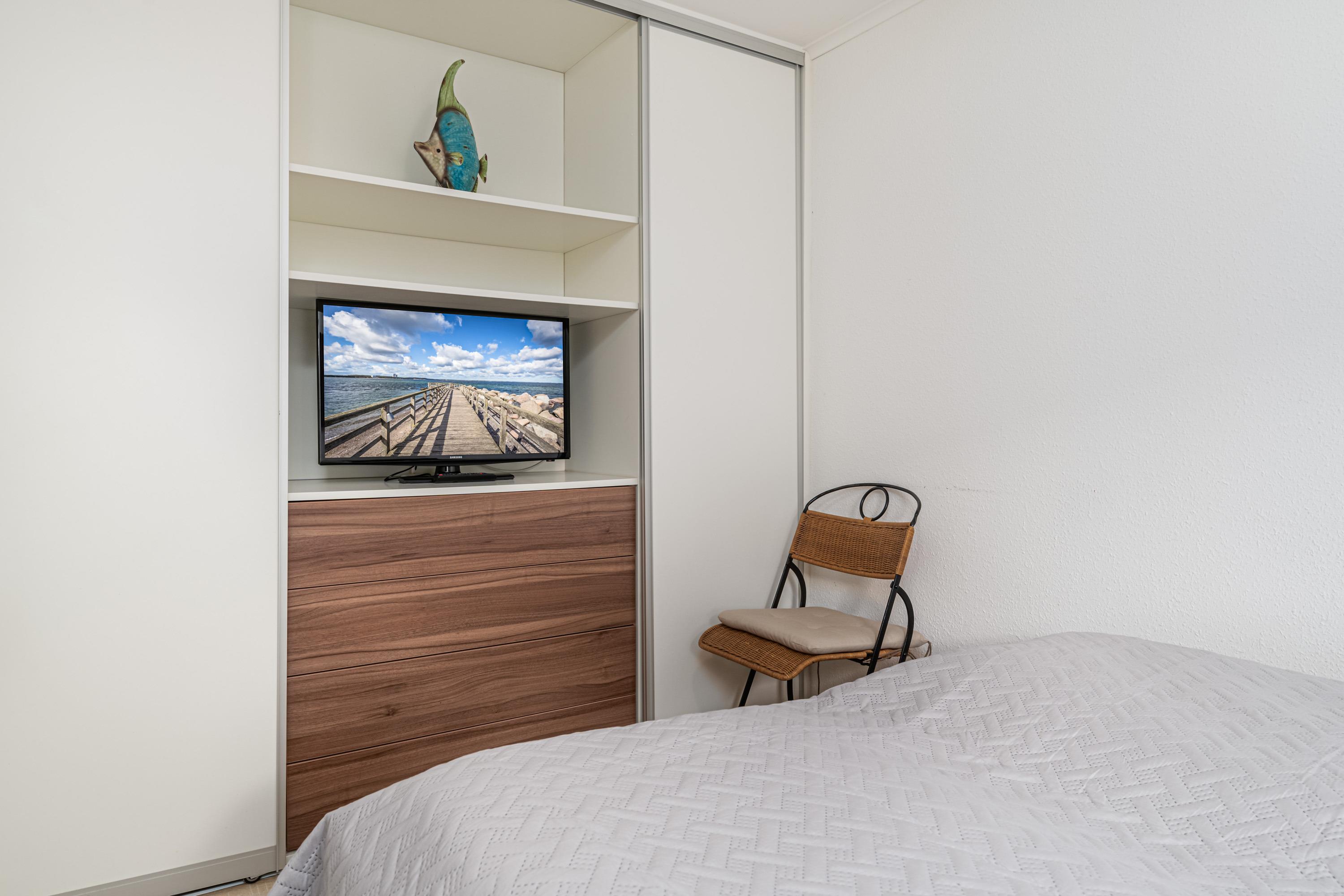 In dem gemütlichen Wohnbereich steht Ihnen neben einer großen Couch und einem Flatscreen-TV auch eine vollausgestattete Küchenzeile mit Essecke zur Verfügung. Das Schlafzimmer mit Doppelbett (2 x 80 cm x 200 cm) bietet Ihnen einen weiteren Fernseher und eine Verdunklungsmöglichkeit durch Außenrollläden. Das helle Badezimmer verfügt über eine ebenerdige Dusche. Aus dem Wohnbereich gelangen Sie auf eine hübsche Terrasse mit Südausrichtung und den Garten.