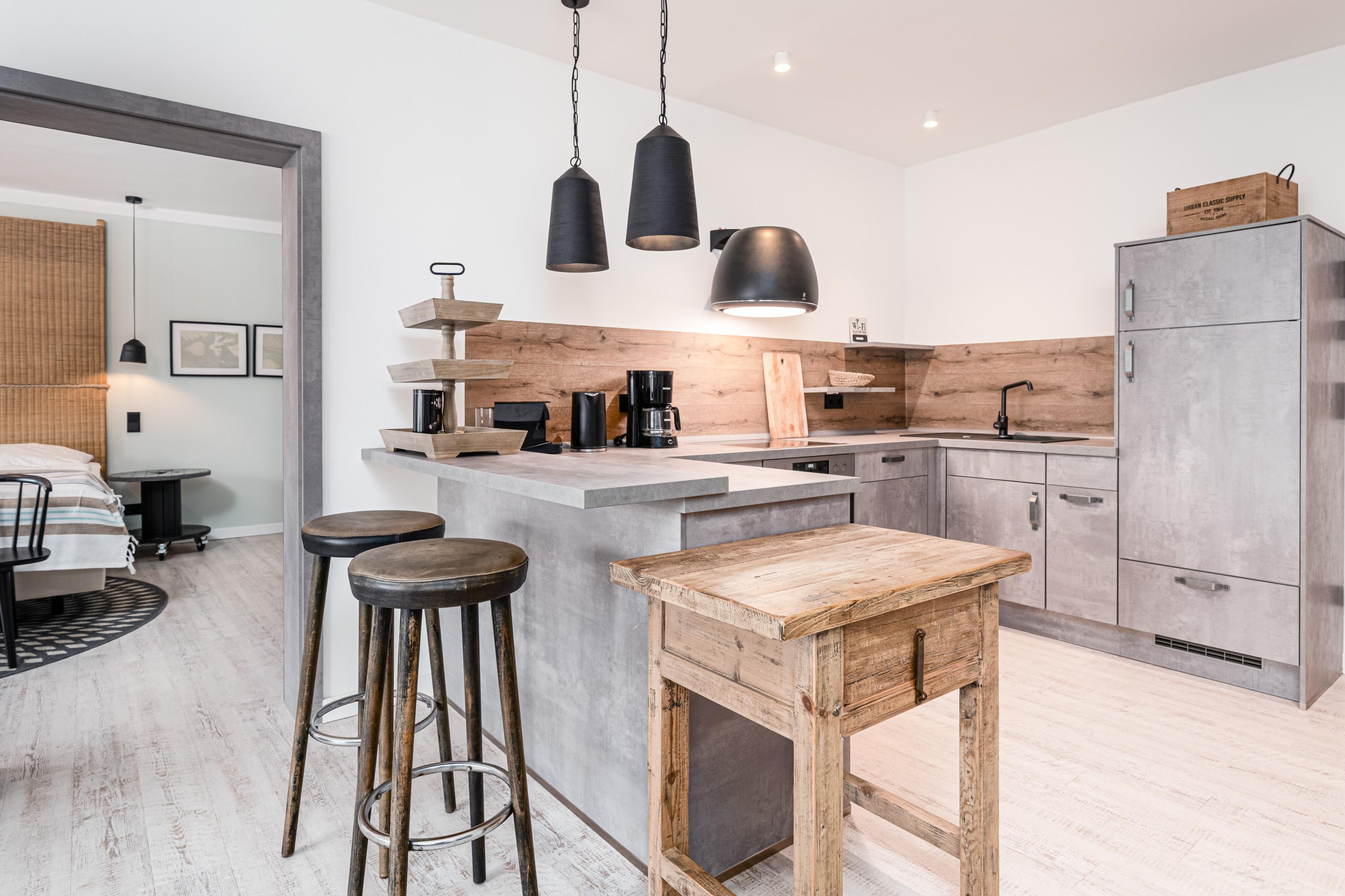 Der Wohn- und Essbereich mit integrierter offener, voll ausgestatteter Küche mit Backofen, Induktionsherd, Geschirrspüler und allen weiteren Dingen, die Sie zum Zubereiten toller Speisen benötigen, lädt zum Kochen ein.