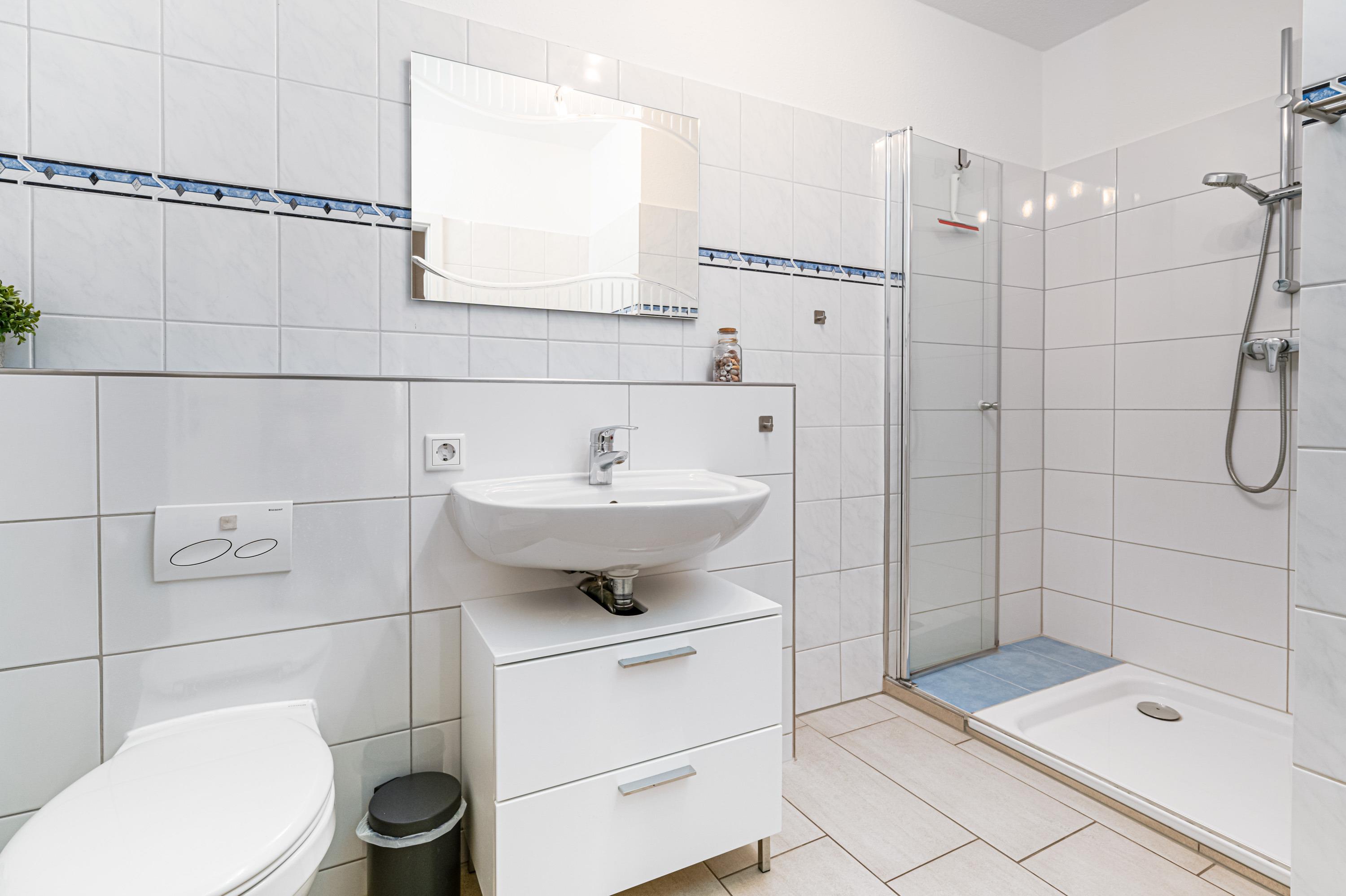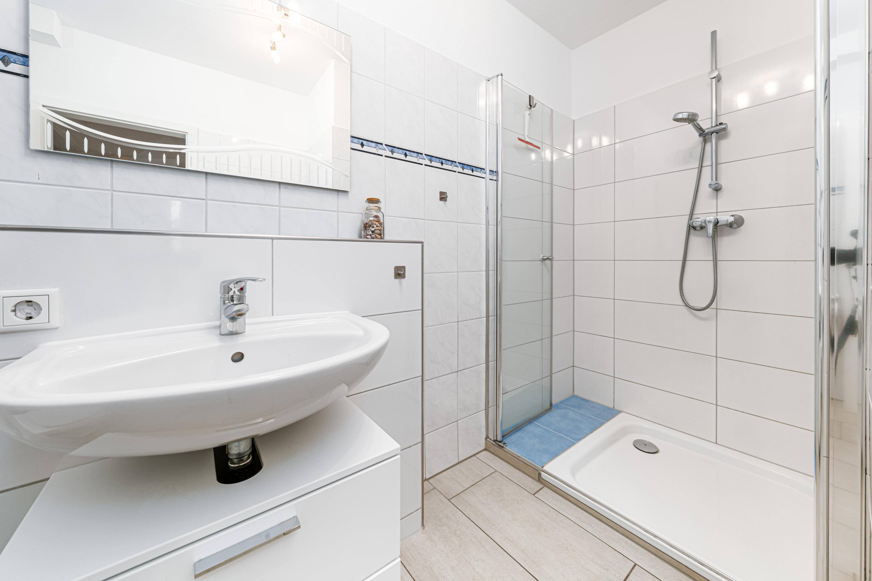 Zur Erfrischung steht ein hell gefliestes Badezimmer mit Dusche mit niedrigem Einsteig zur Verfügung.