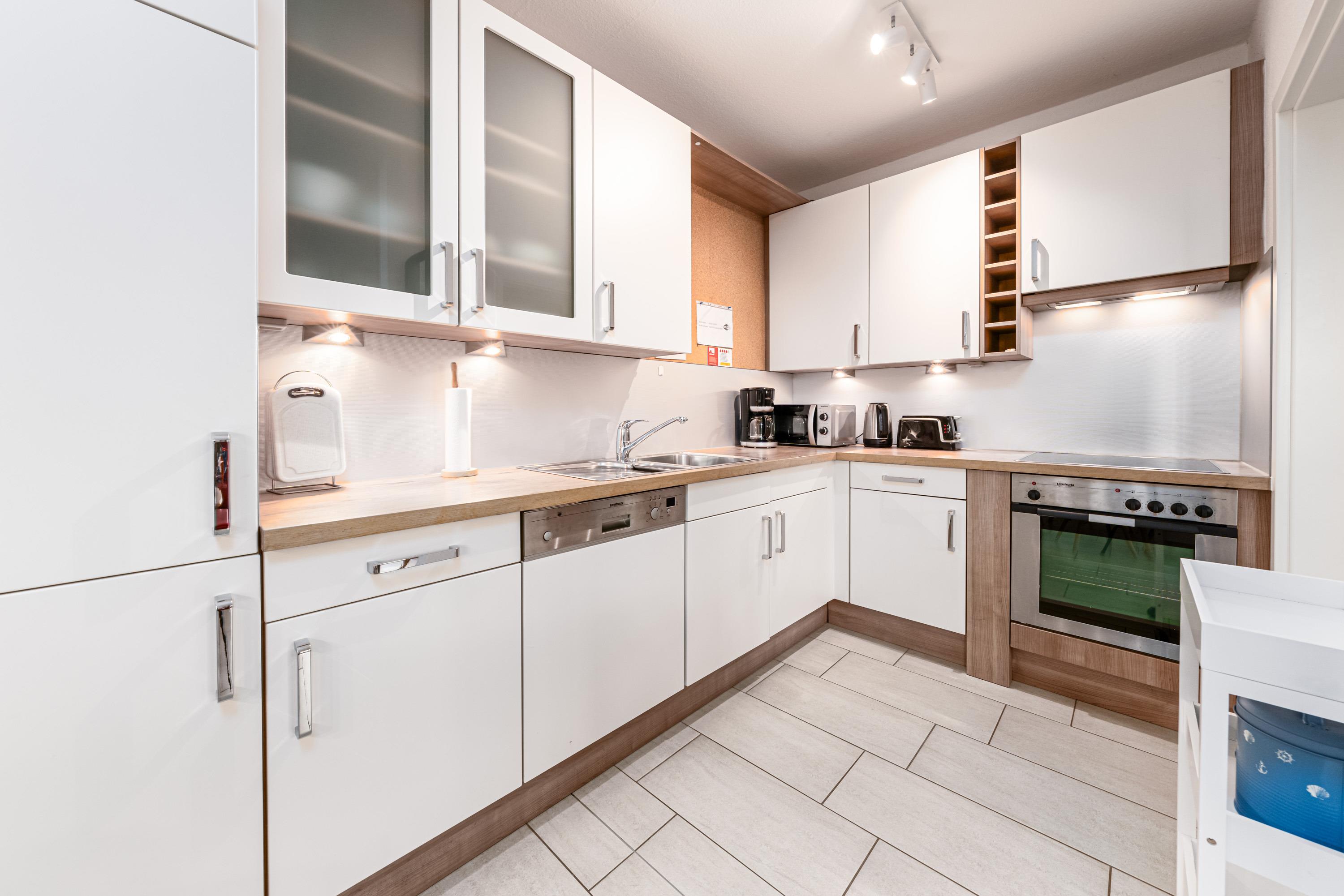 Es erwartet Sie ein großer Wohnraum mit bequemer Couch und Kabel-TV, ein Essbereich und integrierter Einbauküche. Die Küche ist mit einem Geschirrspüler und Backofen komfortabel ausgestattet und bietet für gemeinsame Kochsession's viel Platz. Im Wohnraum befindet sich auch ein vollwertiges Wandklappbett mit Federkernmatratzen (2 x 90cm x 200cm).