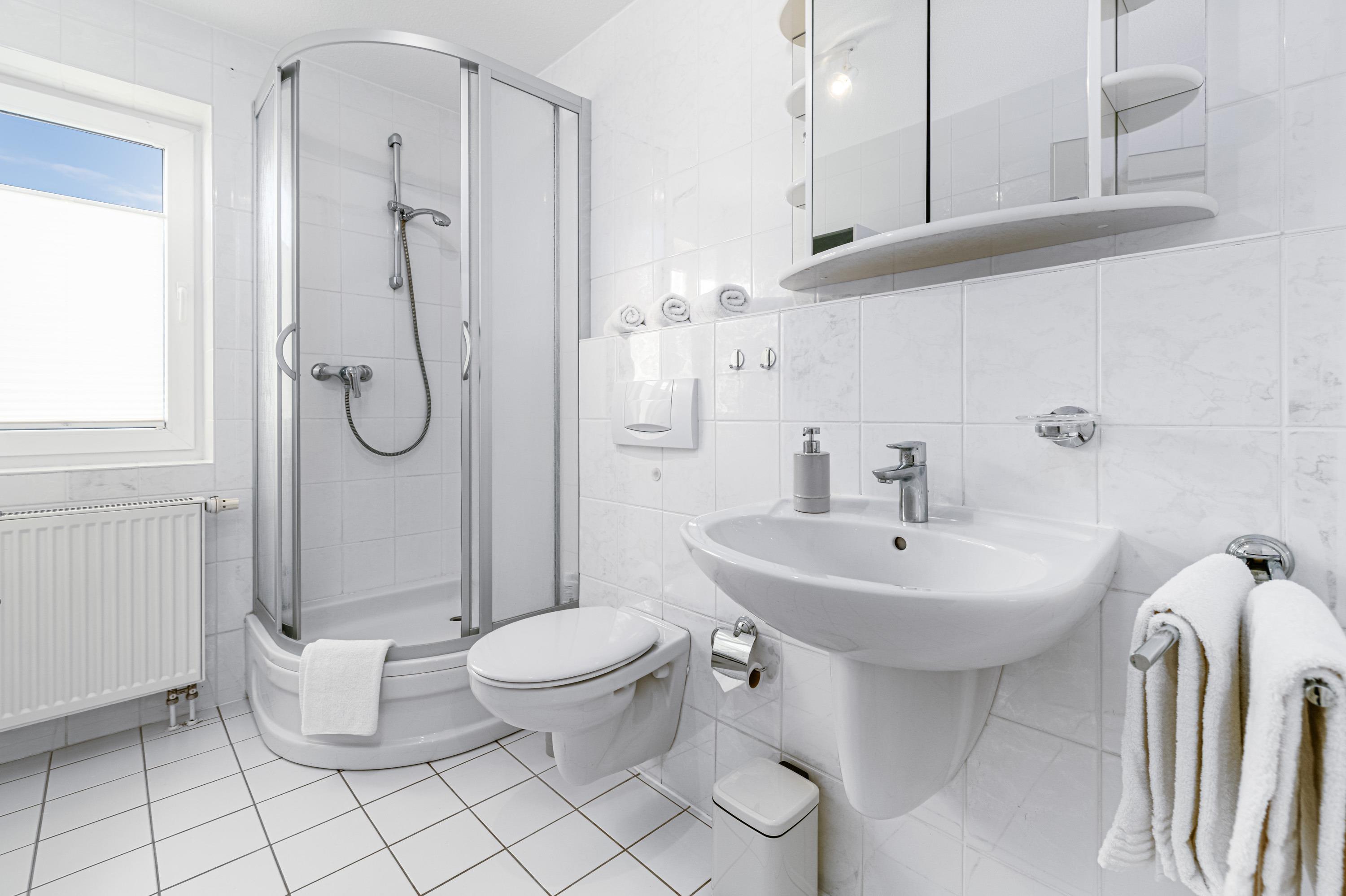 Das Badezimmer verfügt über ein Dusche, WC sowie einen Föhn. Hier erfrischen Sie sich nach einem erlebnisreichen Urlaubstag.