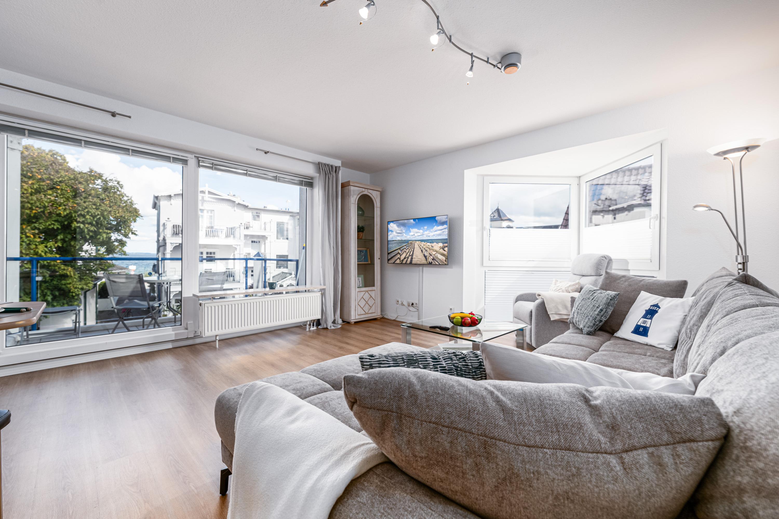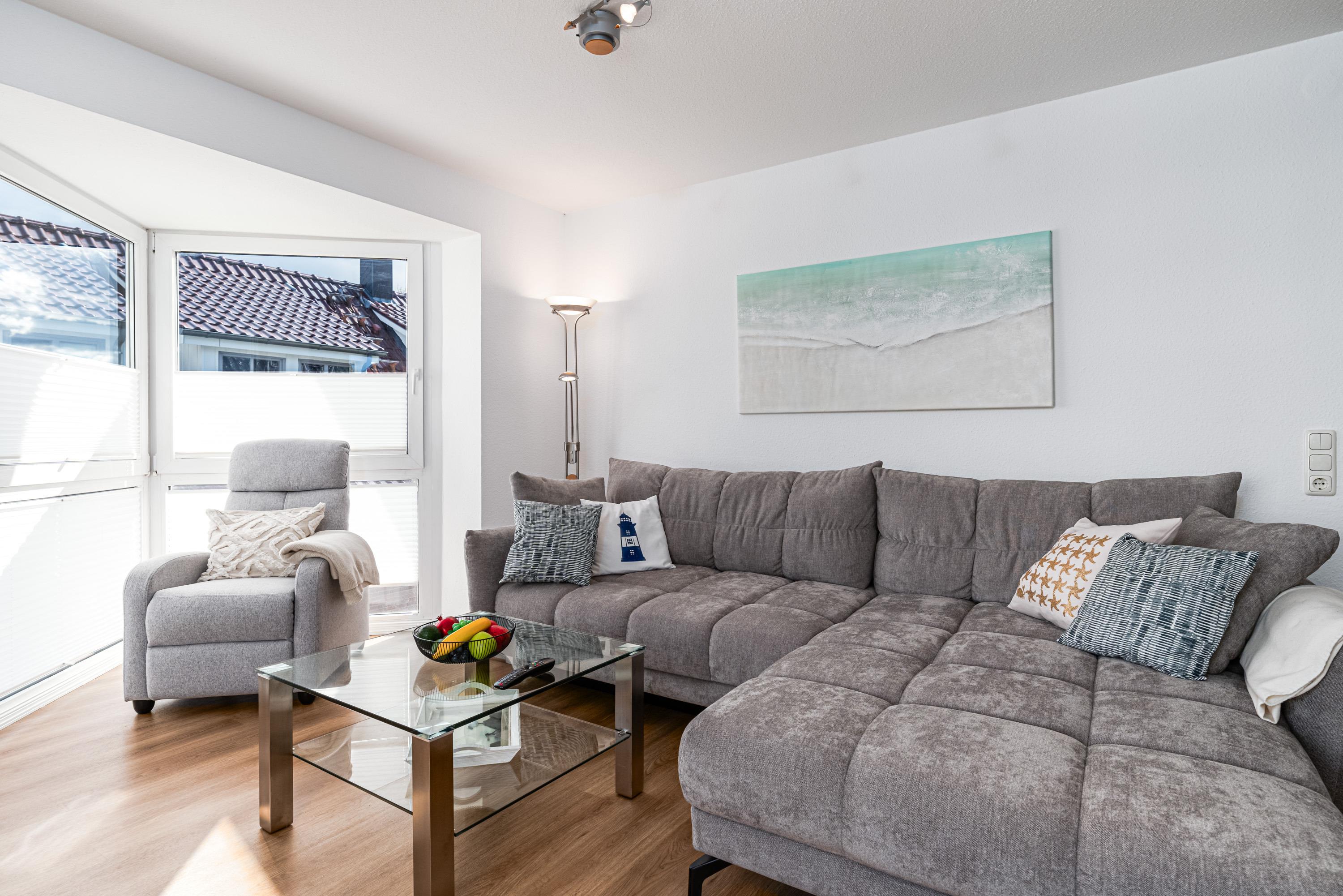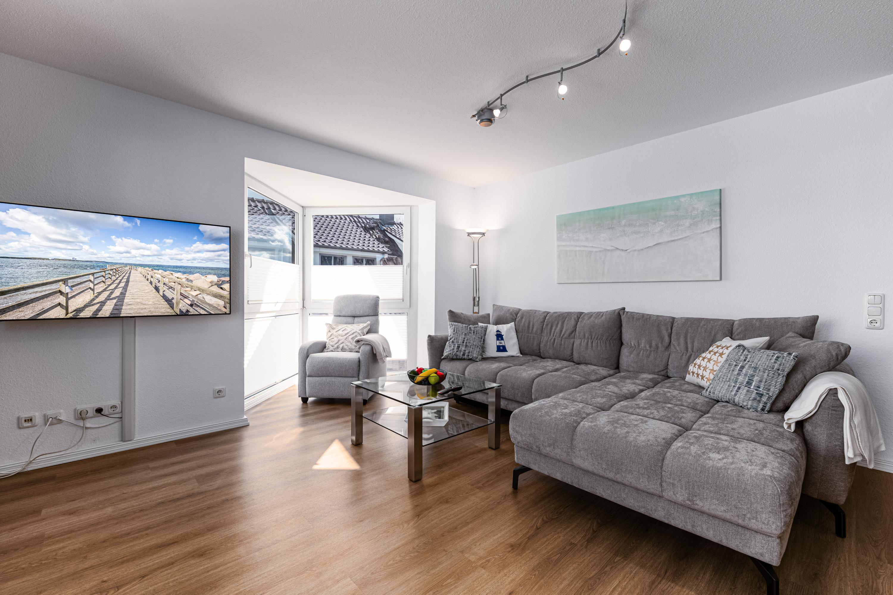 Es erwartet Sie ein großer und lichtdurchfluteter Wohnraum mit bequemer Schlafcouch, einem Essbereich und integrierter Einbauküche, der sich besonders gut für gemeinsame Kochsession's eignet. Des Weiteren steht für Sie ein Smart-TV mit integriertem Radio für Sie zur Nutzung bereit.