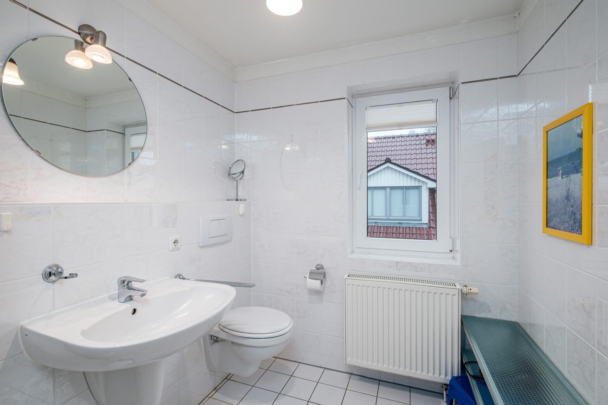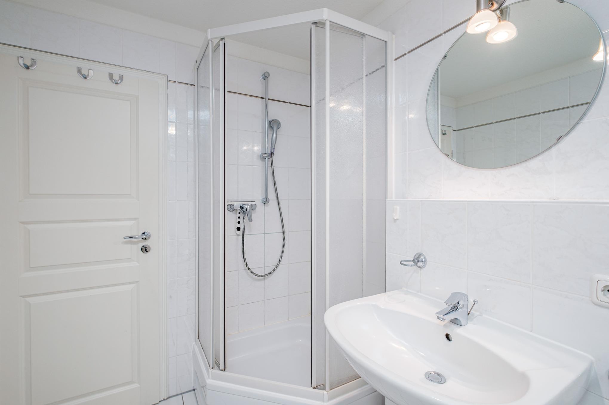 Das helle Badezimmer ist mit einer Dusche, WC und Fön eingerichtet.