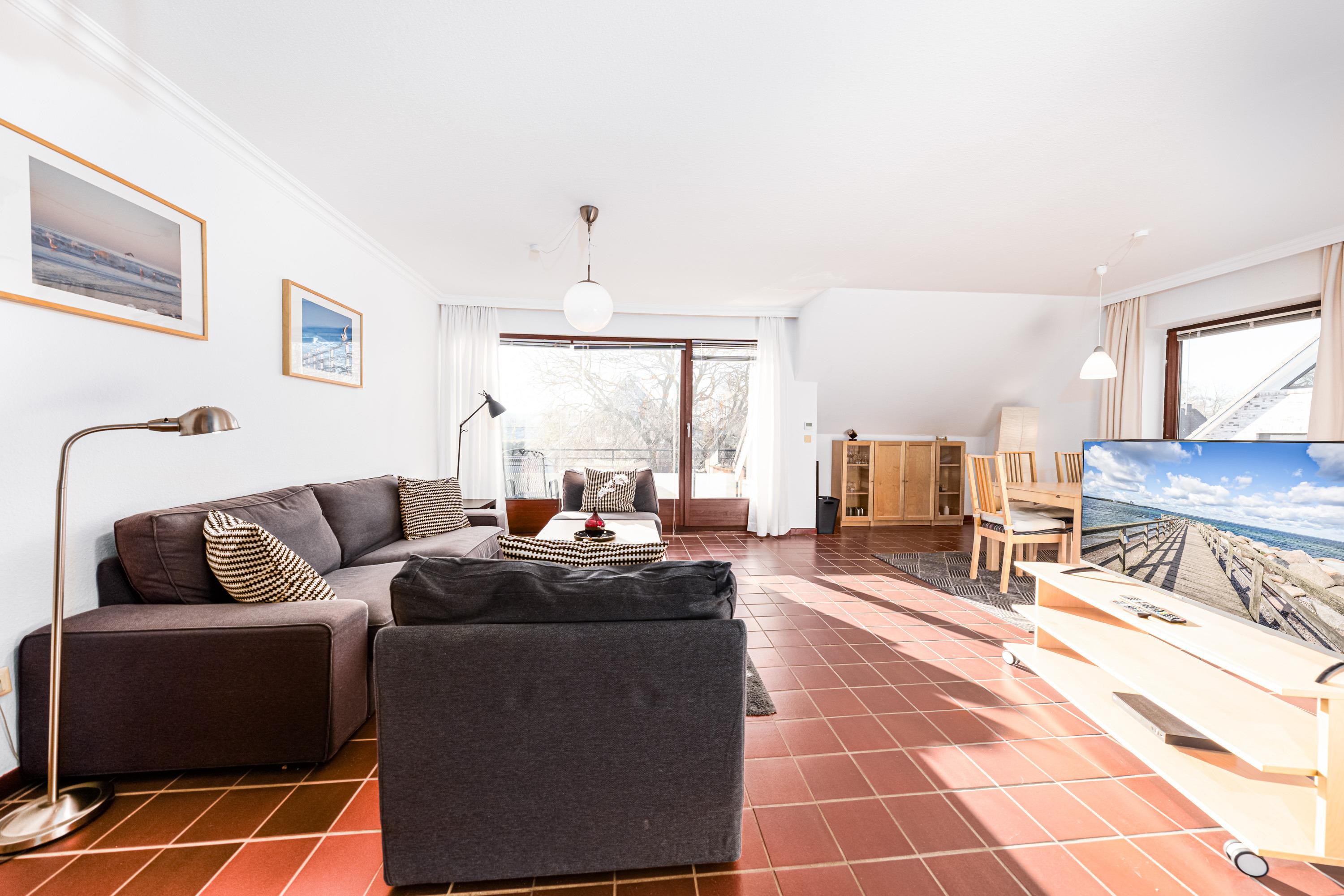 Der große Wohnraum verfügt über eine bequeme Sofagarnitur mit TV und einen großzügigen Essbereich. Hier können Sie auch ausgelassene Spielesessions mit der ganzen Familie genießen. Von hier aus betreten Sie auch den schön ruhig gelegenen Balkon, auf dem Sie die Sonne und die frische Ostseeluft in vollen Zügen genießen können. Die separate Küche ist mit einem Backofen, Mikrowelle und einem Geschirrspüler gut ausgestattet und lädt zum gemeinsamen Kochen ein.