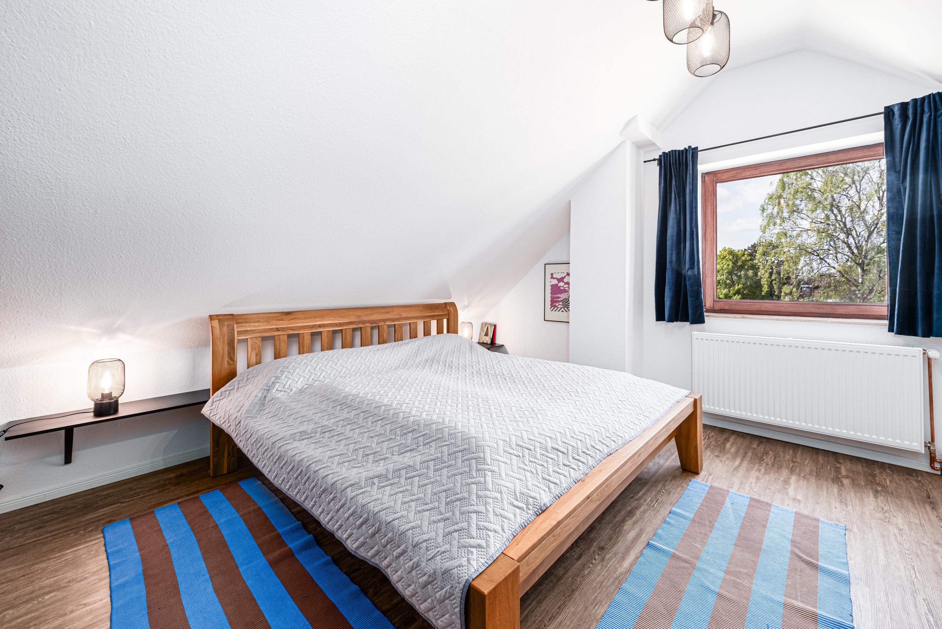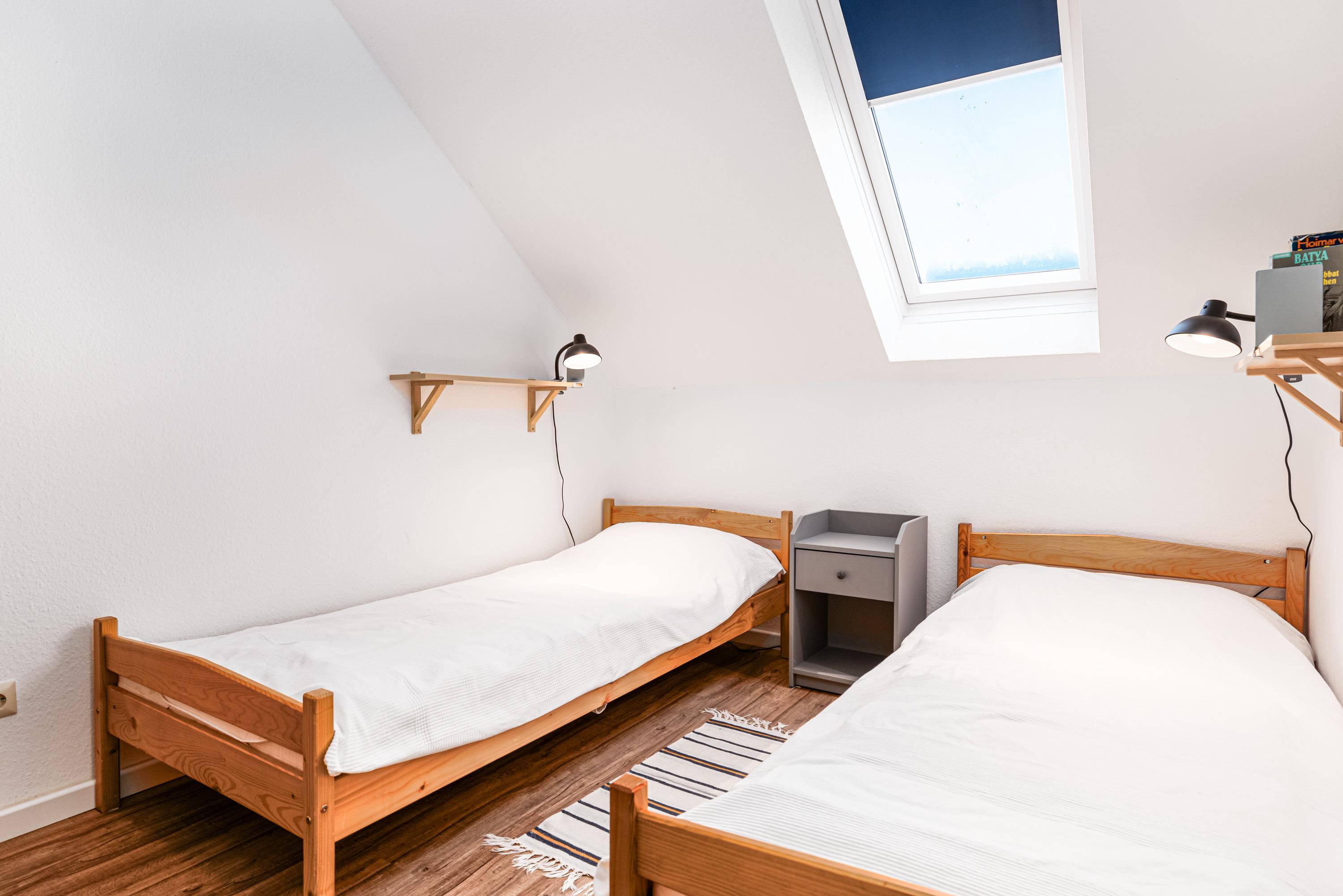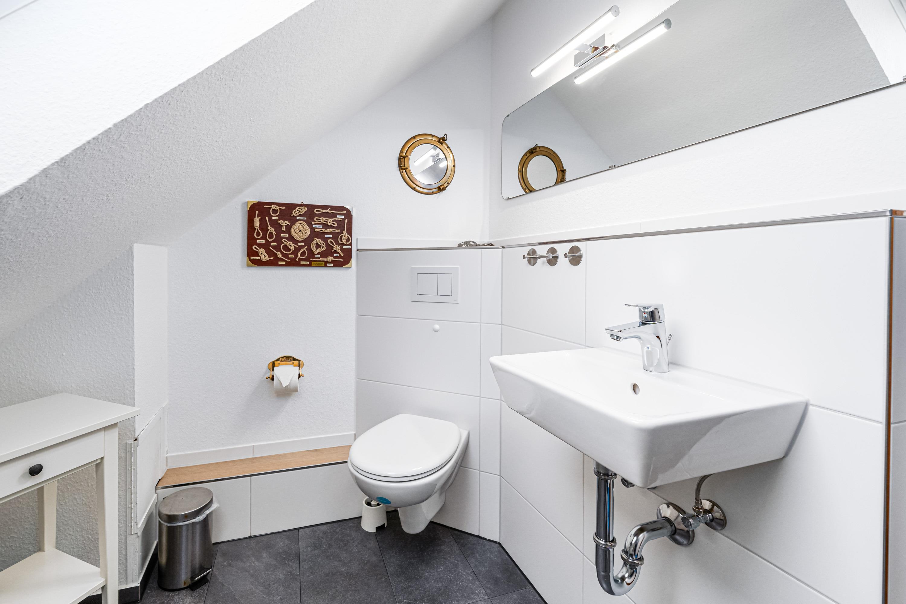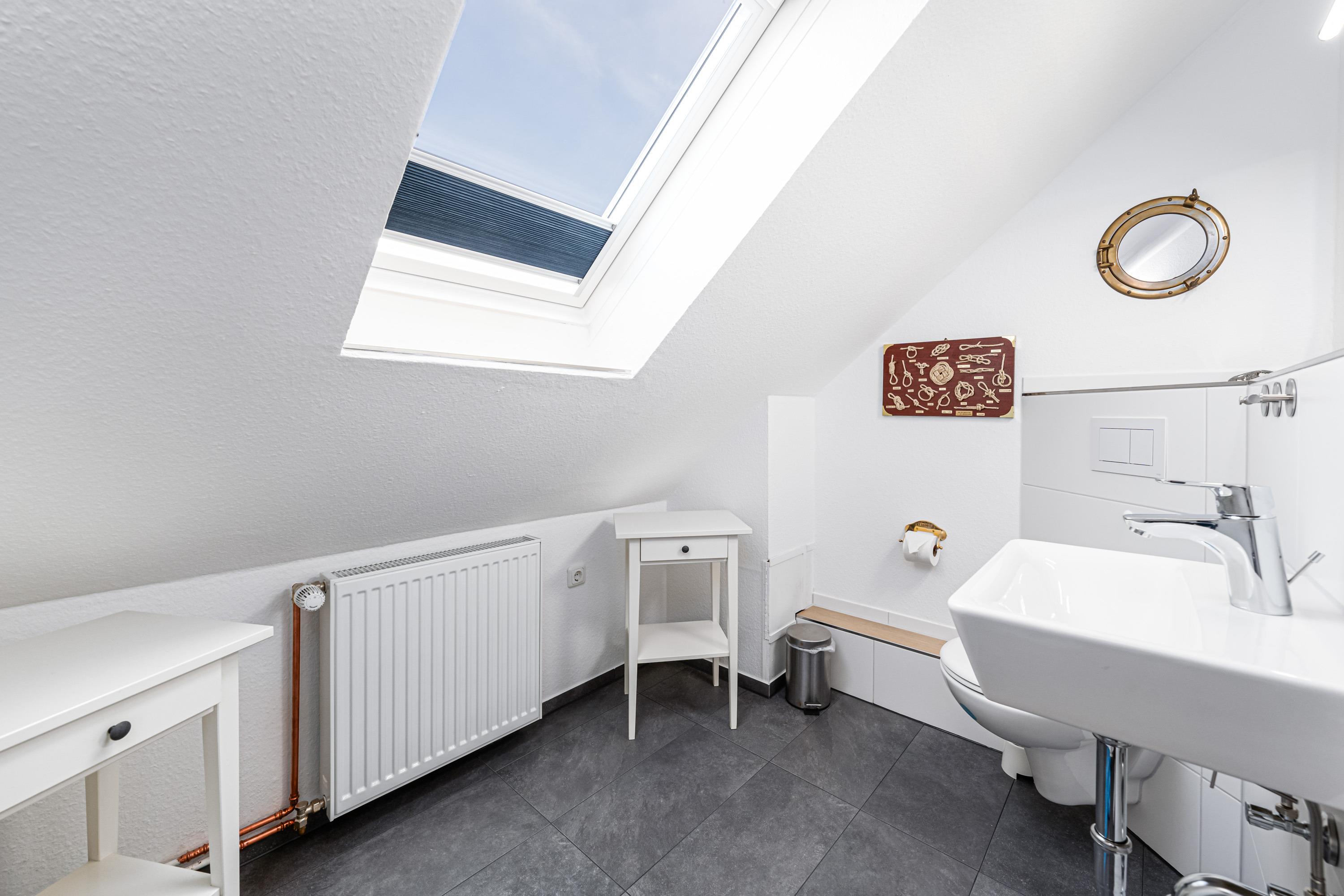 Zusätzlich befindet sich auf der unteren Ebene ein Badezimmer mit Badewanne und Waschmaschine sowie ein Schlafzimmer mit zwei Einzelbetten. Auf der oberen Etage steht Ihnen ein weiteres Schlafzimmer mit großem Doppelbett sowie einem Einzelbett und ein Gäste-WC zur Verfügung.