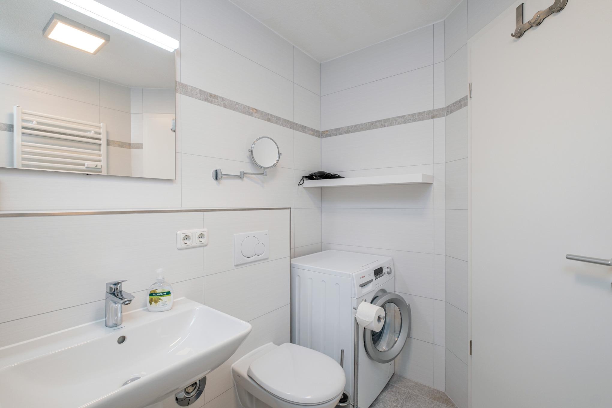 Das helle Badezimmer verfügt über eine bodengleiche Dusche, WC, Fön und einen Kosmetikspiegel. Auch eine Waschmaschine steht hier zur Nutzung bereit.
