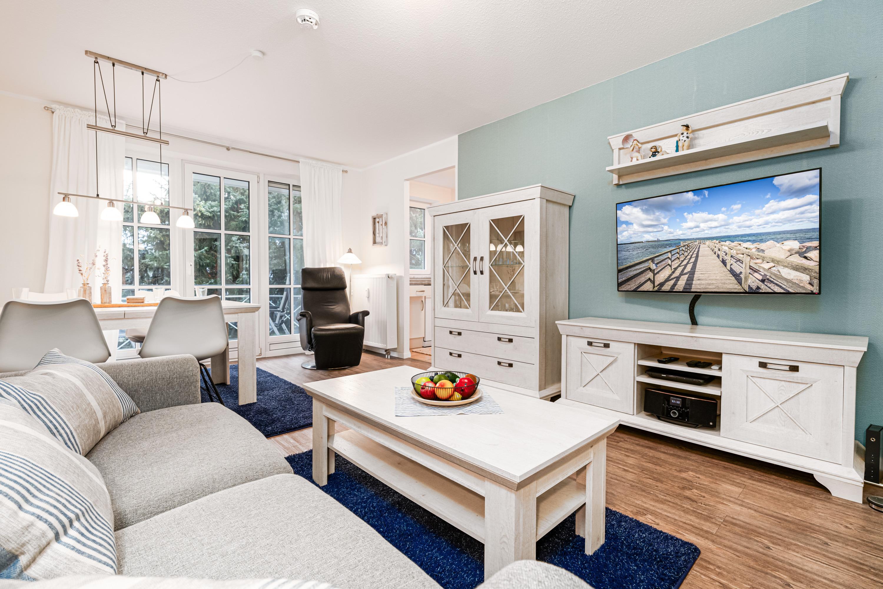 Das Wohnzimmer ist mit einer gemütlichen Schlafcouch mit Digital-TV, DVD-Player und HiFi-Anlage sowie einem Essbereich ausgestattet.