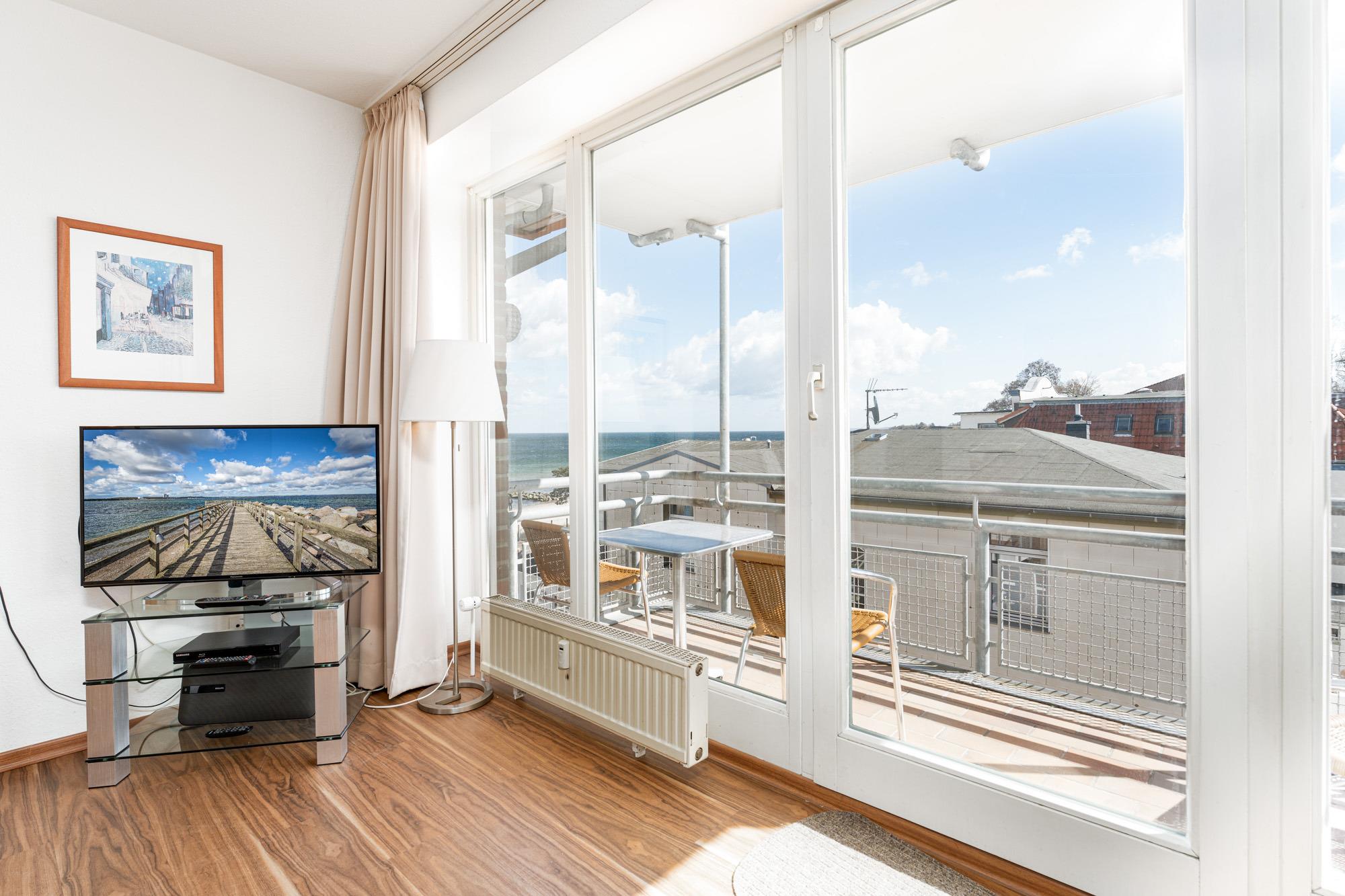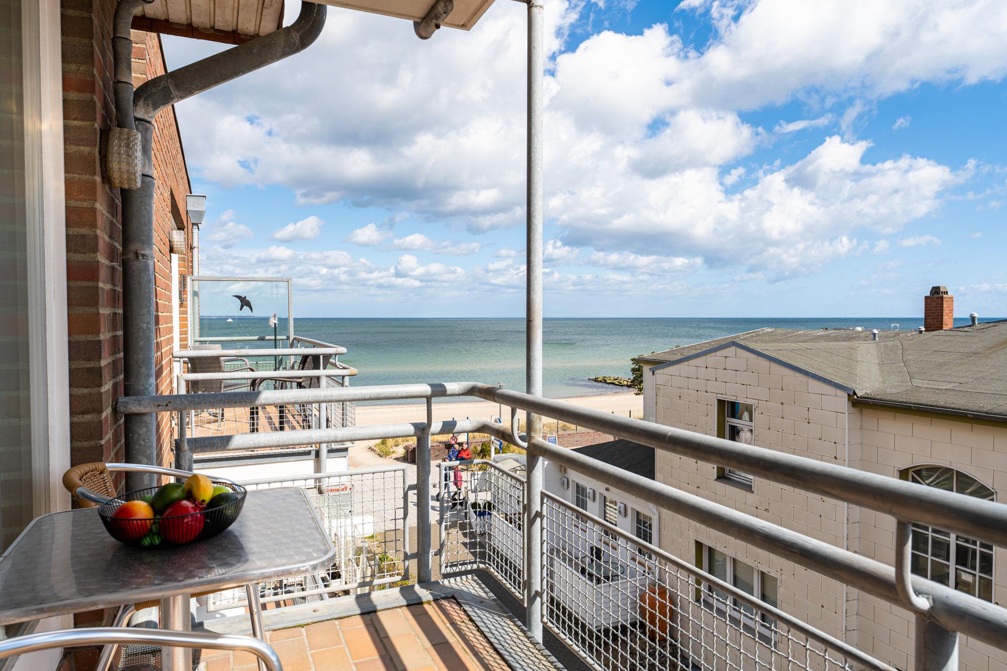Hier haben Sie auch Zutritt auf dem nach Osten ausgerichteten Balkon, der Ihnen sogar seitlichen Meerblick auf die Lübecker Bucht der Ostsee bietet.