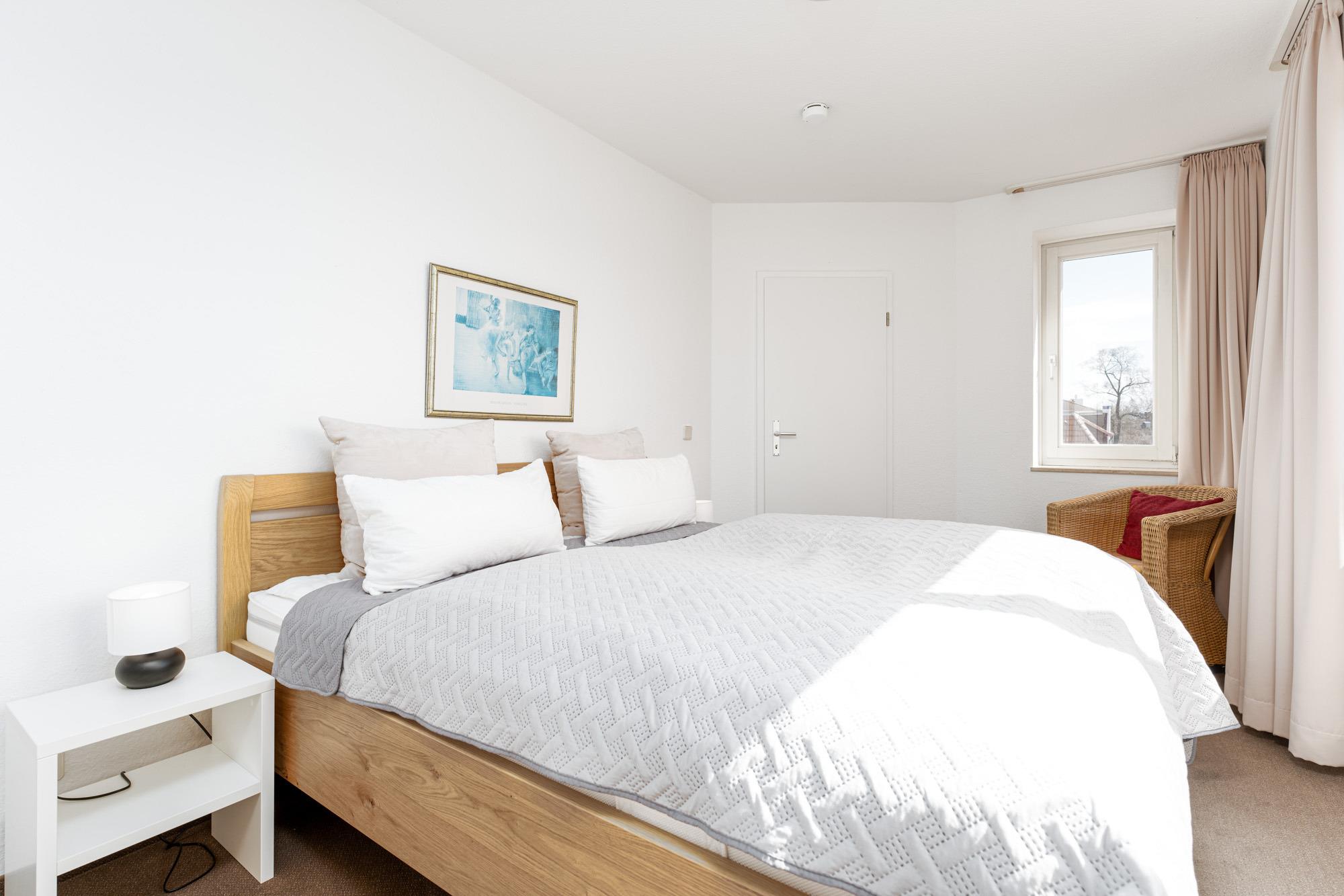 Das lichtdurchflutete, separate Schlafzimmer ist mit einem komfortablen Doppelbett (2 x 90 cm x 200 cm) und einem Kleiderschrank eingerichtet. Hier können Sie die mitgebrachte Urlaubskleidung problemfrei unterbringen.