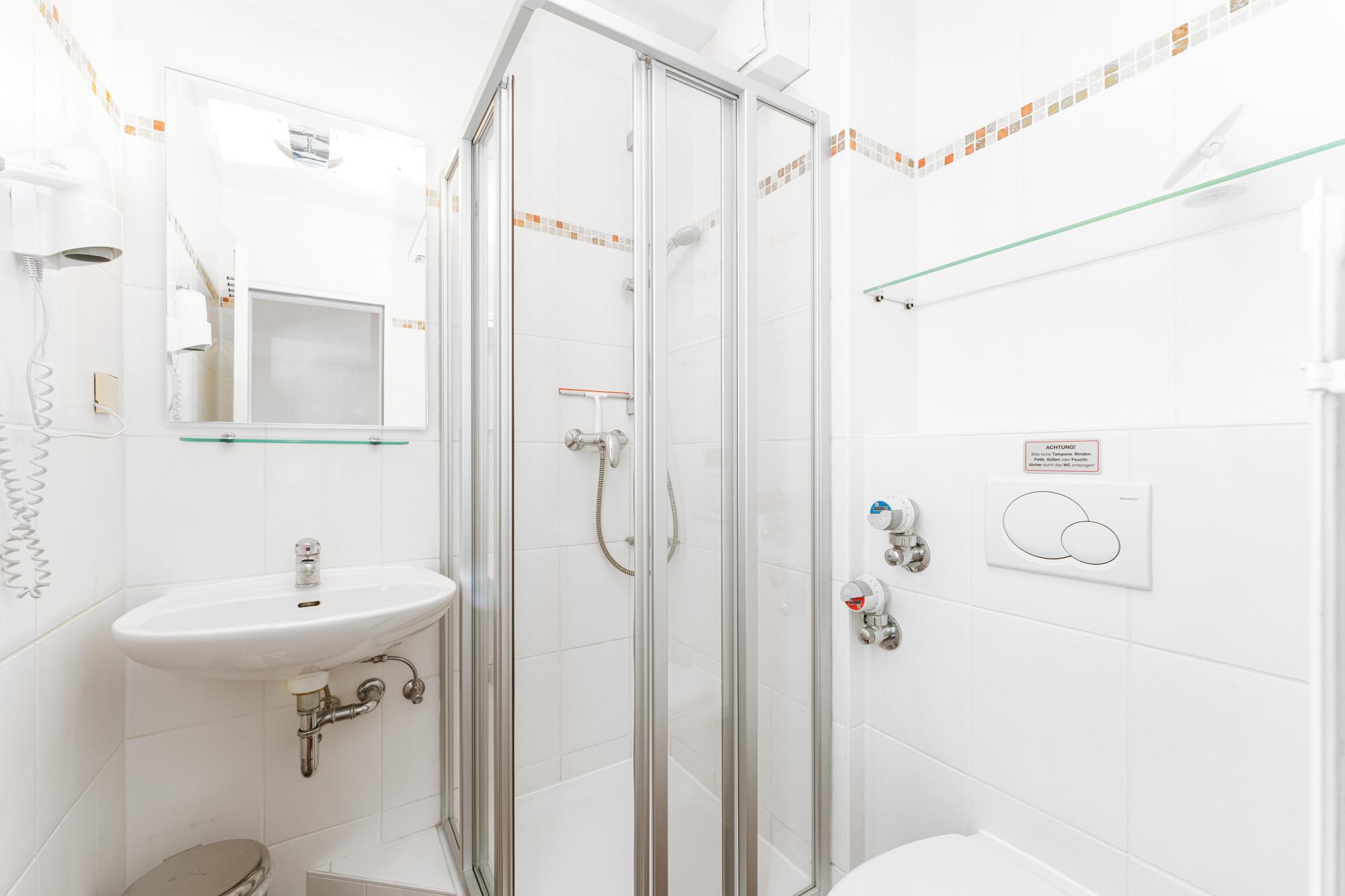 Das hell geflieste Badezimmer ist mit einer Dusche, WC und einem Fön ausgestattet.