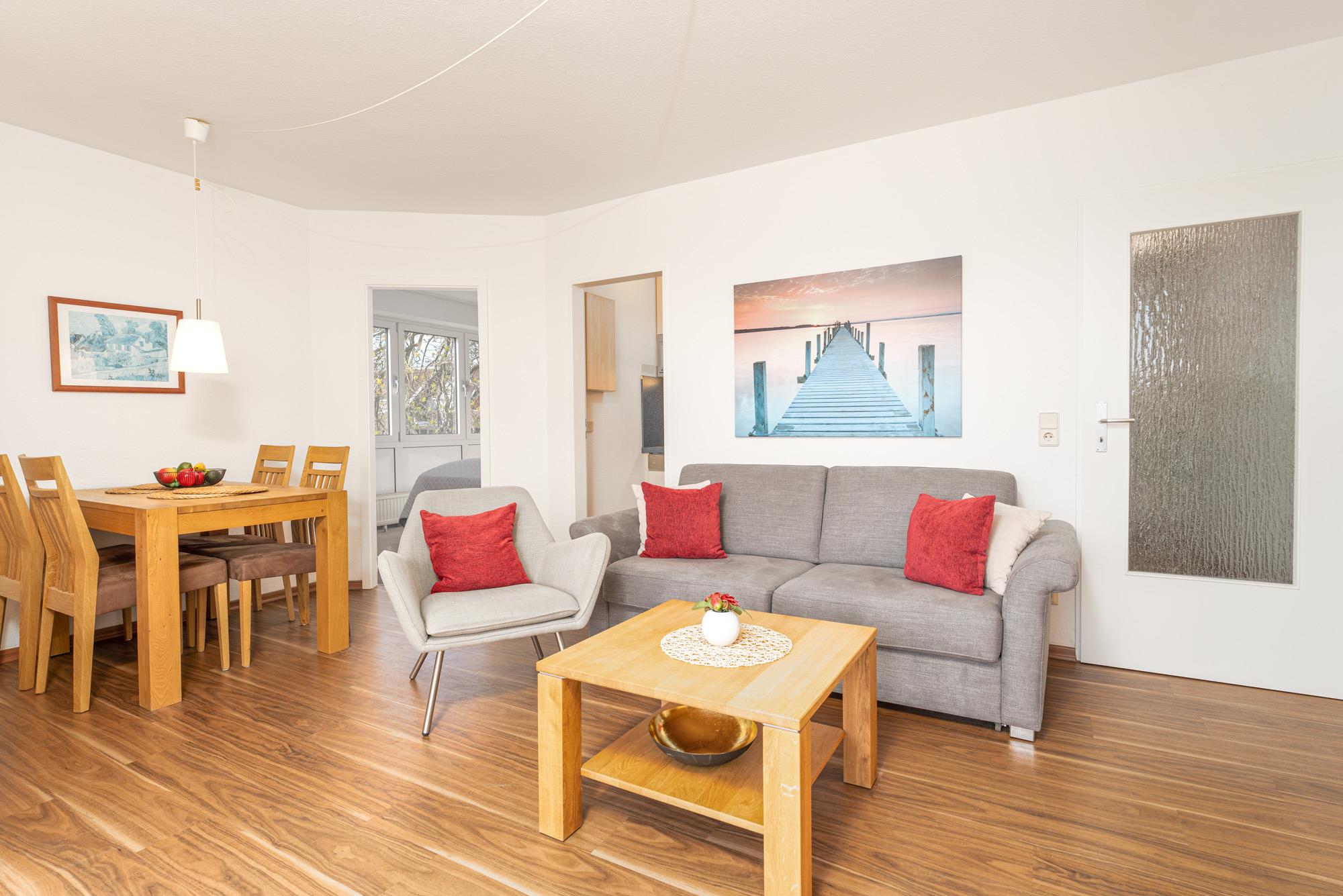 Auf 45m² erwartet Sie eine gemütlich eingerichtete 2-Zimmer Niendorf Ferienwohnung für bis zu 4 Personen im 2. OG, die mit dem im Haus befindlichen Fahrstuhl erreichbar ist.