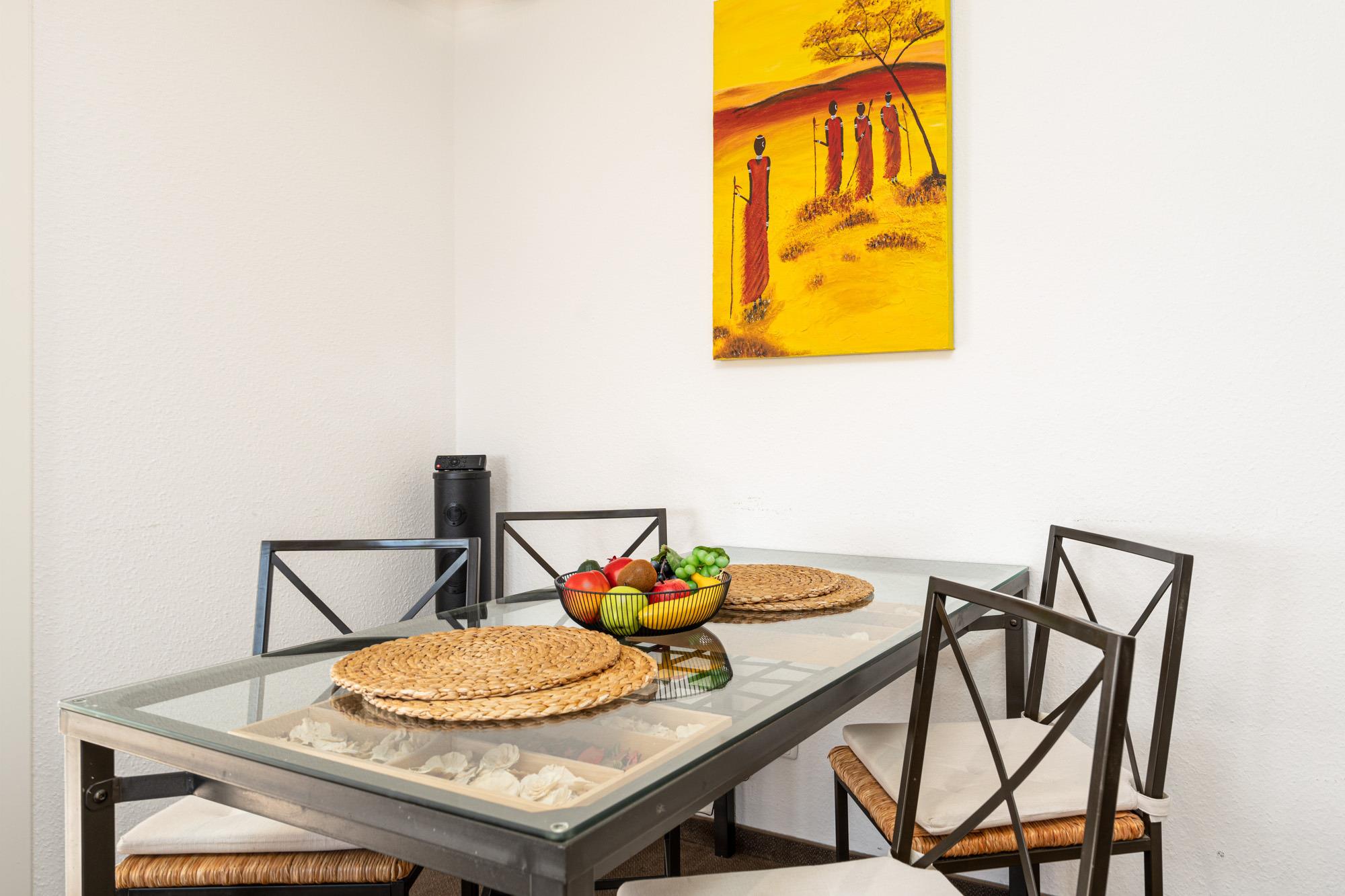 Von hier aus gelangen Sie in das Wohnzimmer, das mit einer bequemen Sitzecke mit Kabel-TV, Bluetooth-Standlautsprecher und einem Essbereich eingerichtet ist.