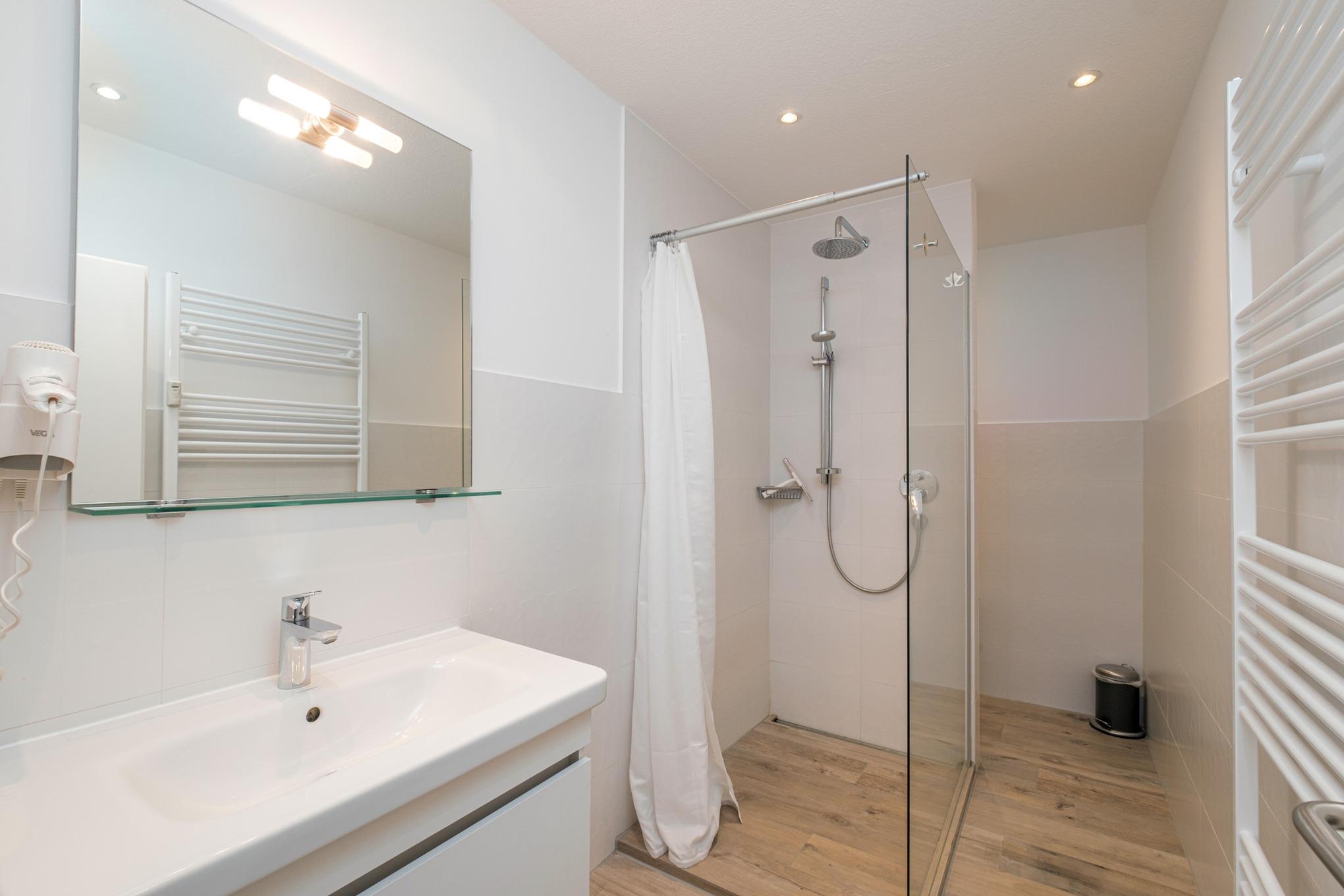 In dem modernen Badezimmer finden Sie eine Glasregendusche, WC, Fön, einen Kosmetikspiegel sowie einen Handtuchwärmer vor.