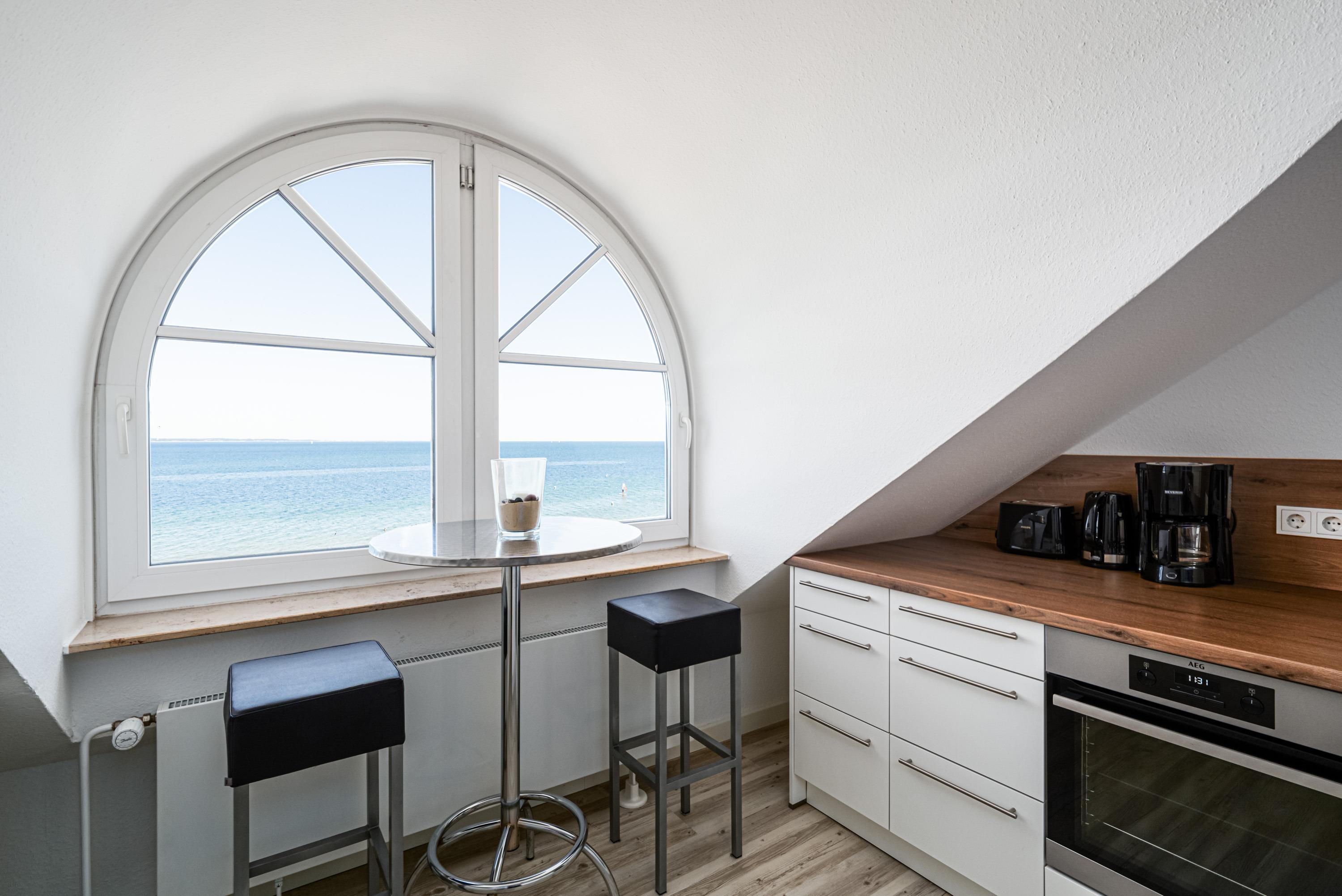Die Küche verfügt über einen zentralen Herd mit großer Arbeitsplatte im Barstil mit Barhockern sowie Geschirrspüler und Mikrowelle. Der Stehtisch mit Hockern am Fenster bietet einen einmaligen Ausblick auf das Meer.