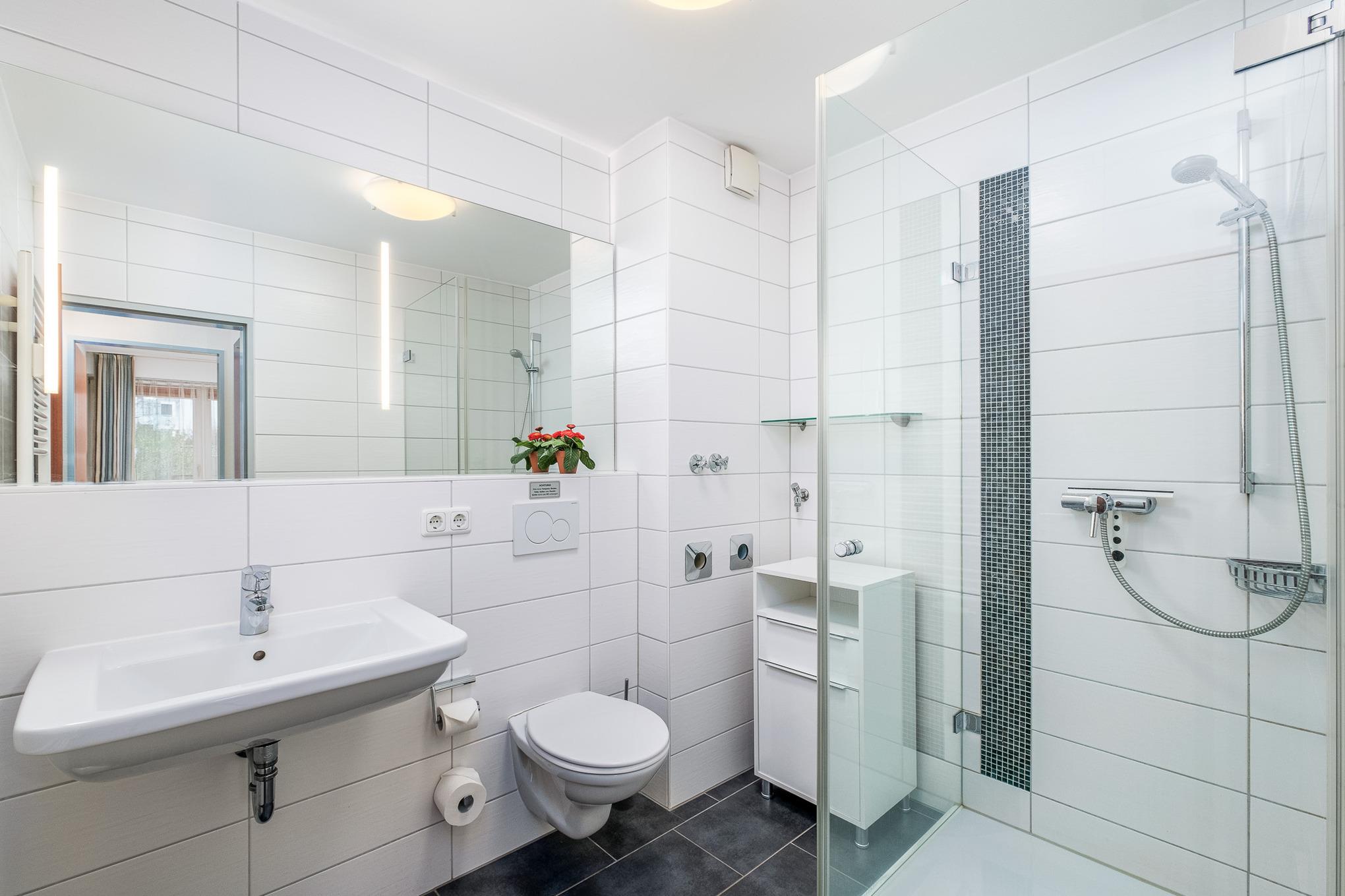 Im separaten Schlafzimmer befindet sich zusätzlich zum Doppelbett (2 x 90cm x 200cm H2 und H3 Wendematratzen) auch ein kostenfreies Kinderreisebett. Das moderne Duschbad ist mit einer Handtuchtrocknerheizung und einem Fön ausgestattet.