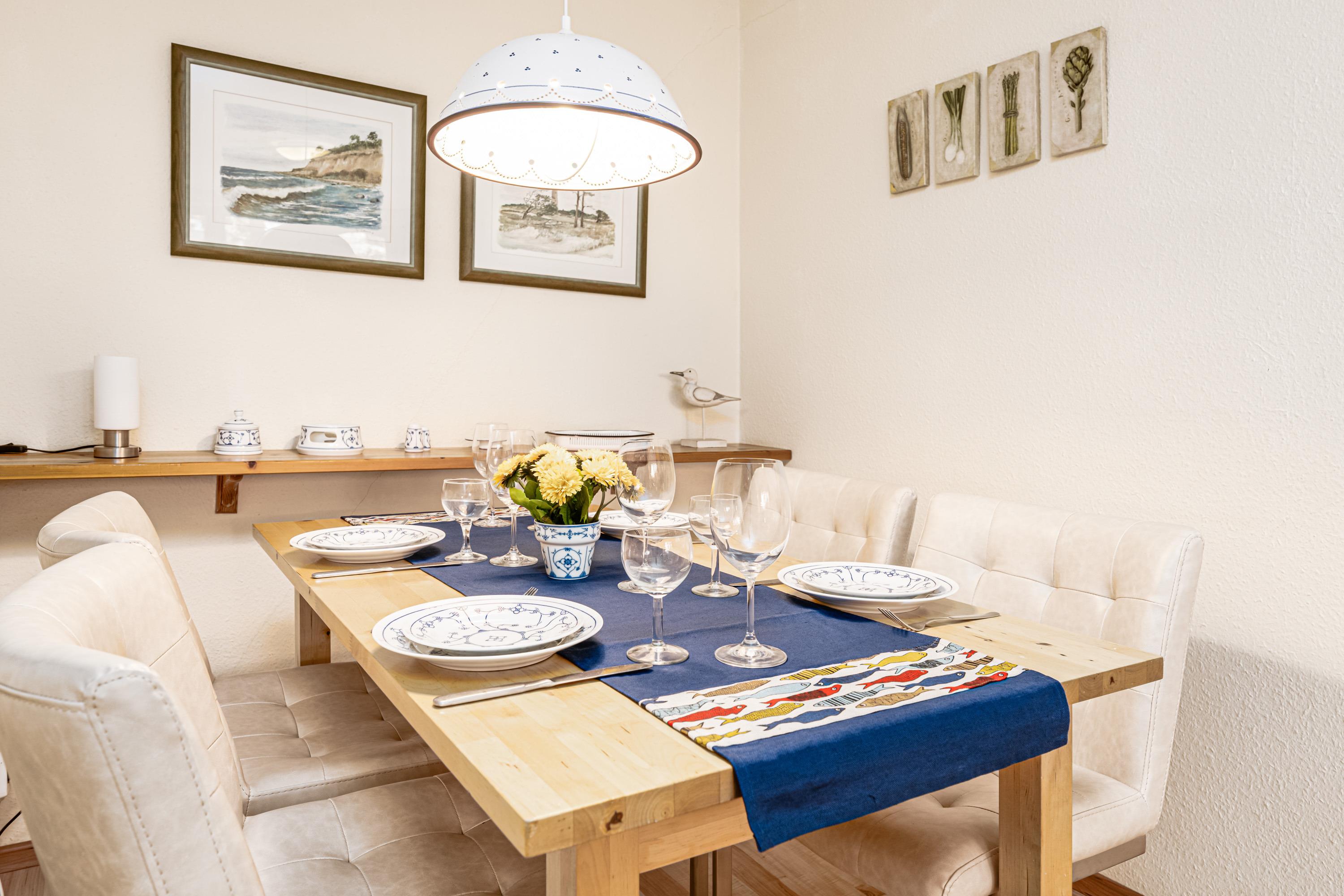 Die Einbauküche ist mit einem Geschirrspüler, Mikrowelle und einer Essecke ausgestattet.