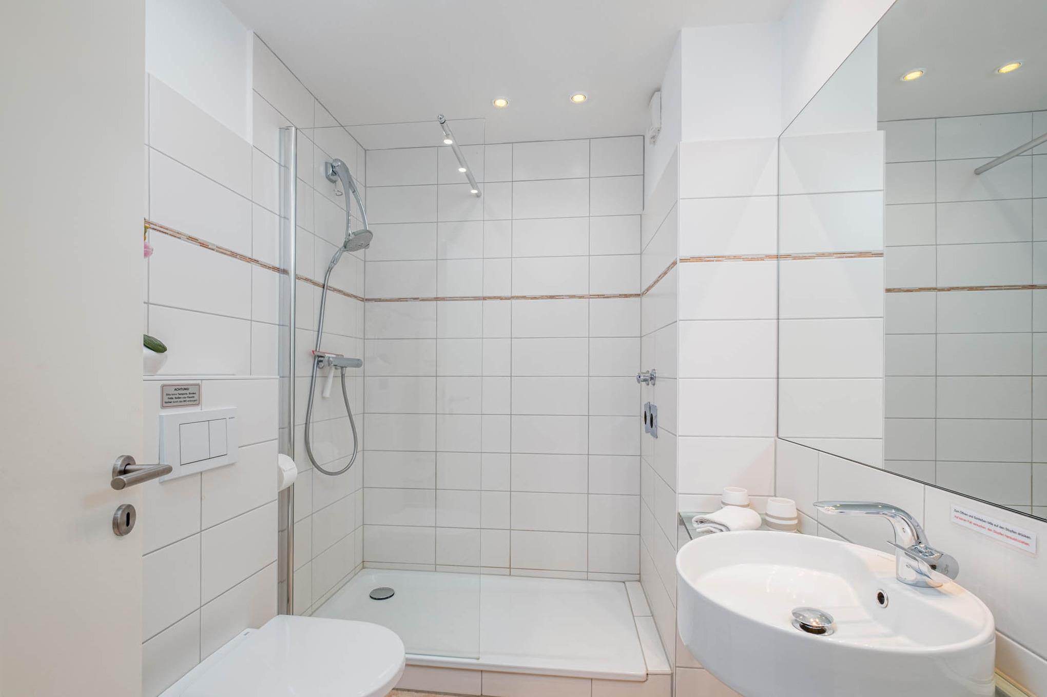 Das helle und moderne Badezimmer ist mit einer Dusche, WC und Fön ausgestattet.