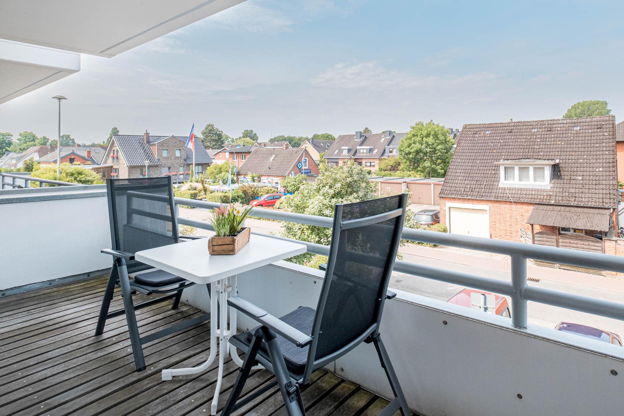 Auf dem halb überdachten, nach Westen ausgerichteten Balkon lassen sich entspannte Stunden verbringen.